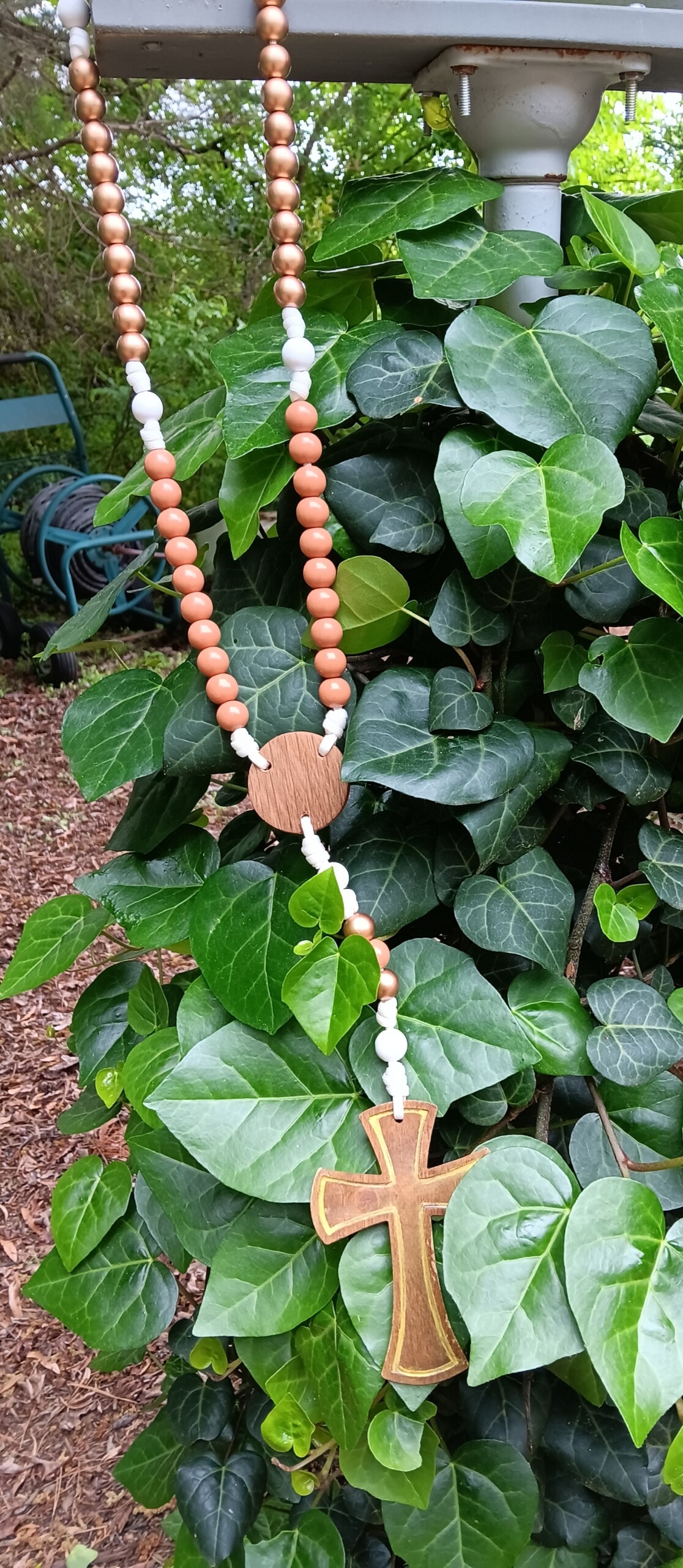 (0031)This rosary is very simple, durable and lightweight. All of the beads are made from 16mm wooden beads. The cord I used is a white paracord. The centerpiece for this rosary was made from reclaimed wood. The cross is wooden stained and hand painted