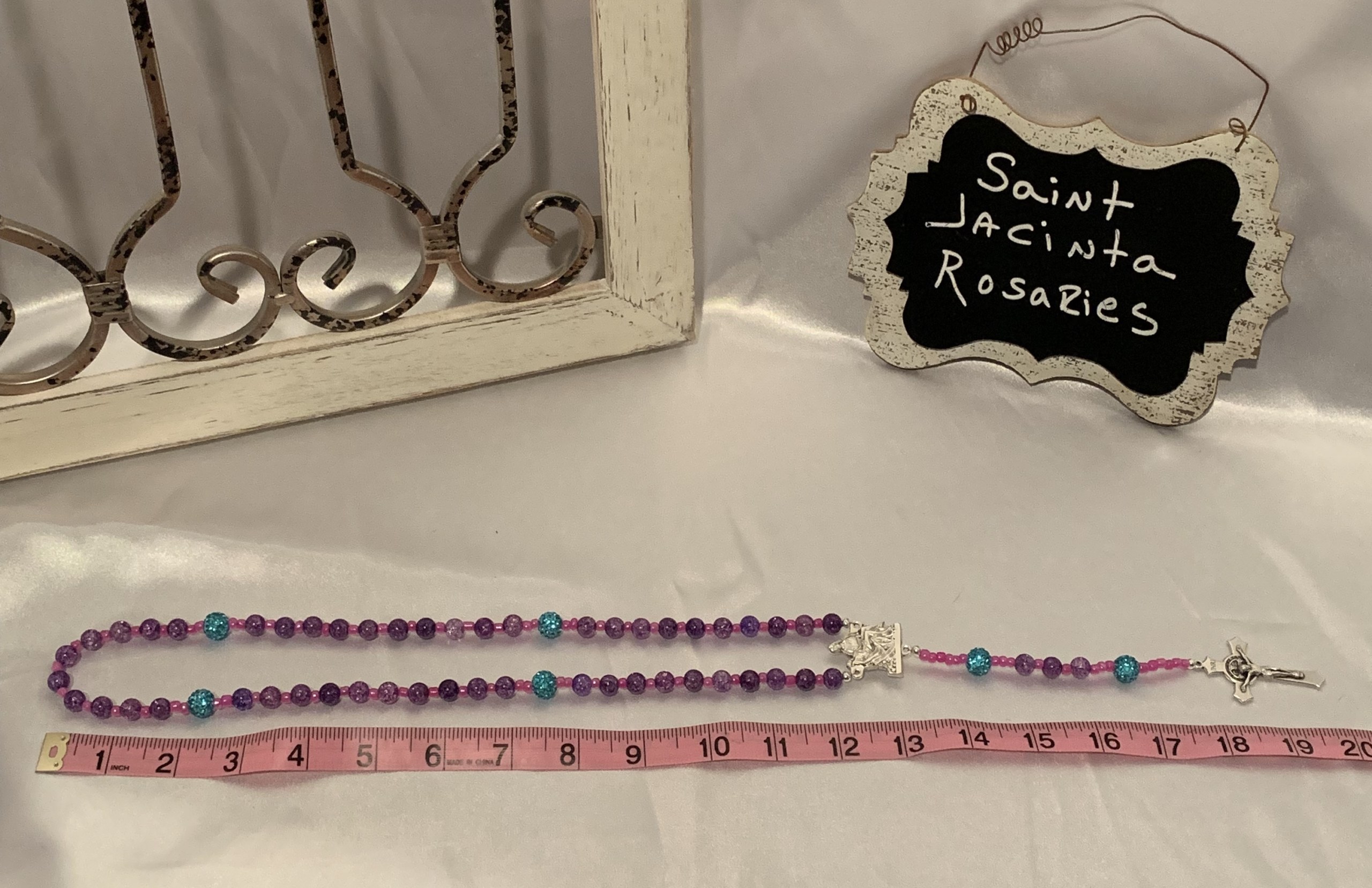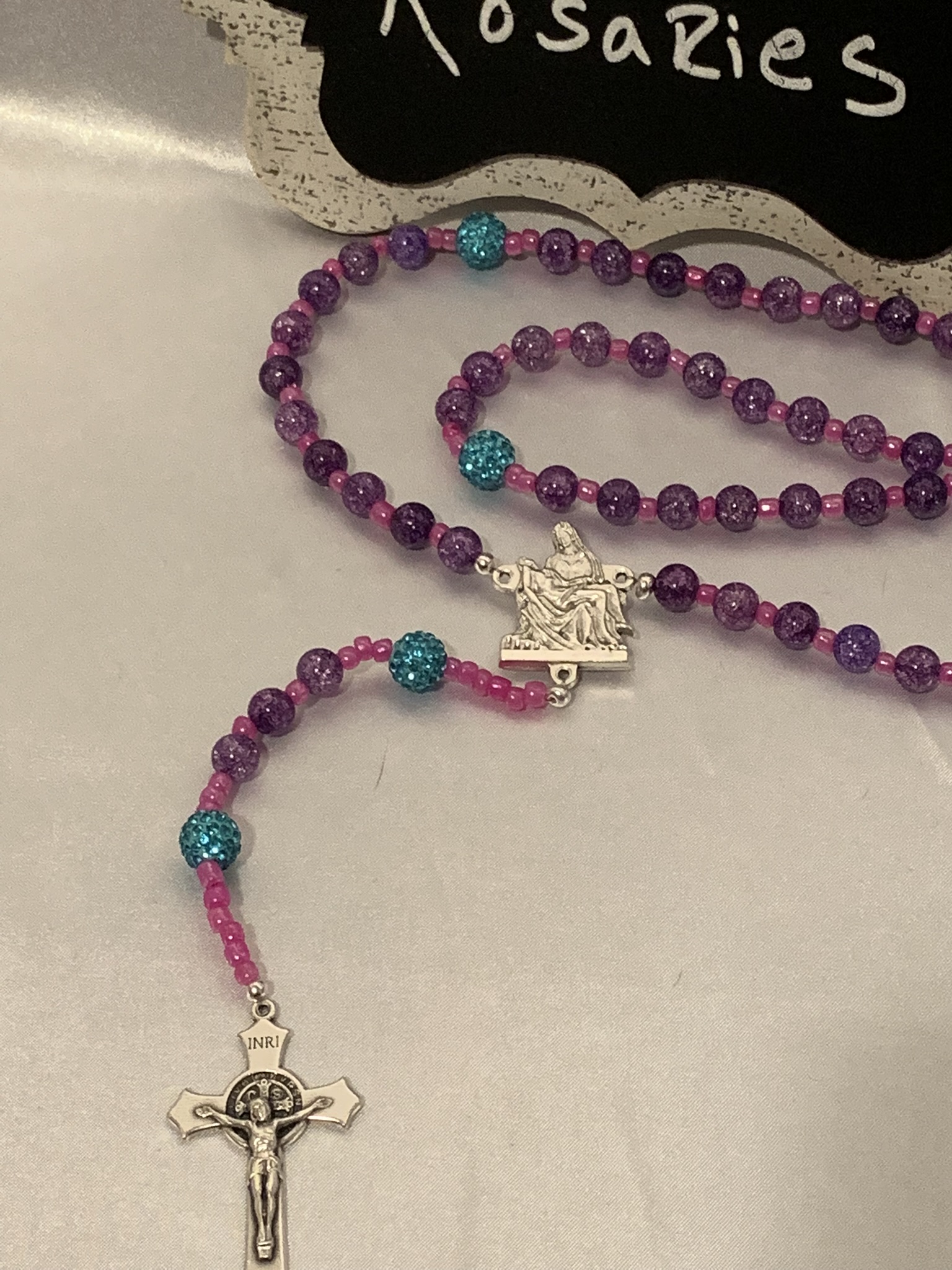 Beautiful handmade, one of a kind glass and stone bead rosary. The rosary center is a depiction of La Pieta. Handmade with love and prayer in Wyoming. I use heavy duty jewelry wire to ensure rosary is very durable.