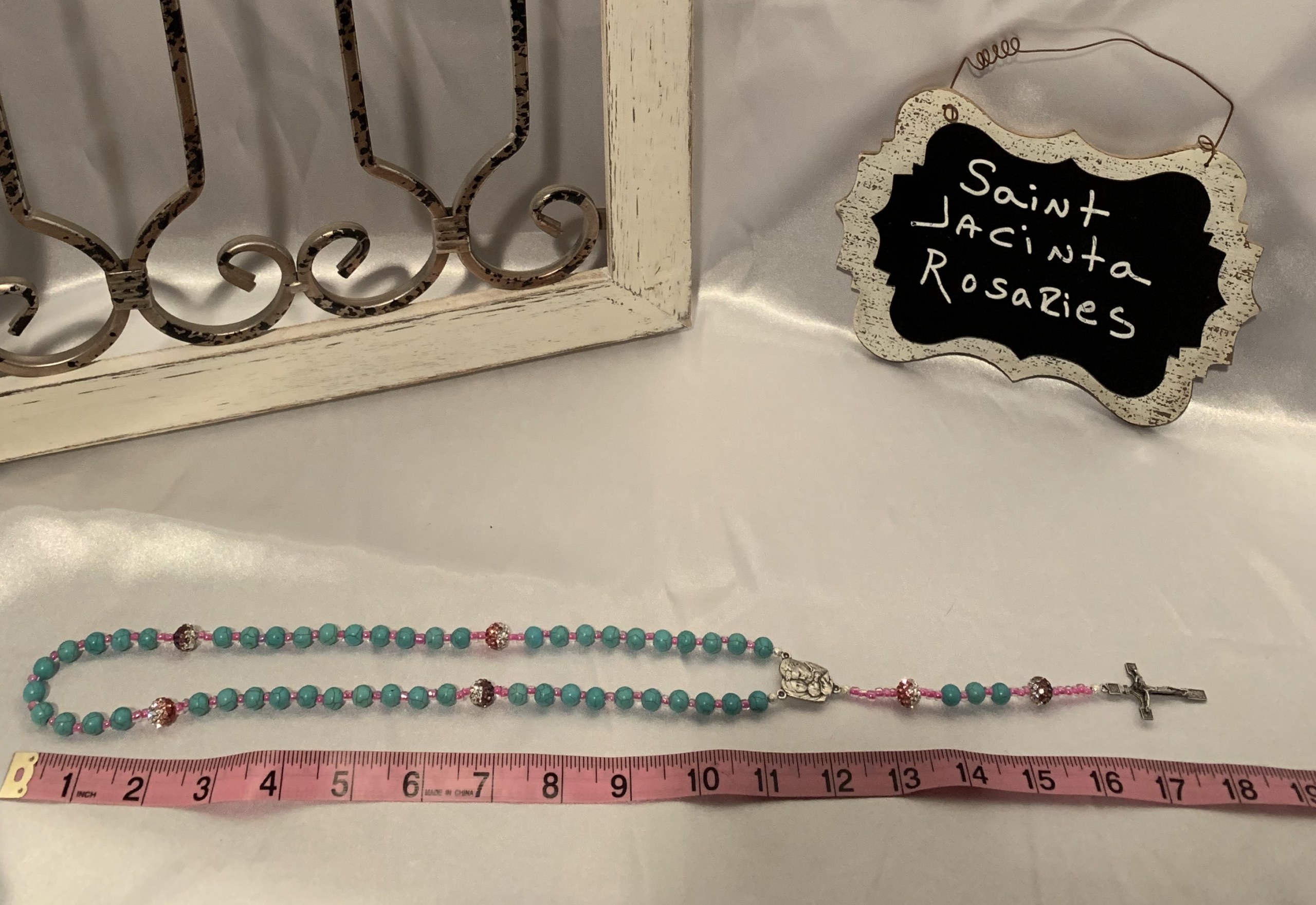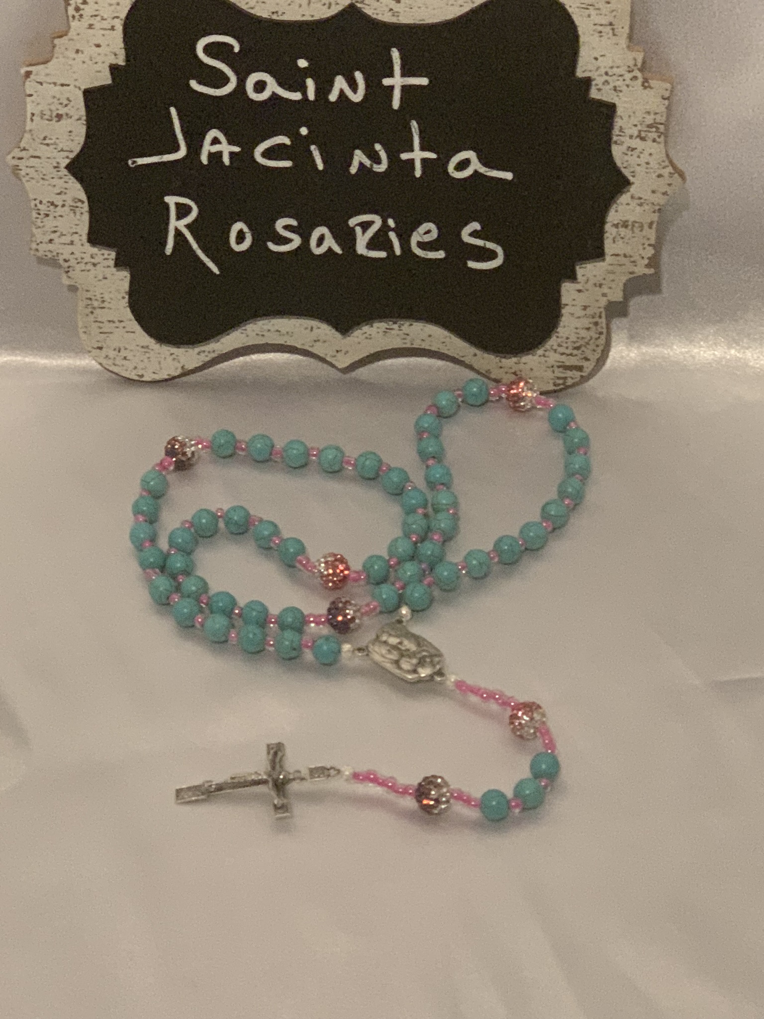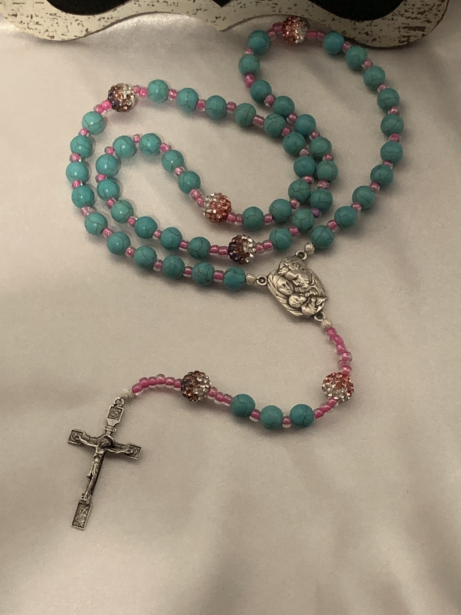 Beautiful handmade, one of a kind stone and glass bead rosary. The rosary center is a depiction of La Pieta. Handmade with love and prayer in Wyoming. I use heavy duty jewelry wire to ensure rosary is very durable.