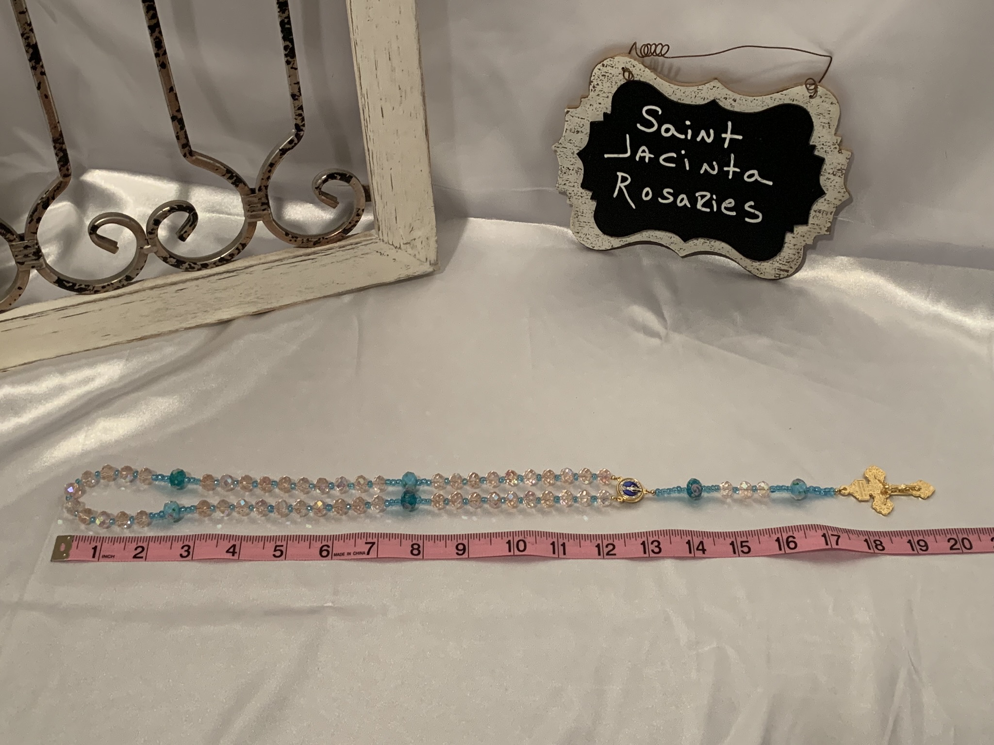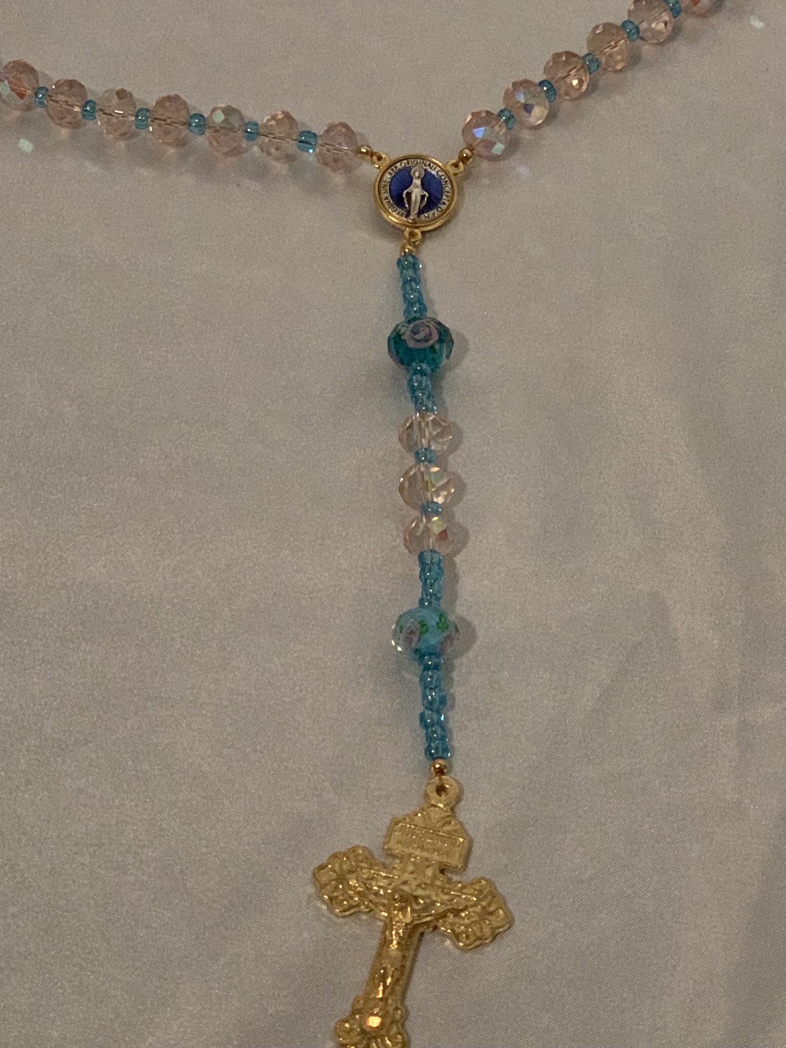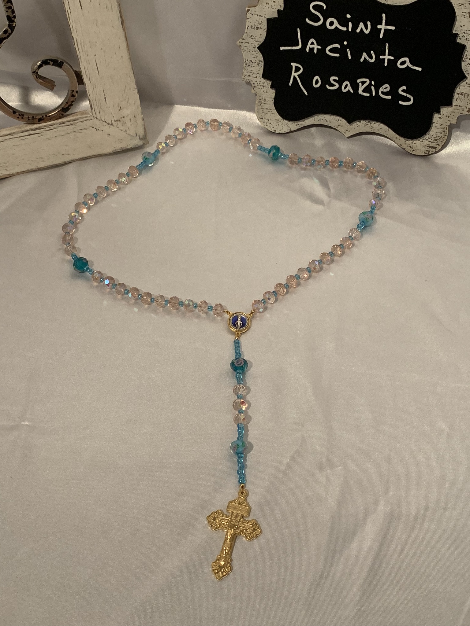 Beautiful handmade, one of a kind crystal and glass bead rosary. The rosary center is a depiction of the Miraculous Medal. Handmade with love and prayer in Wyoming. I use heavy duty jewelry wire to ensure rosary is very durable.