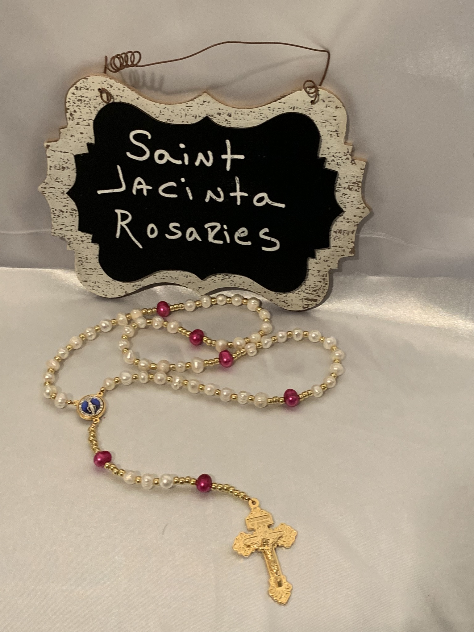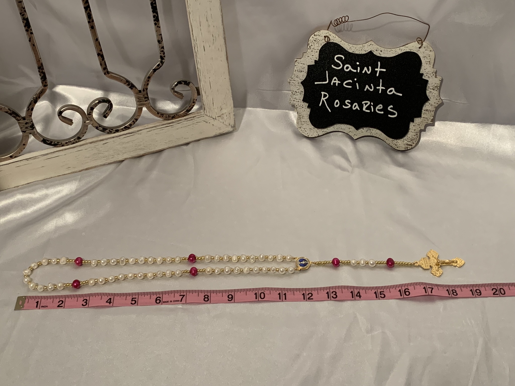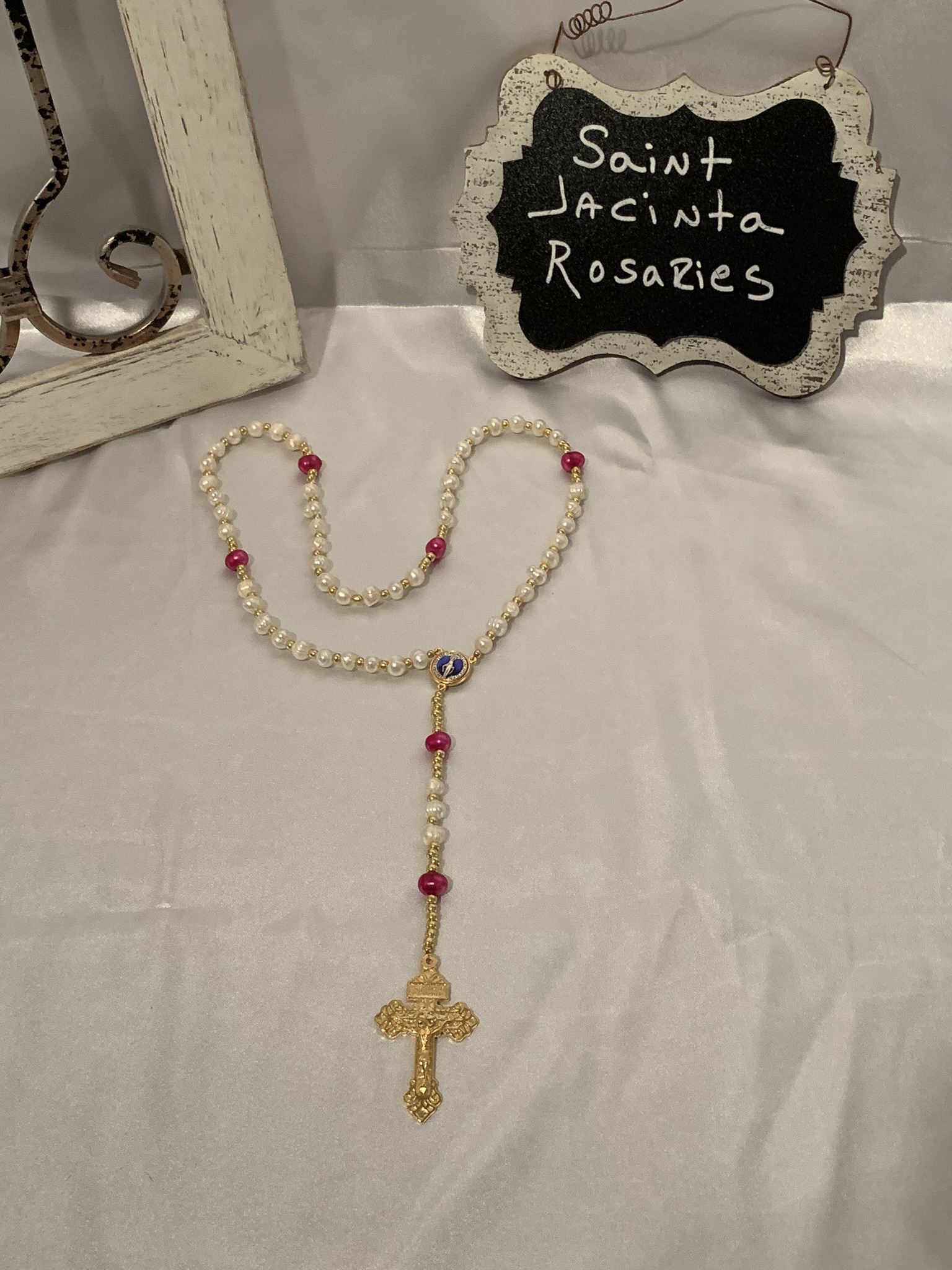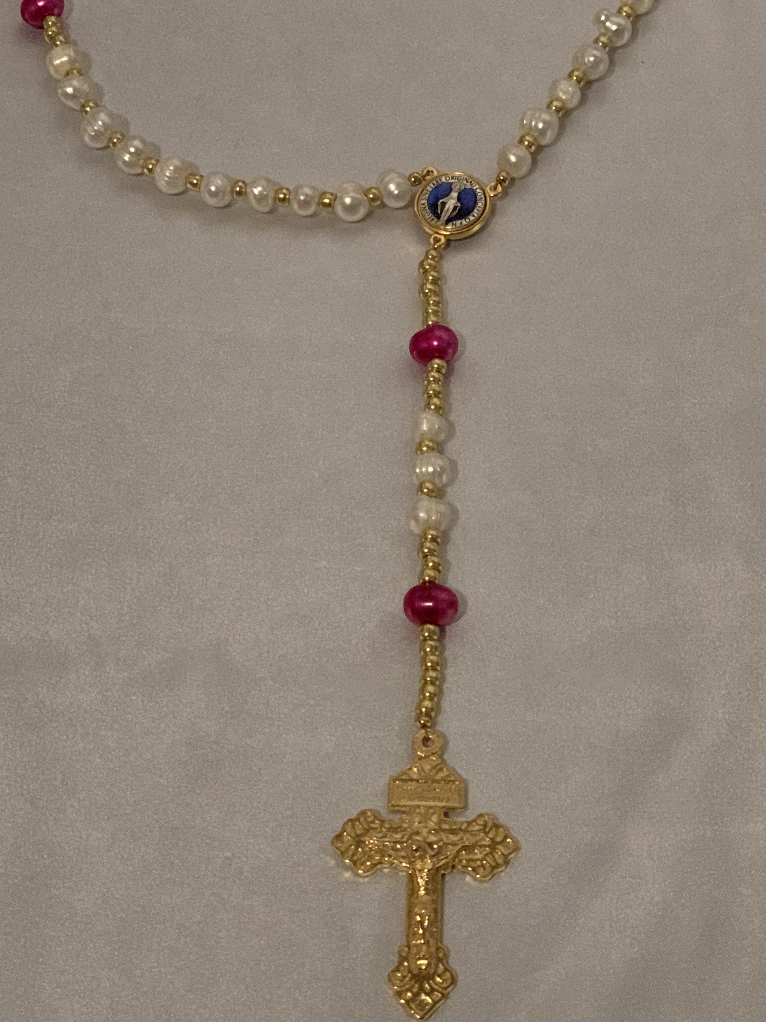 Beautiful handmade, one of a kind fresh water pearl rosary. The rosary center is a depiction of the Miraculous Medal. Handmade with love and prayer in Wyoming. I use heavy duty jewelry wire to ensure rosary is very durable.