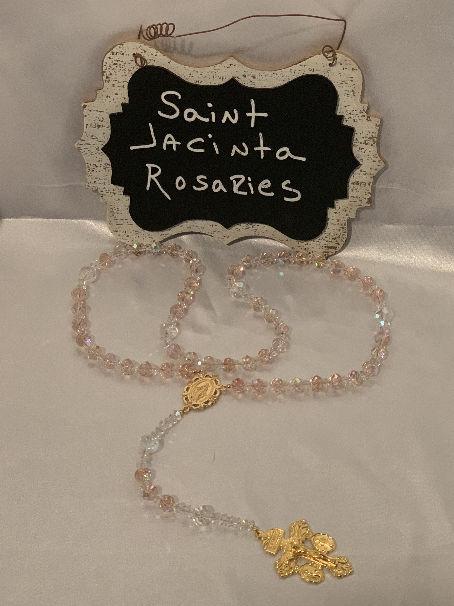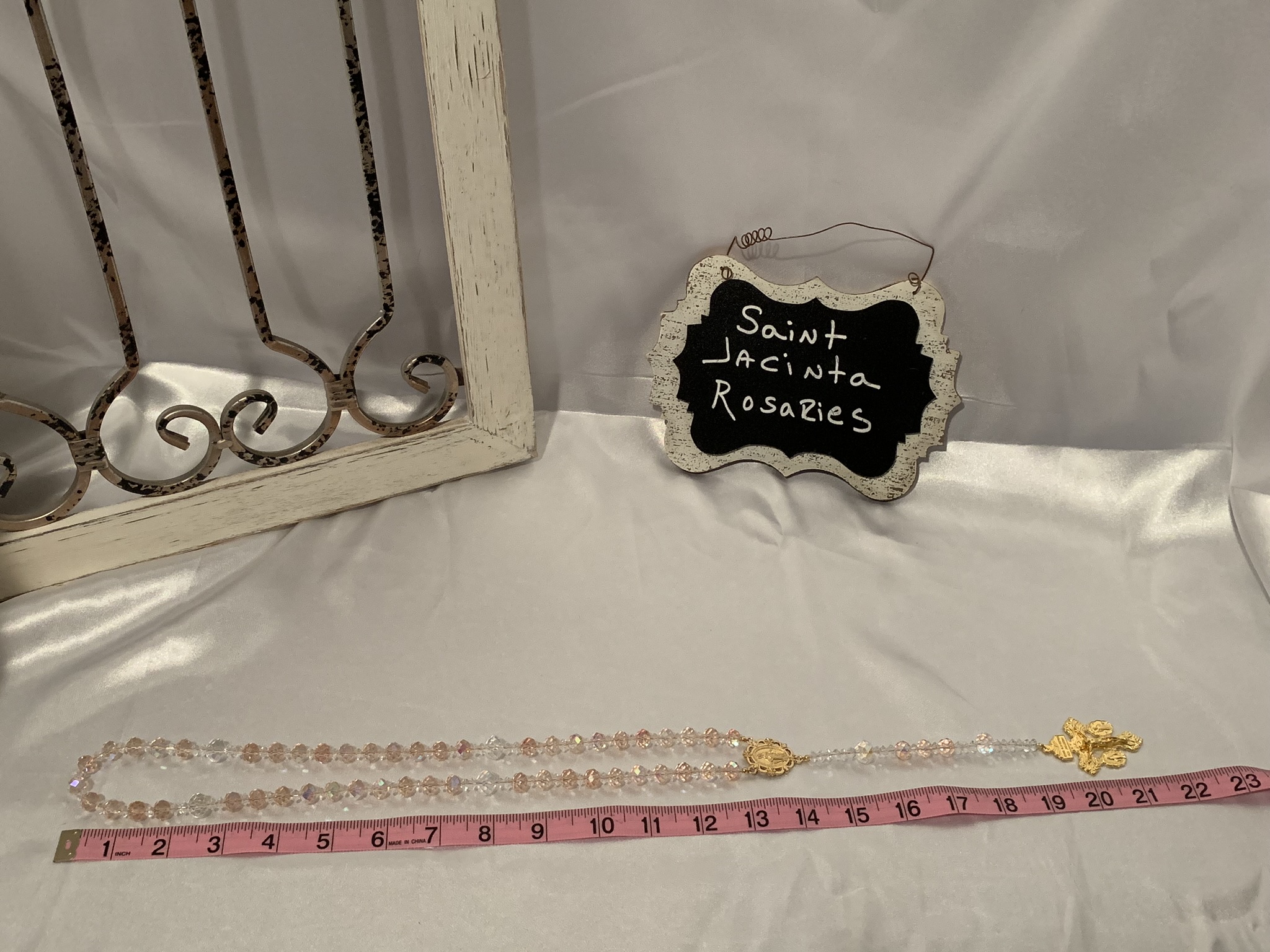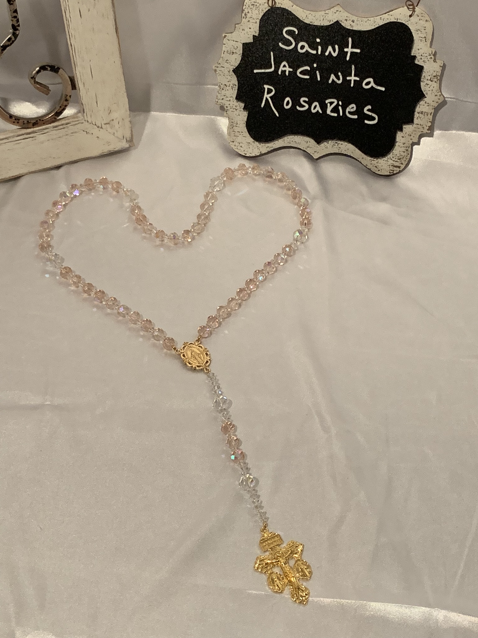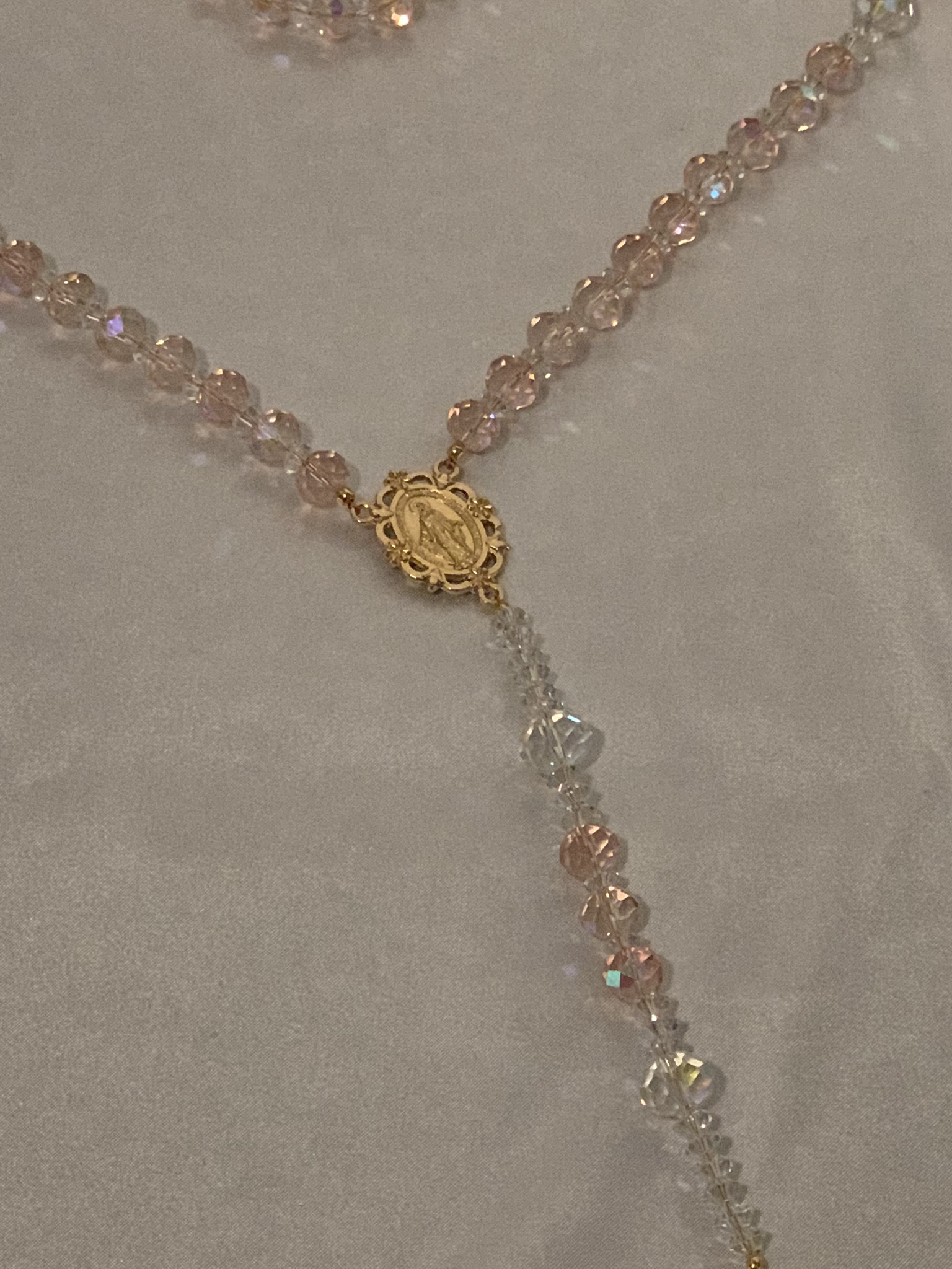 Beautiful handmade, one of a kind crystal bead rosary. The rosary center is a depiction of the Miraculous Medal. Handmade with love and prayer in Wyoming. I use heavy duty jewelry wire to ensure rosary is very durable.