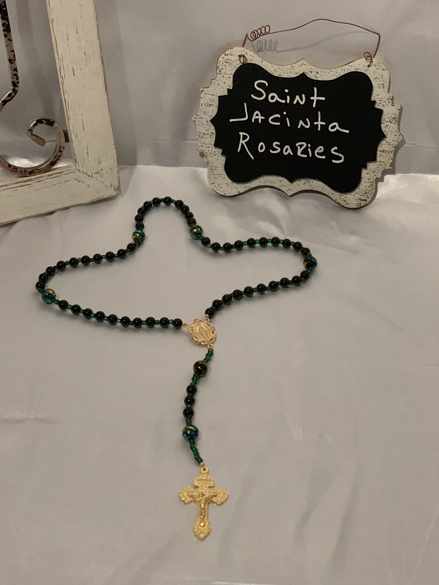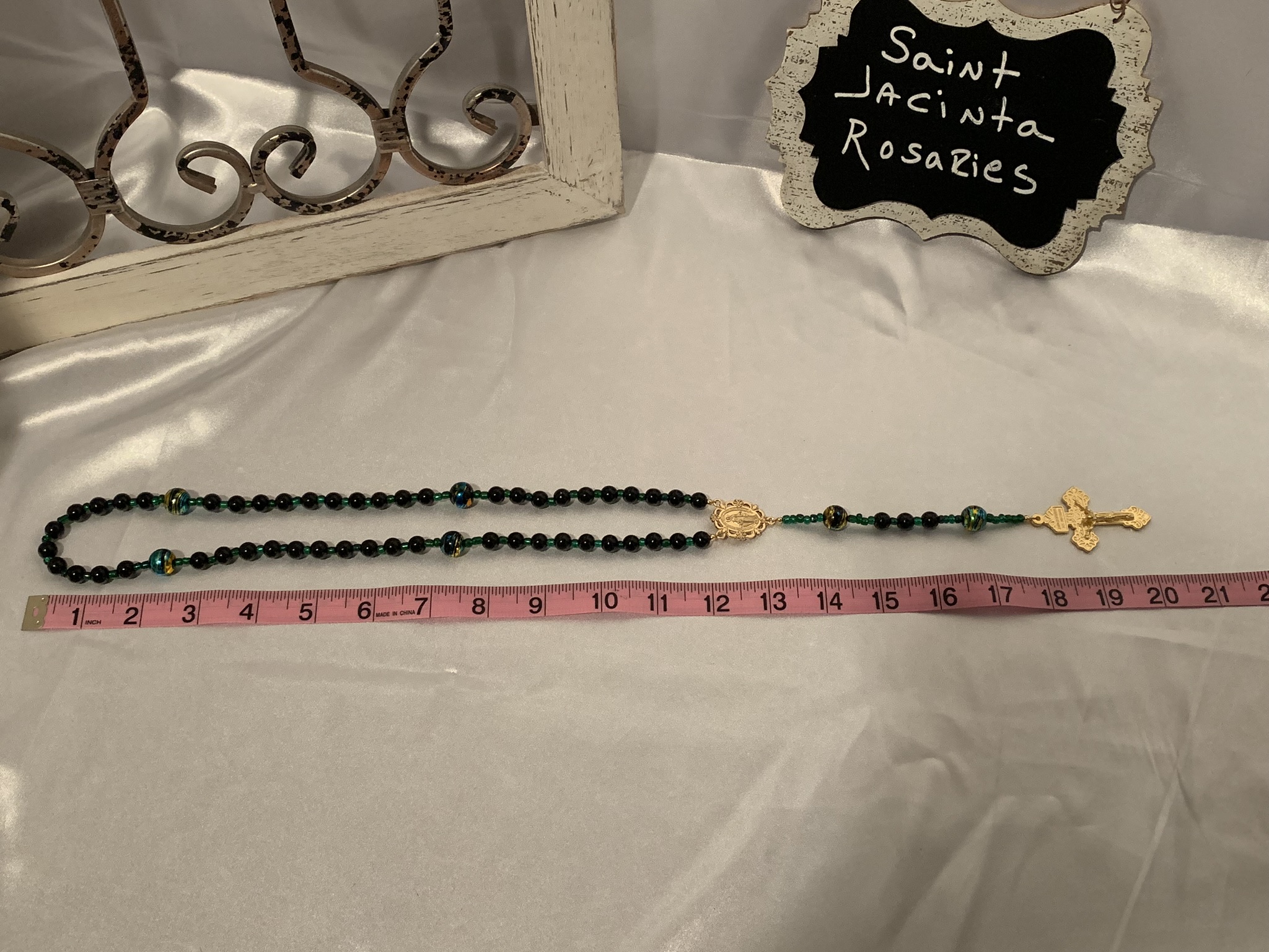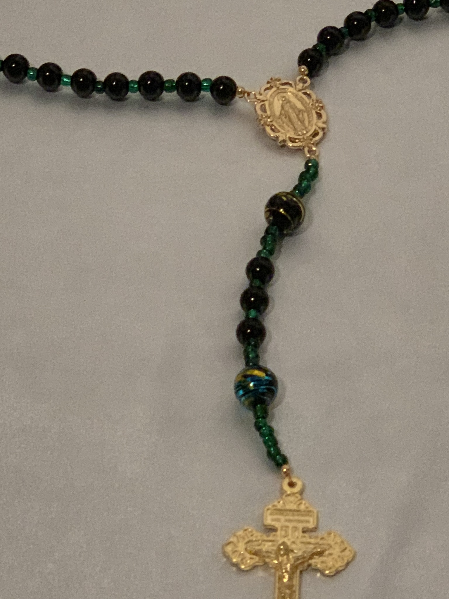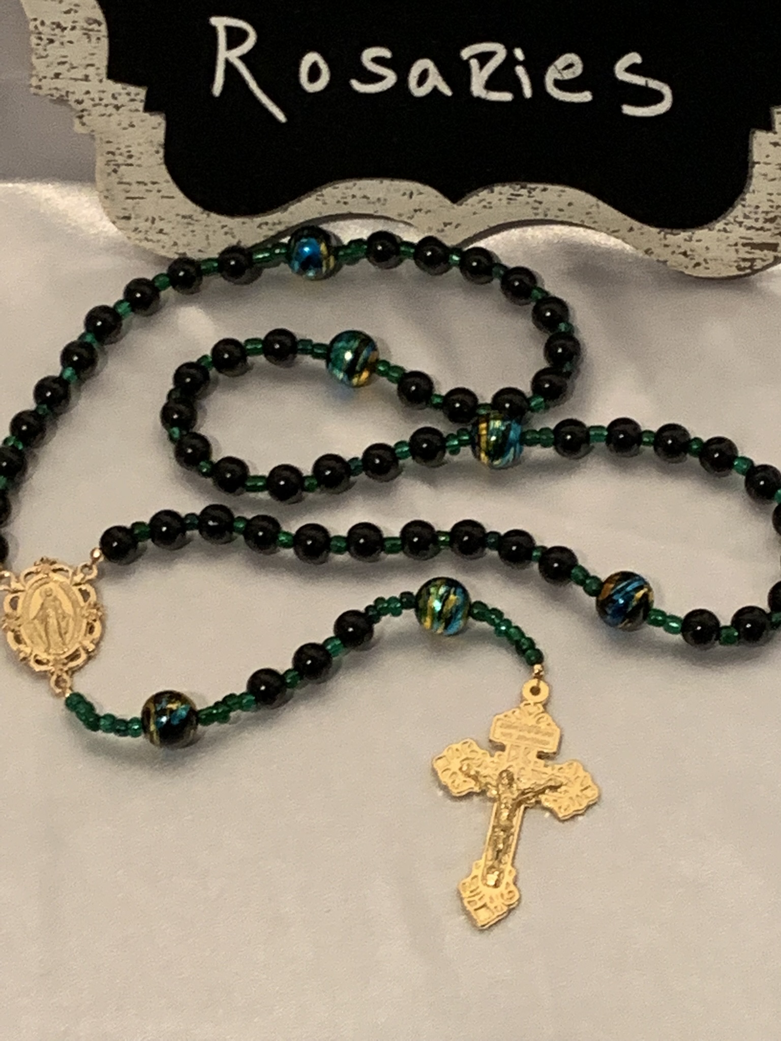 Beautiful handmade, one of a kind glass bead rosary. The rosary center is a depiction of the Miraculous Medal. Handmade with love and prayer in Wyoming. I use heavy duty jewelry wire to ensure rosary is very durable.