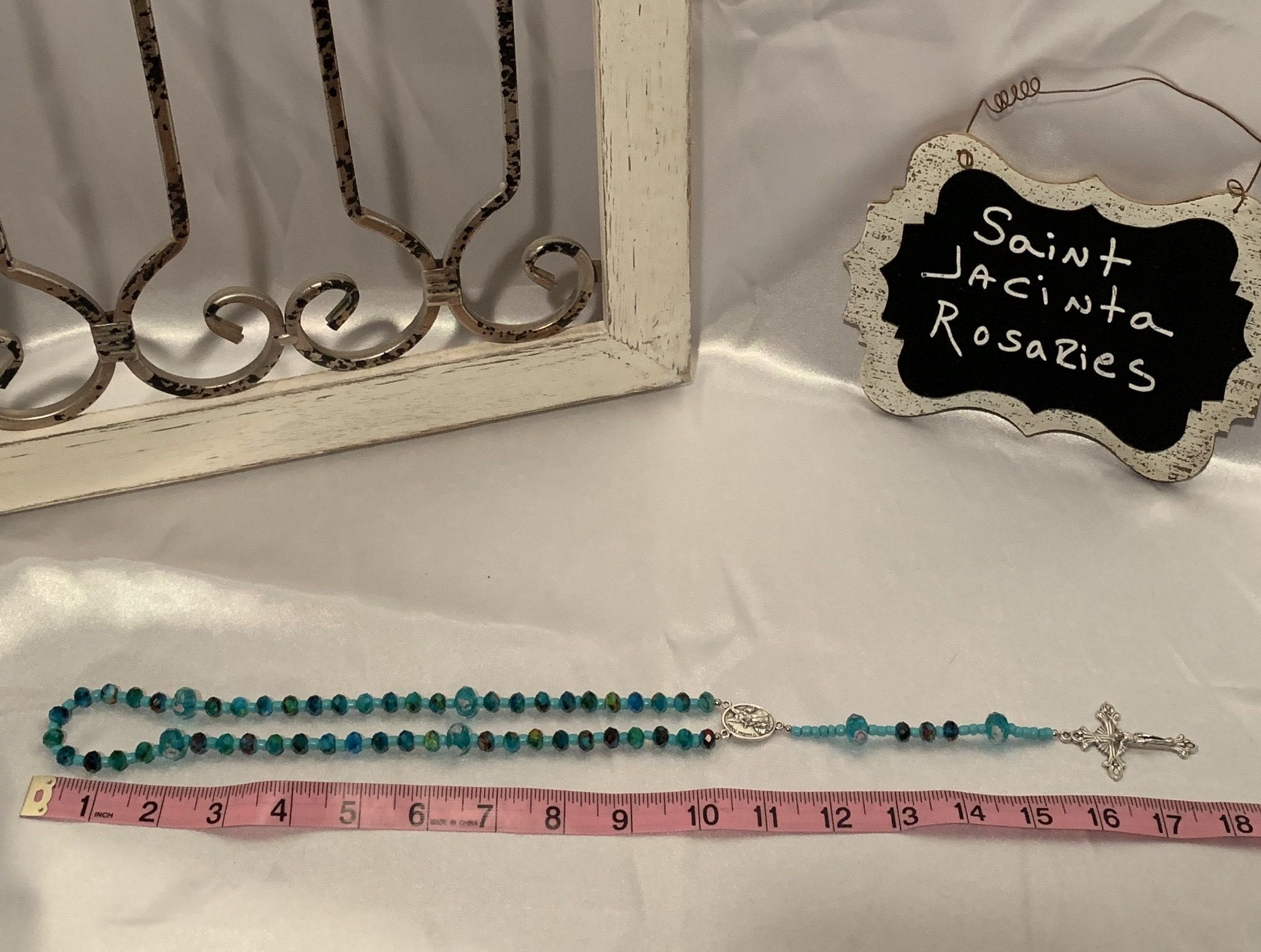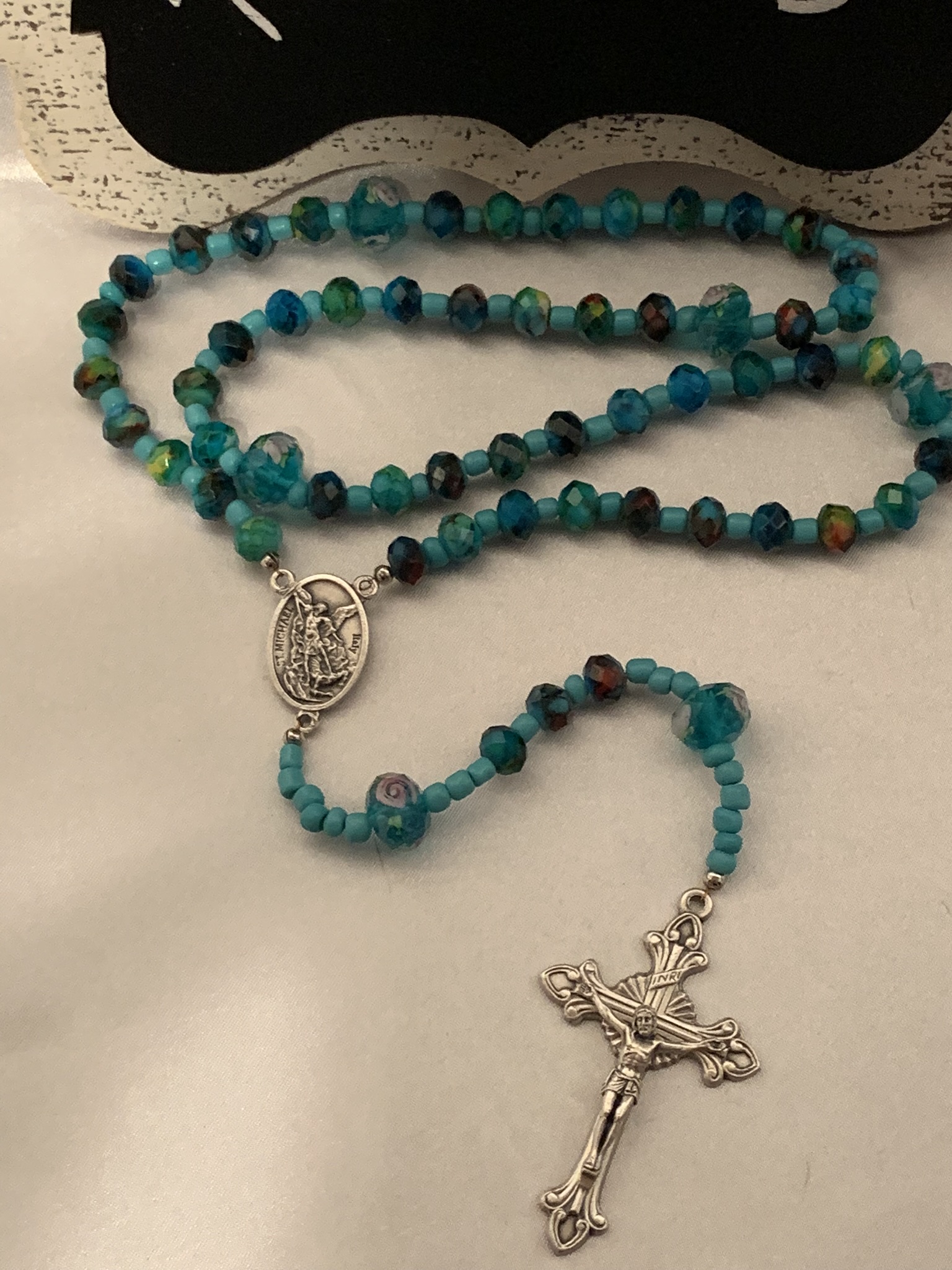 Beautiful handmade, one of a kind glass and stone bead rosary. The rosary center is a depiction of a guardian angel on one side and St. Michael on the other side. Handmade with love and prayer in Wyoming. I use heavy duty jewelry wire to ensure rosary is very durable.