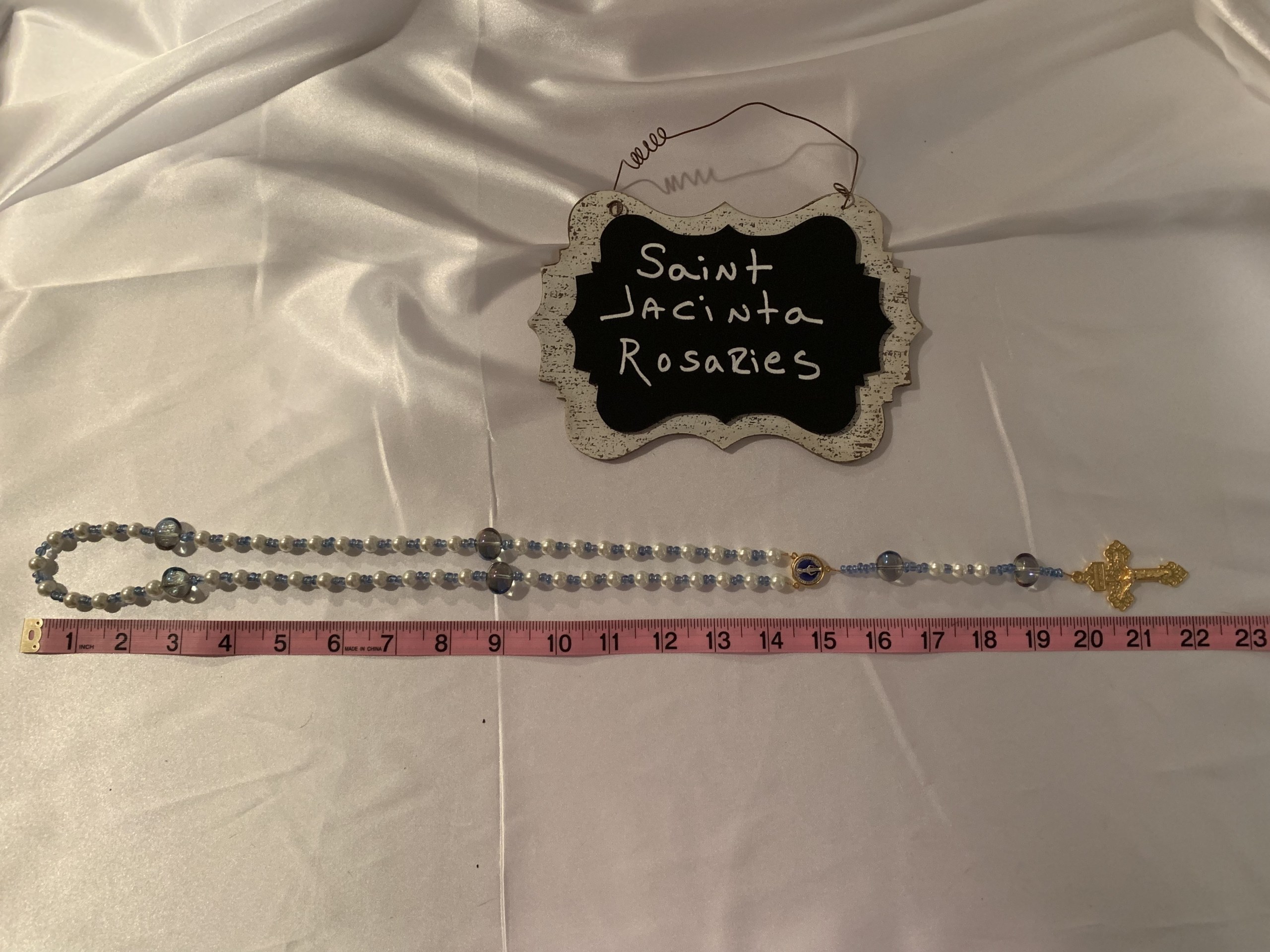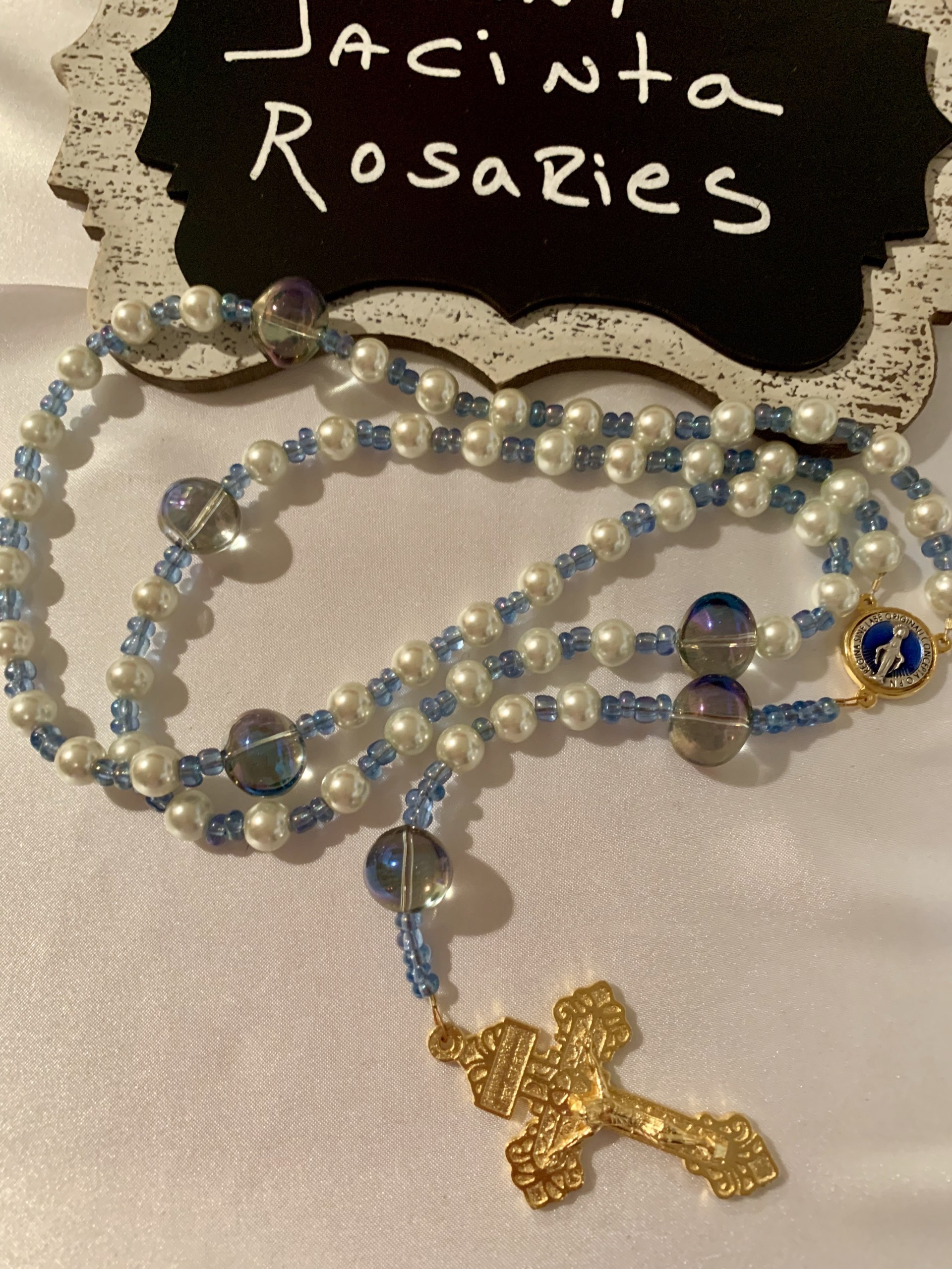 Beautiful handmade, one of a kind glass and plastic pearl bead rosary. Rosary center is Miraculous Medal. Handmade with love and prayer in Casper, Wyoming. I use heavy duty jewelry wire to ensure rosary is very durable.