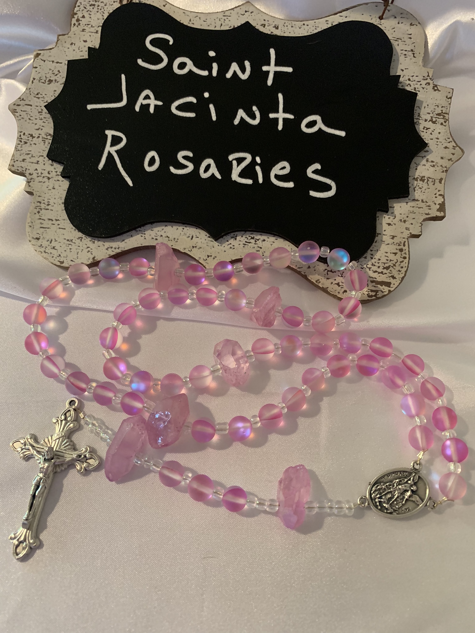 Beautiful handmade, one of a kind moonstone and agate bead rosary. The rosary center is a depiction of Saint Michael on one side and a guardian angel on the other side. Rosary center and Crucifix from Italy. Handmade with love and prayer in Casper, Wyoming. I use heavy duty jewelry wire to ensure rosary is very durable.