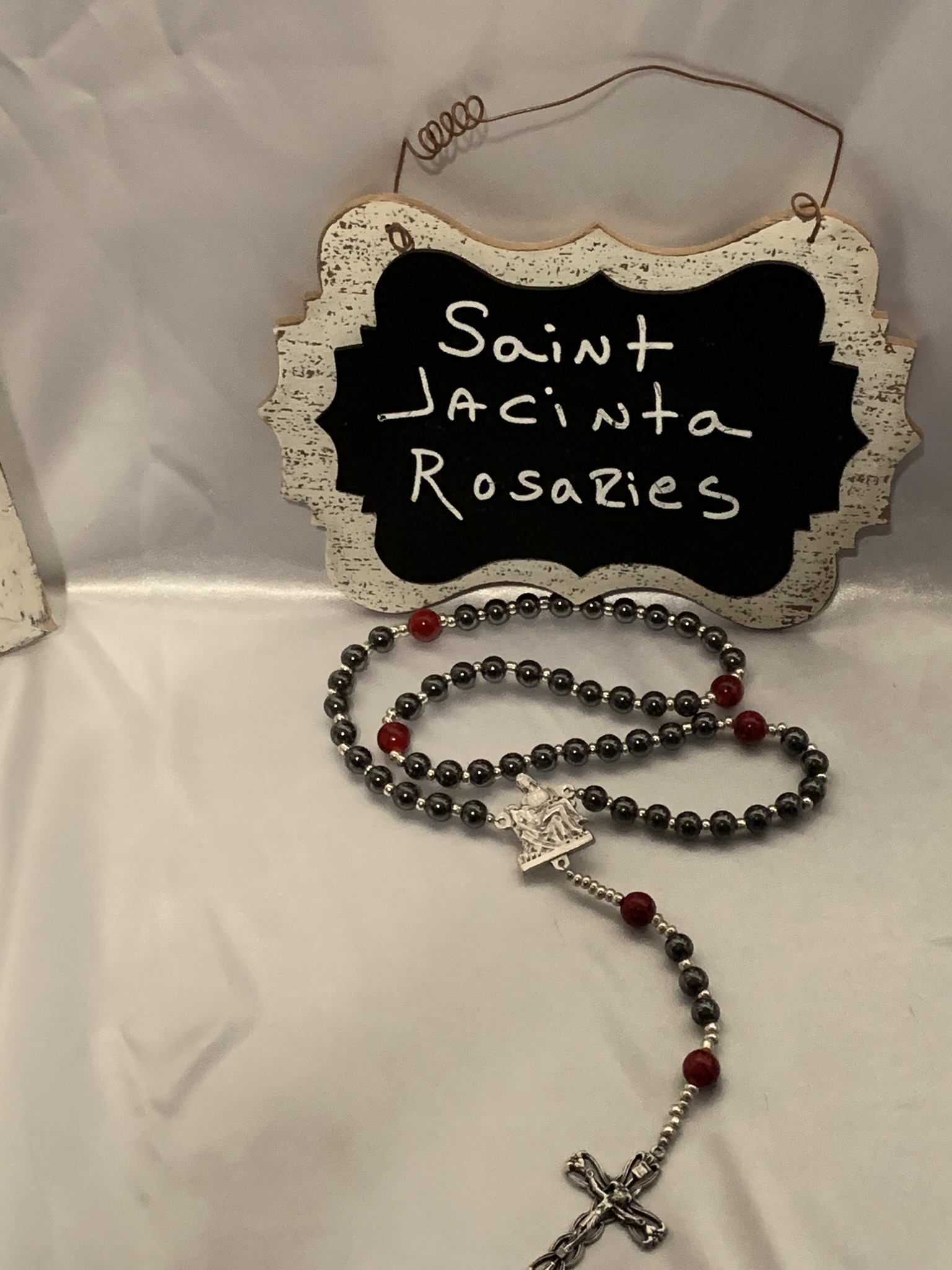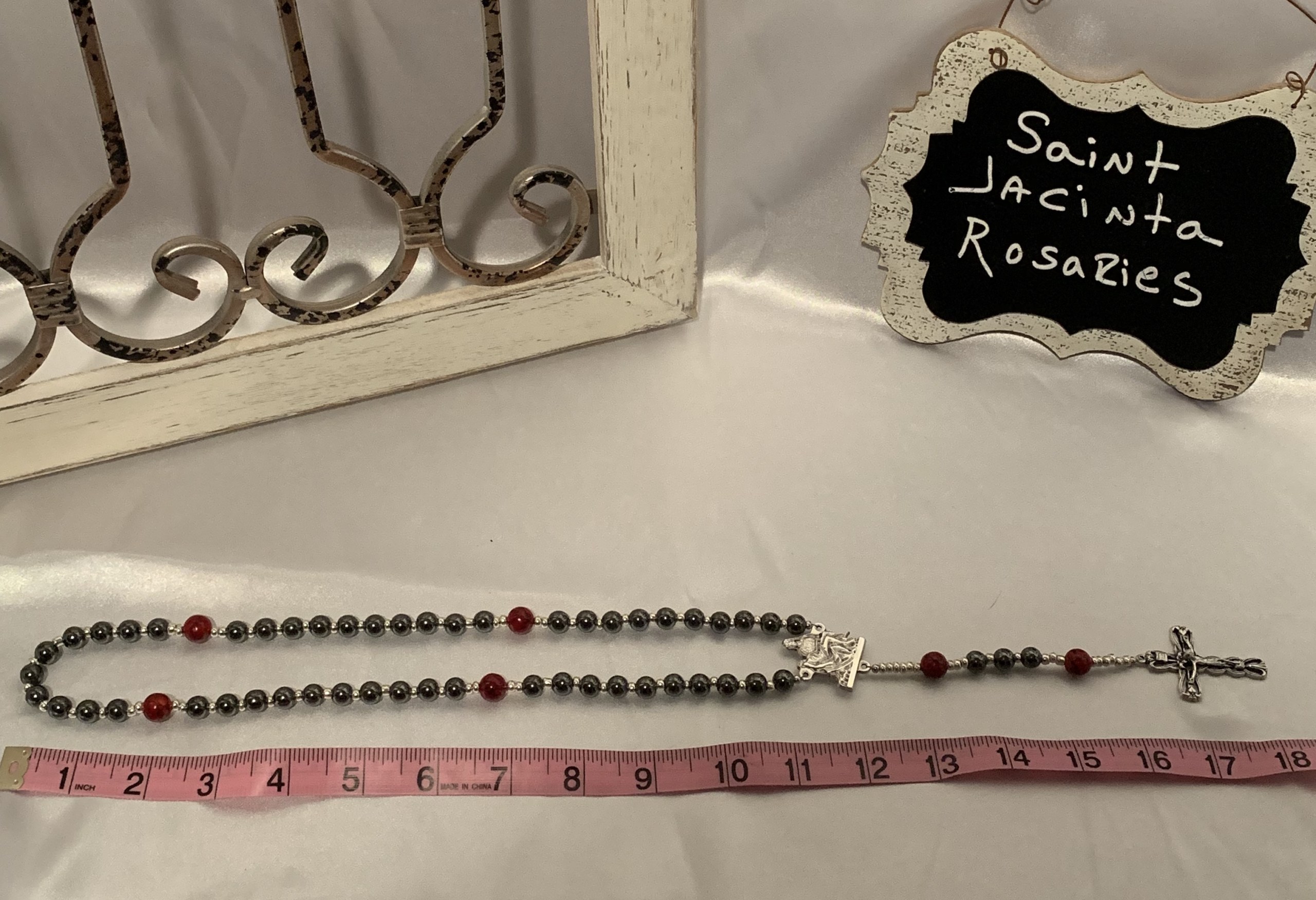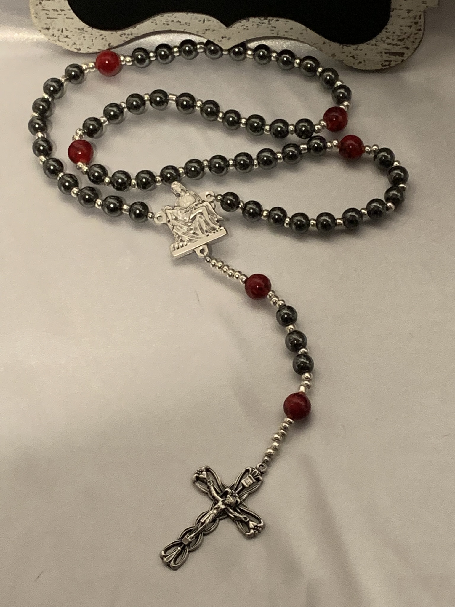 Beautiful handmade, one of a kind glass and stone bead rosary. The rosary center is a depiction of La Pieta. Handmade with love and prayer in Wyoming. I use heavy duty jewelry wire to ensure rosary is very durable.