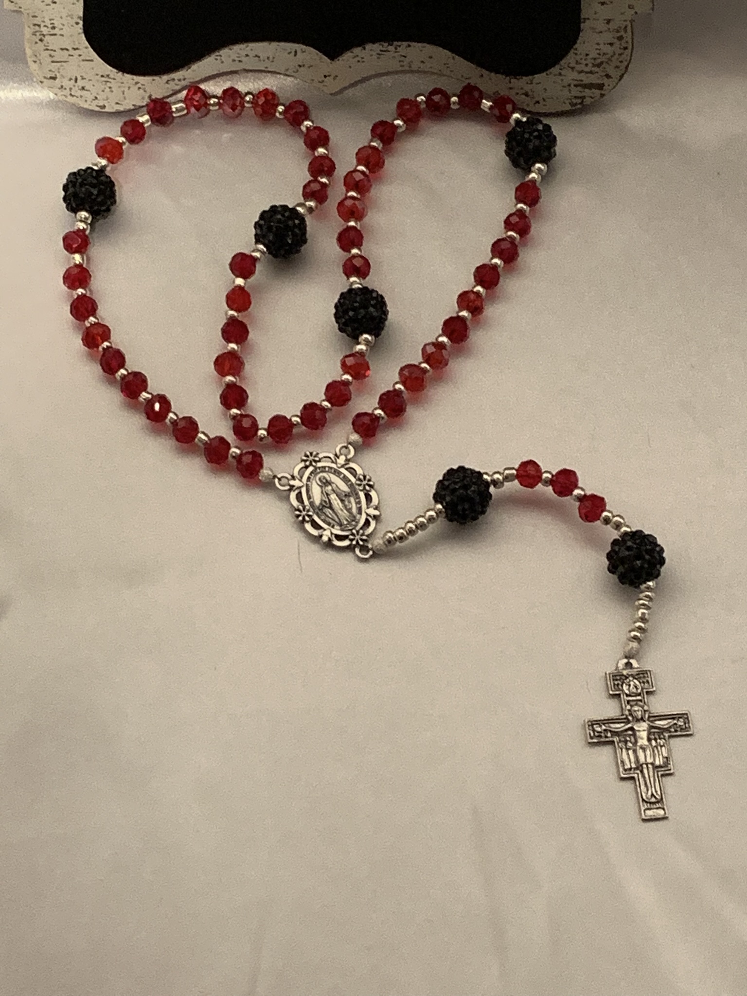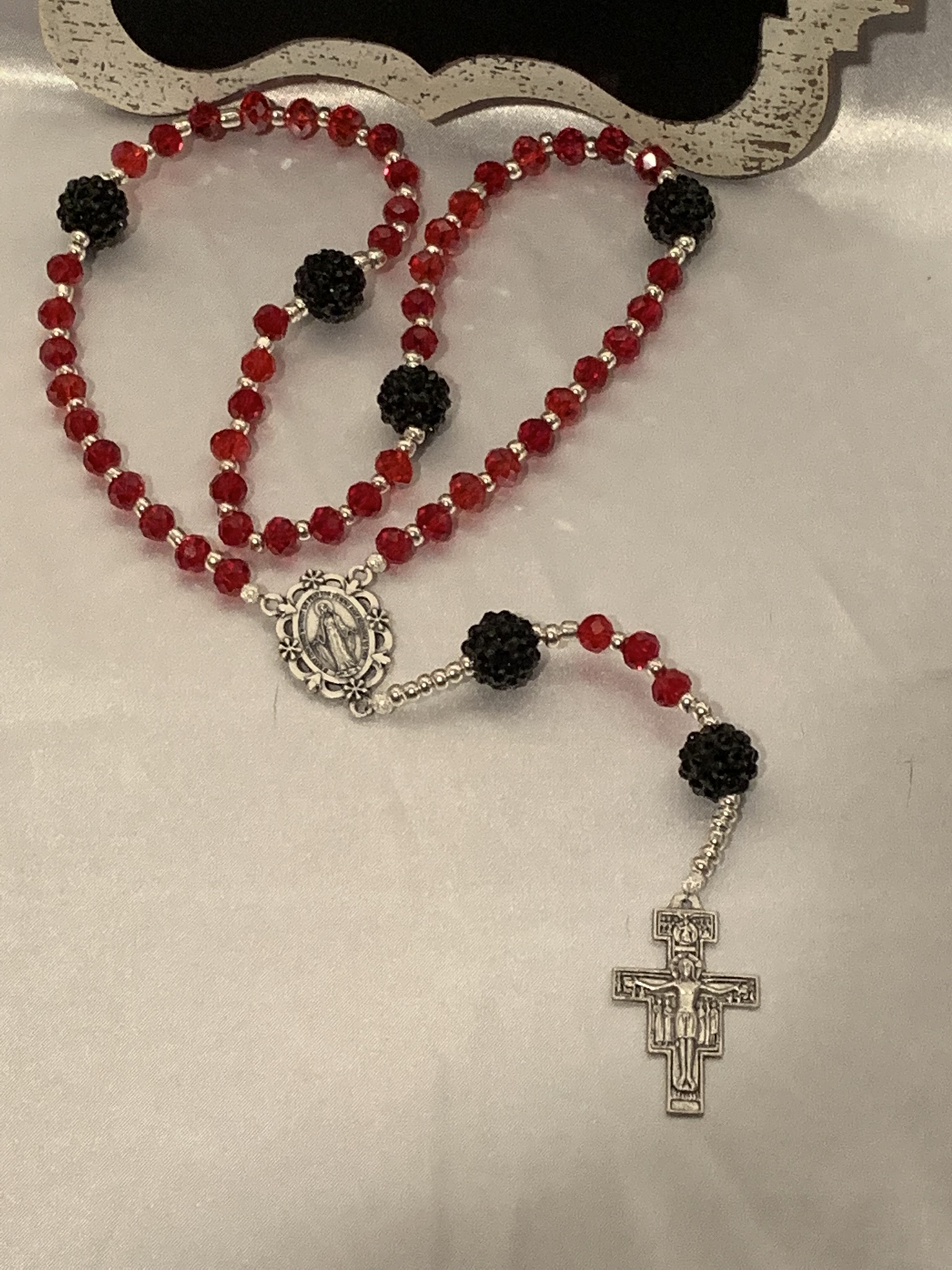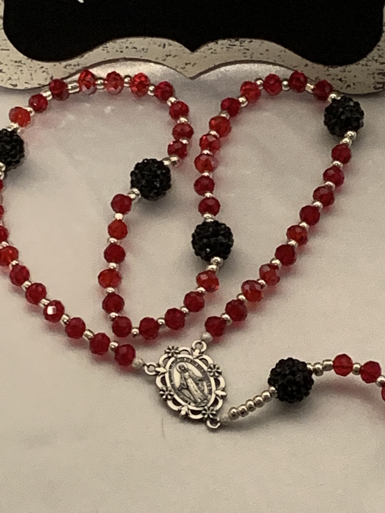 Beautiful handmade, one of a kind glass bead rosary. The rosary center is a depiction of the Miraculous Medal. Handmade with love and prayer in Wyoming. I use heavy duty jewelry wire to ensure rosary is very durable.