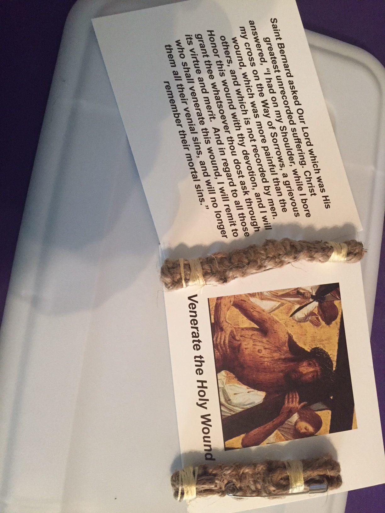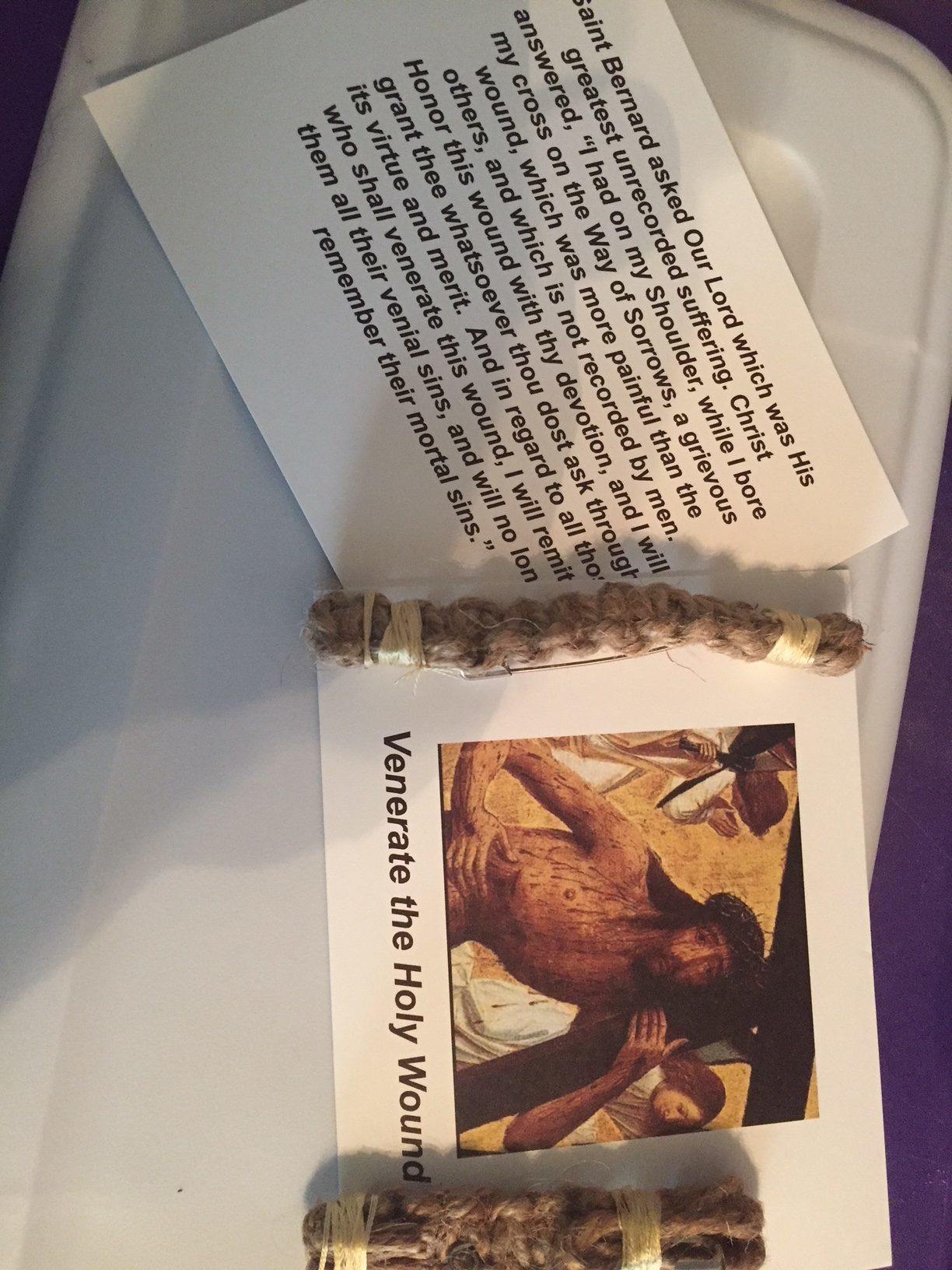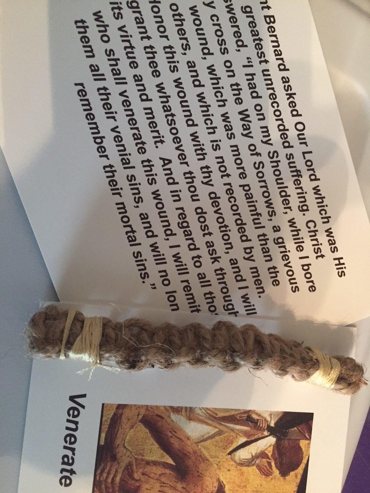 Saint Bernard asked Our Lord which was His greatest unrecorded suffering. Christ answered, “I had on my Shoulder, while I bore my cross on the Way of Sorrows, a grievous wound, which was more painful than the others, and which is not recorded by men. Honor this wound with thy devotion, and I will grant thee whatsoever thou dost ask through its virtue and merit. And in regard to all those who shall venerate this wound, I will remit to them all their venial sins, and will no longer remember their mortal sins.”