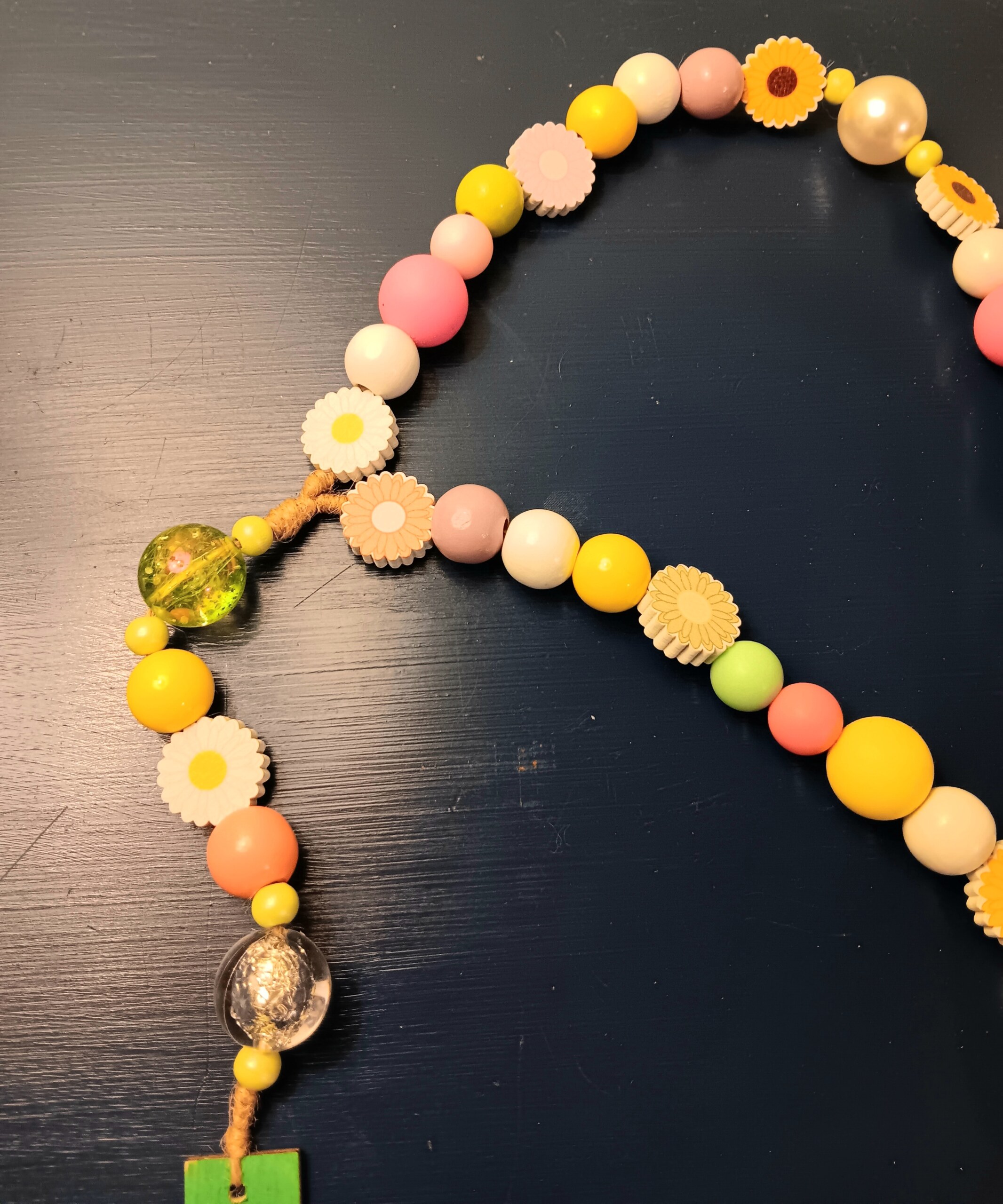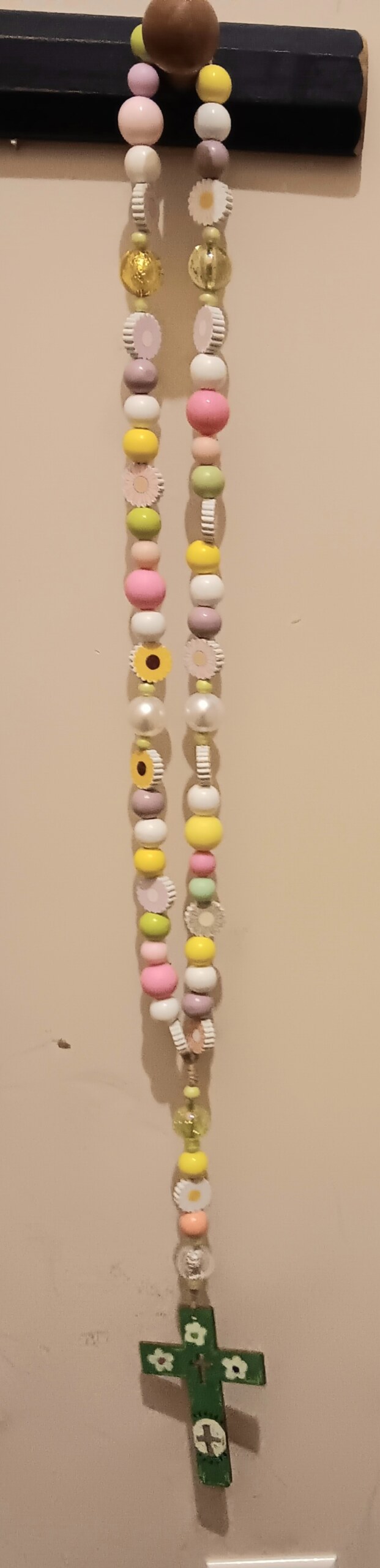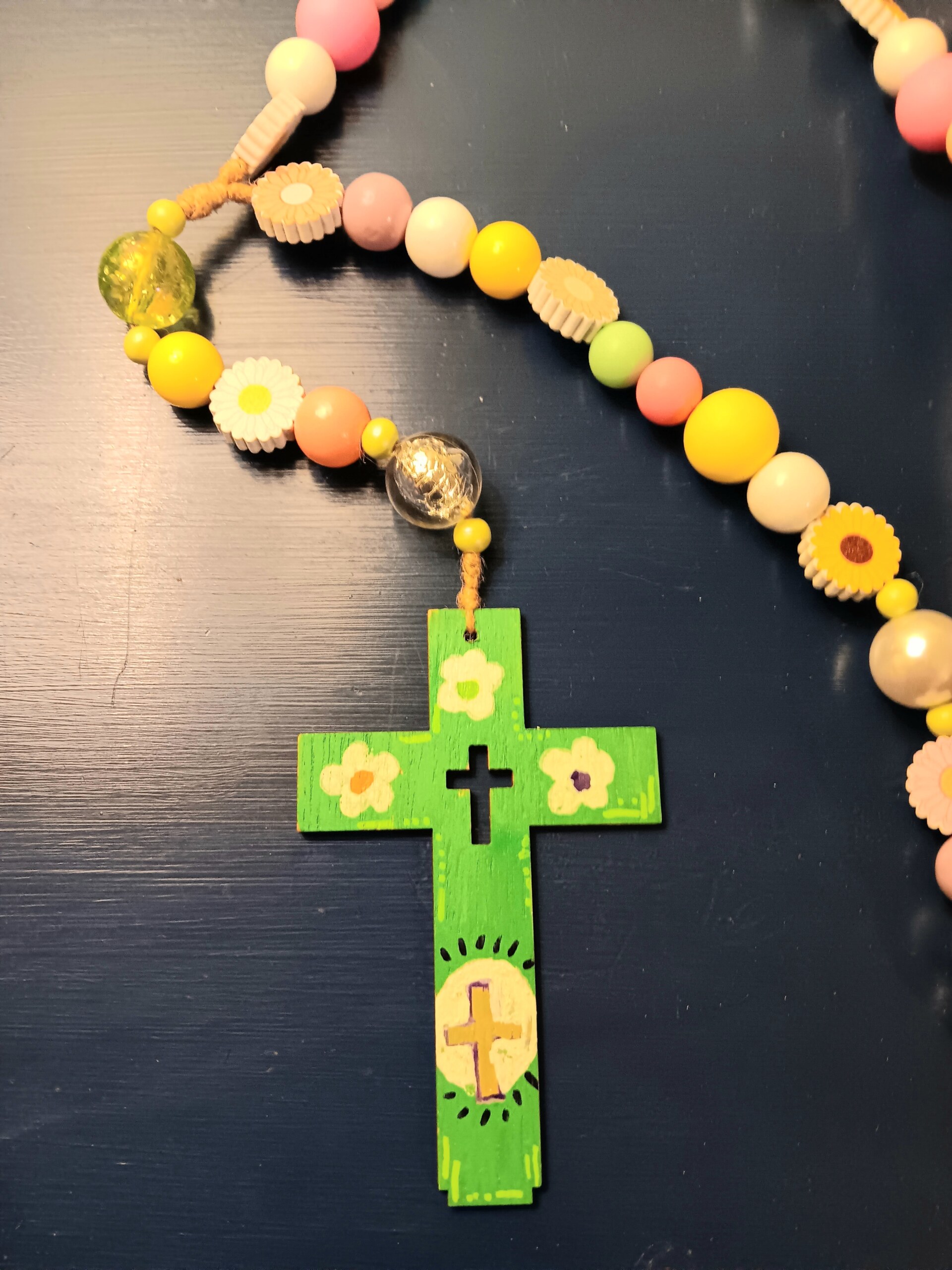(0010)This rosary is made mostly from 16mm wooden beads that are spring colors (green, yellow, pink, purple, white and flower. The other beads are 20mm acrylic and sparkly. The spacer beads are yellow 8mm. The cord I used is a regular twine.
