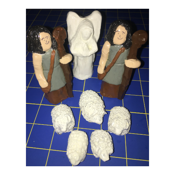 Adoration of the Shepherds: 2 shepherds, 1 angel, 5 sheep