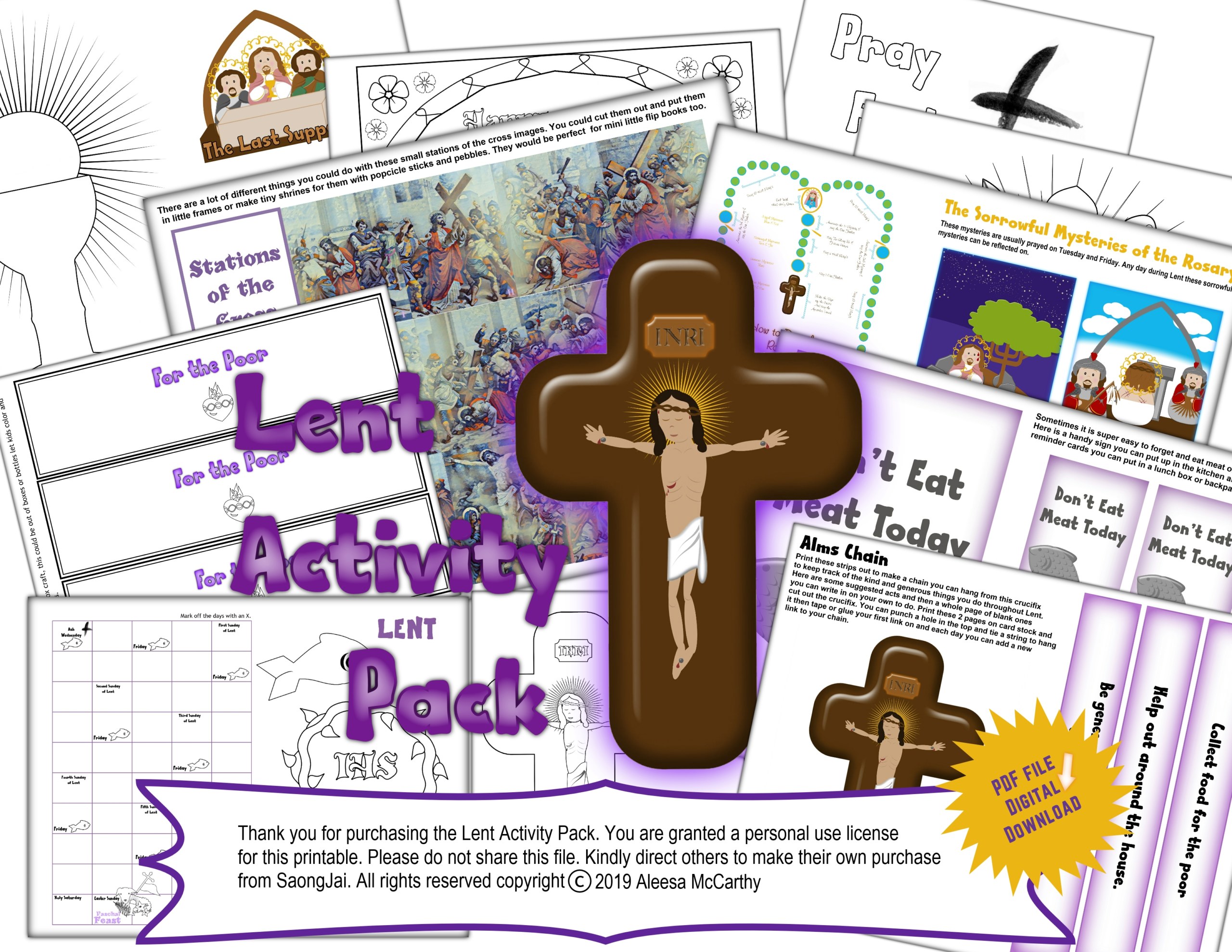 Help your little ones observe this Lenten season using this activity pack. This PDF includes an intro letter with a kid friendly explanation of the lenten season, a mark off calendar, stations of the cross images, new sorrowful mysteries of the rosary images, coloring pages, and a couple crafts. The PDF is 23 pages.