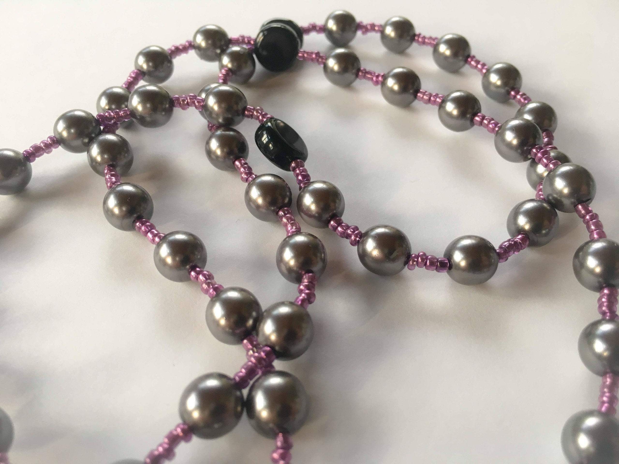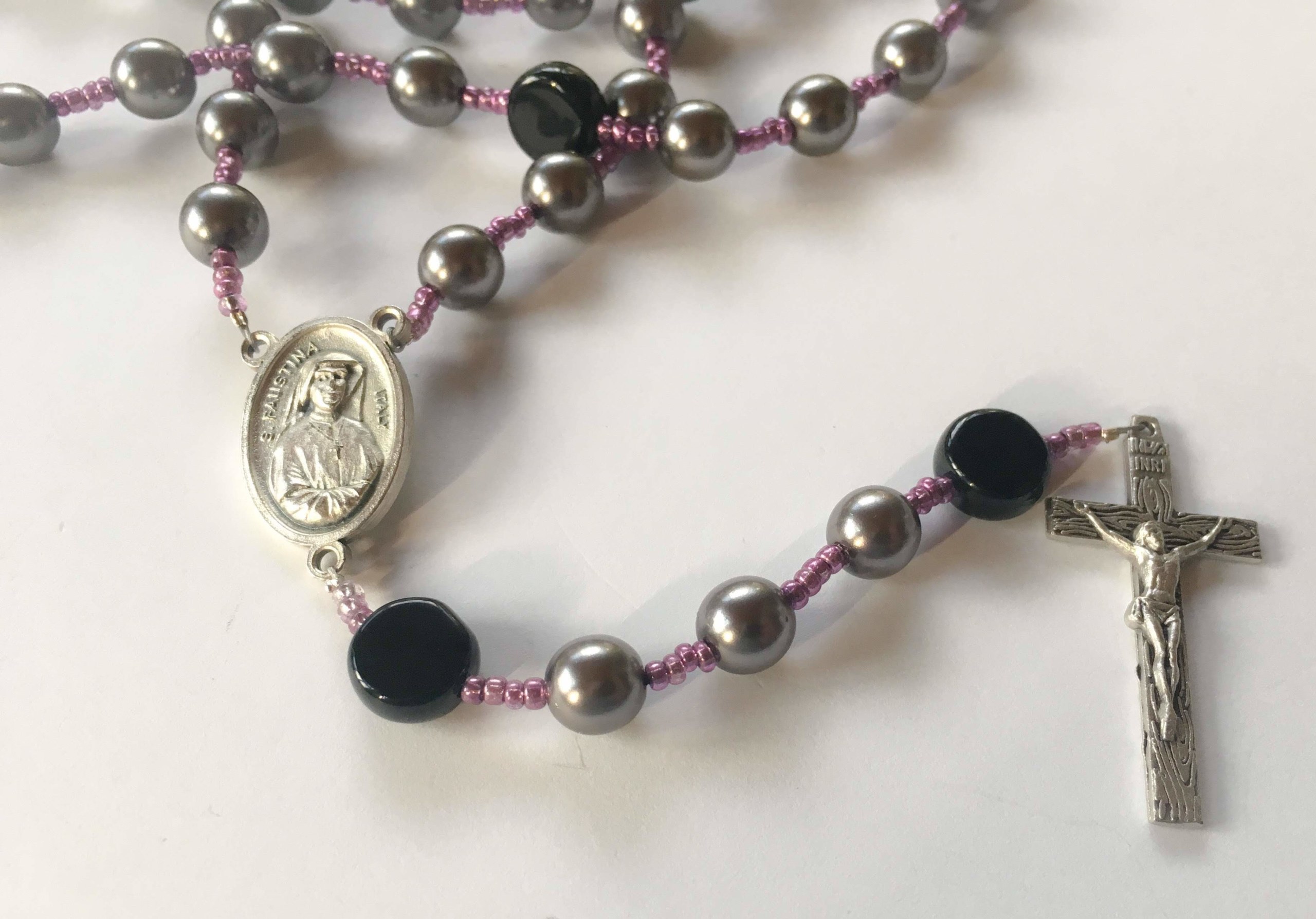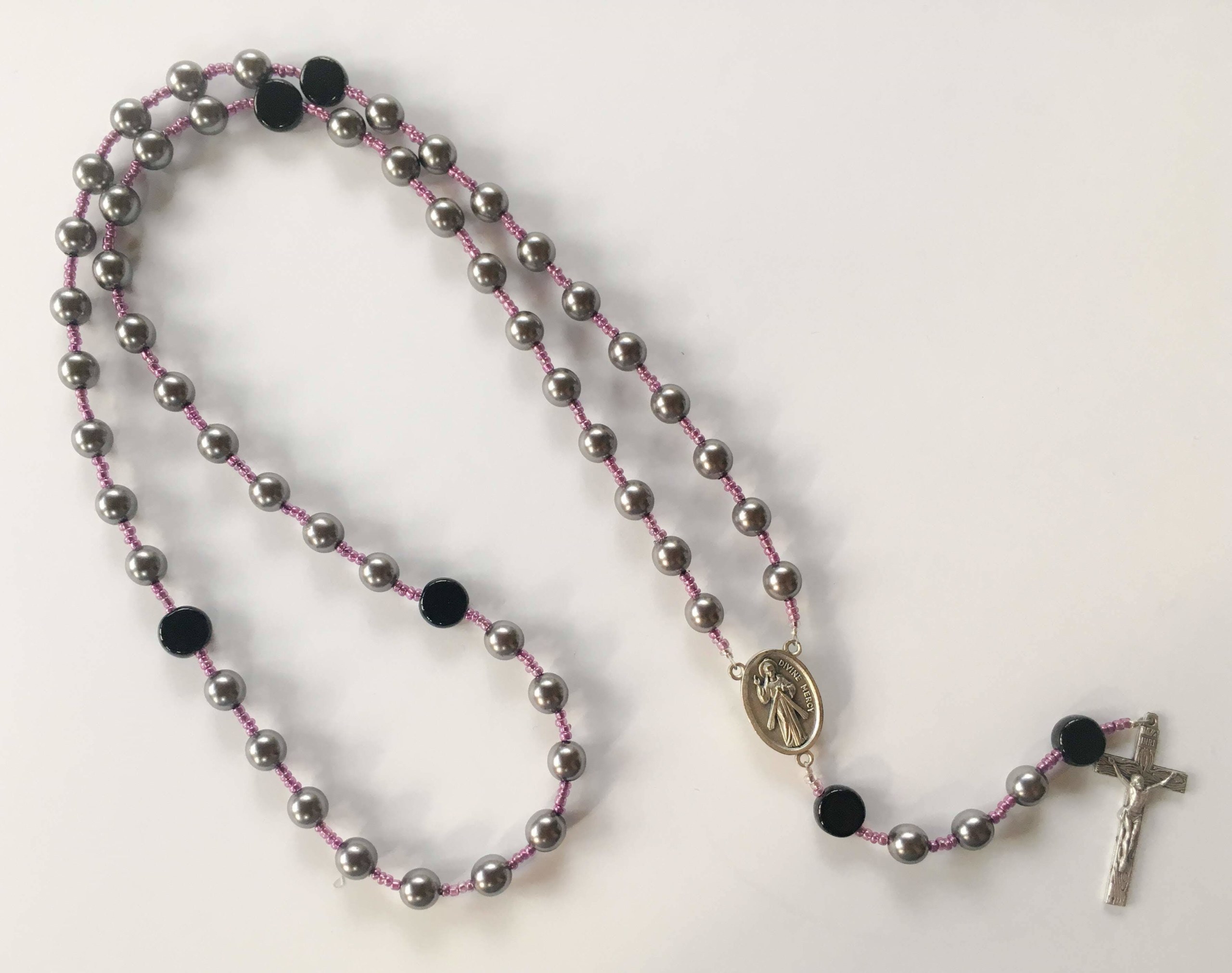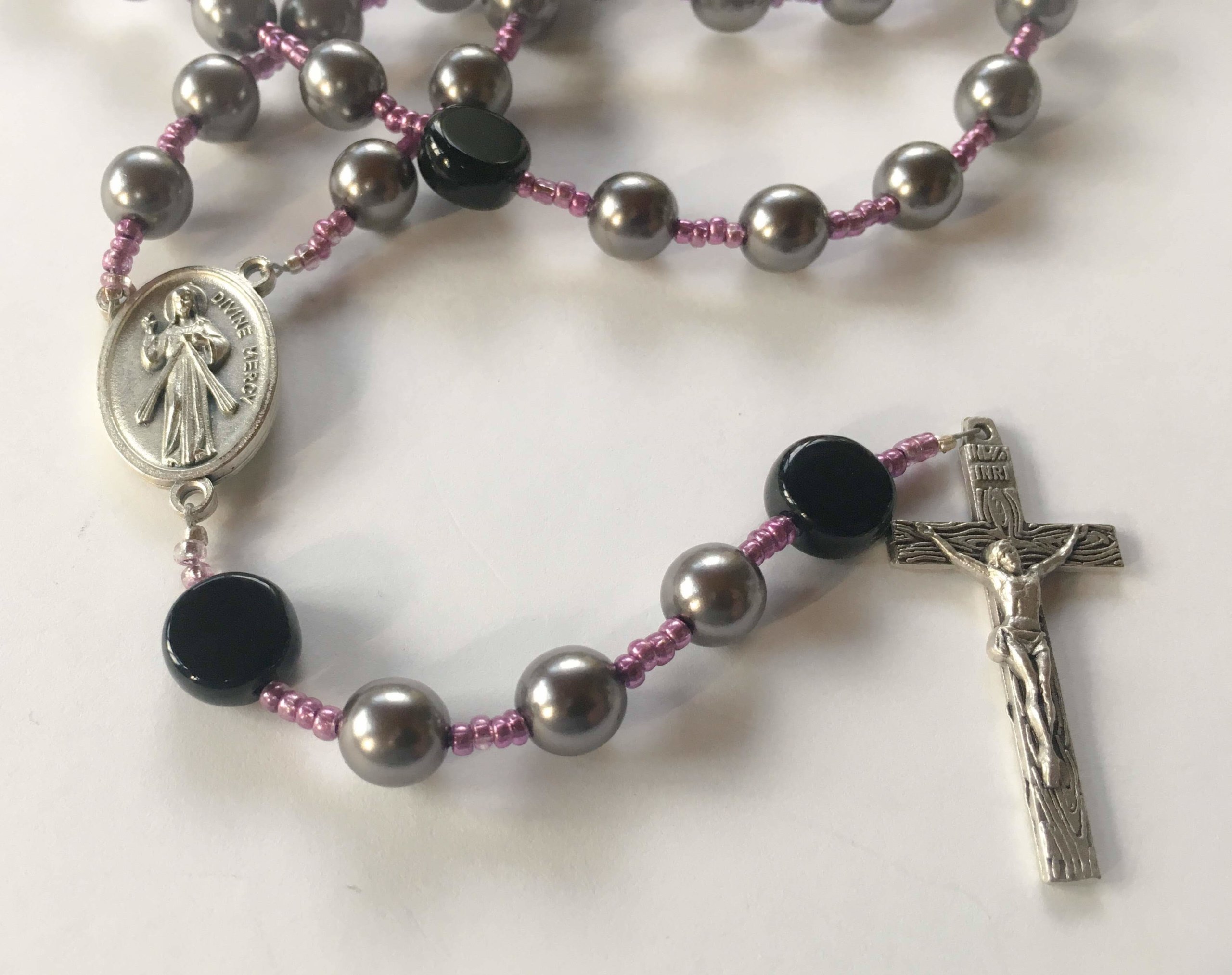 This liturgical rosary was designed with Lenten colors in mind — anchor gray pearls, smooth circular black beads, and purple spacer beads. Lent can feel hard so we must have hope. That hope we look forward to comes at the end of Lent when we celebrate God’s glory and His mercy. Thus, a Divine Mercy centerpiece was chosen to complete this rosary. One side features Saint Faustina, and the other side the image of the Divine Mercy Jesus.