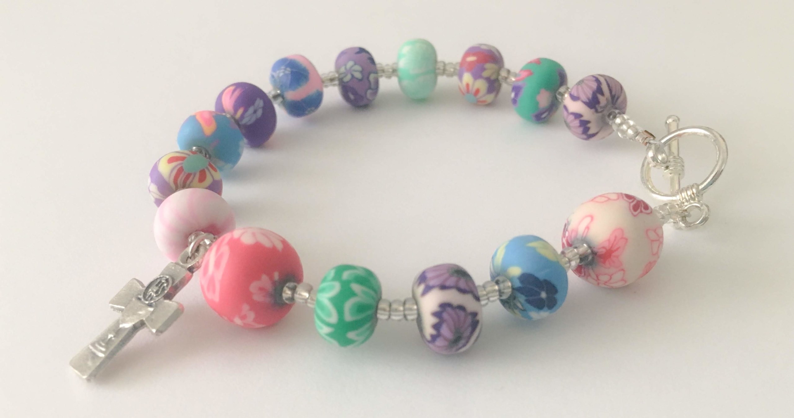 This decade rosary bracelet was made for a young girl who is receiving her First Holy Communion. The beads of the bracelet make a decade of the rosary. This bracelet features a small cross charm with a chalice on it. The bracelet closes with a simple toggle clasp which is easy to use and keeps the bracelet secure.
