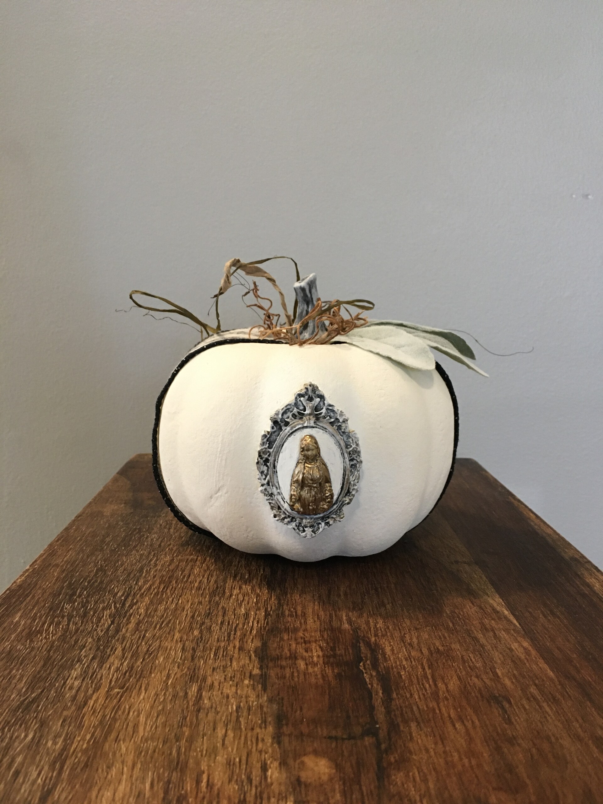 Add this Catholic pumpkin to your fall decor! The pumpkin is one-of-a-kind, featuring a framed image of our Blessed Mother.