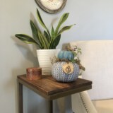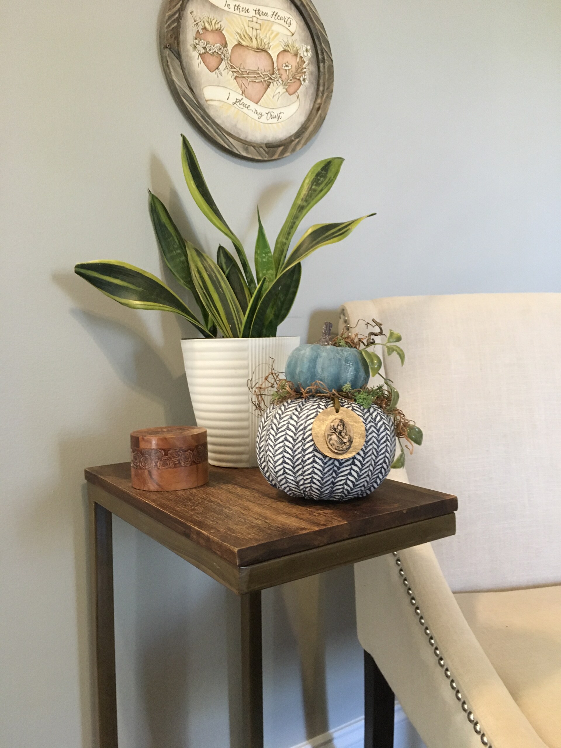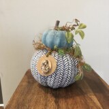Add this Catholic pumpkin to your fall decor! The stacked pumpkin is hand made and one-of-a-kind, featuring an image of Mary holding baby Jesus.