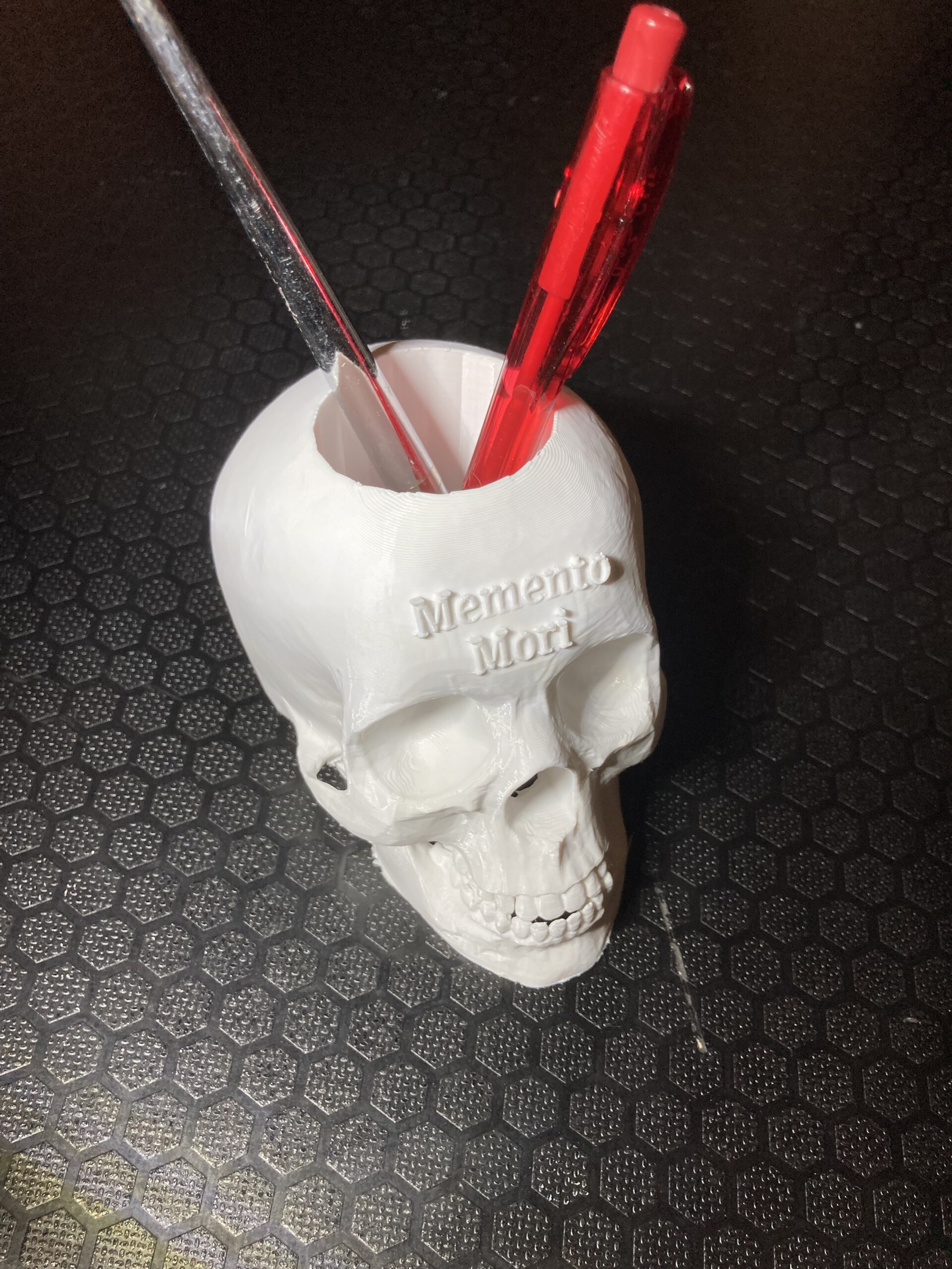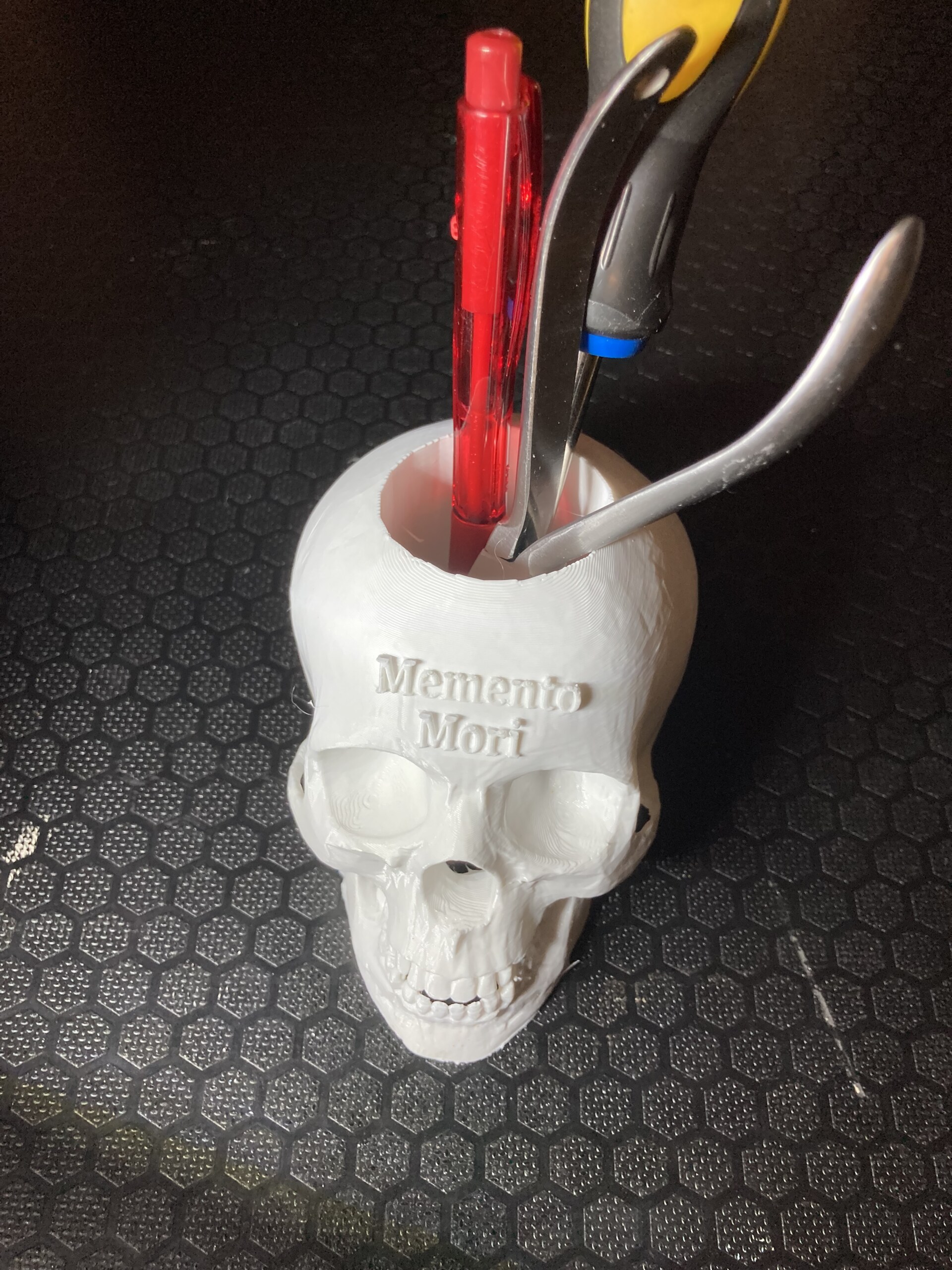 Memento Mori – Remember your death. This skull is a great way to remind us during the Lenten season (or any season) that we will all die one day. This reminder should help us to avoid evil and do good always. This can be used as a pen/pencil holder for your desk or used to hold tools, utensils, etc.