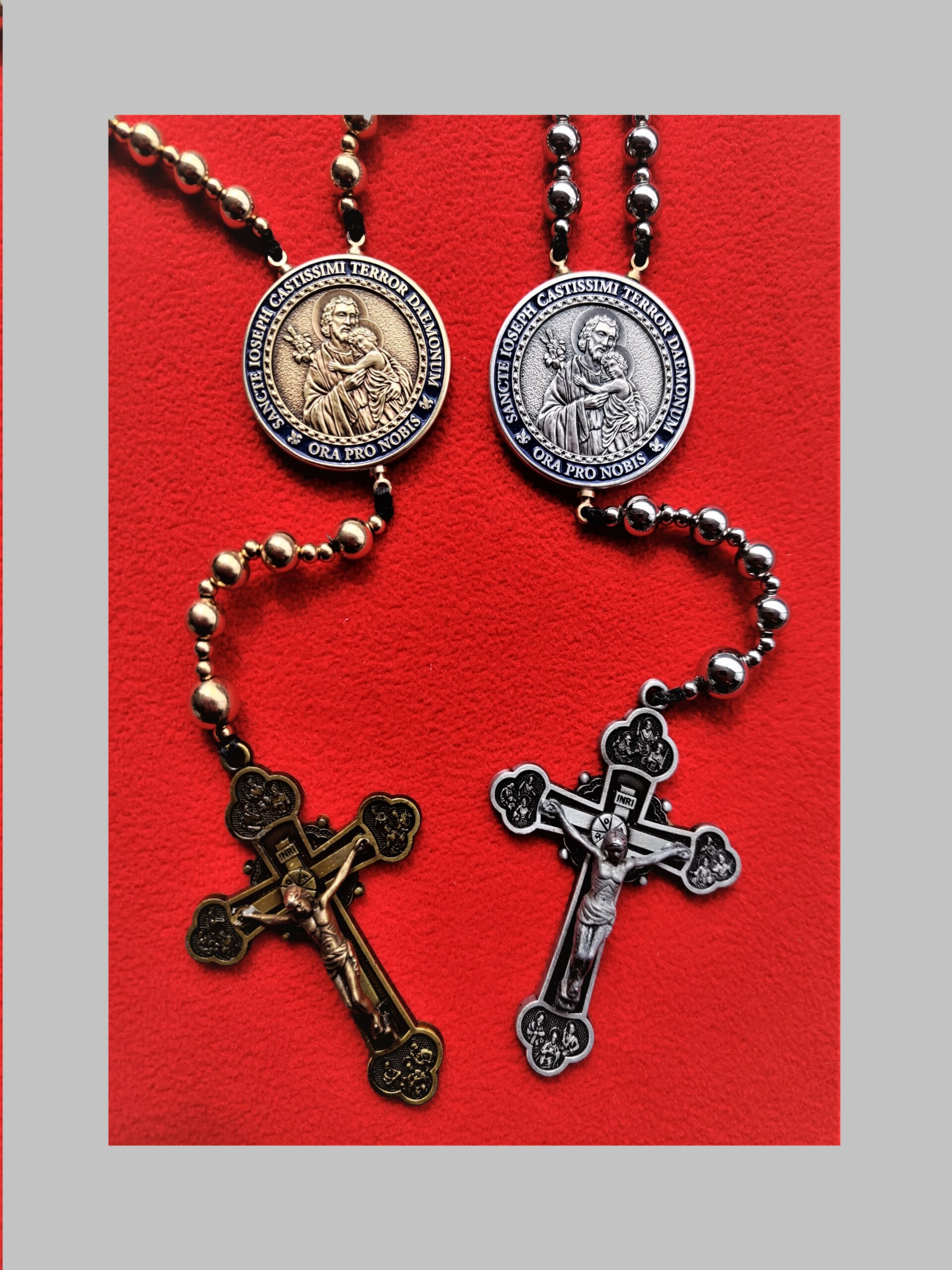 On one side of the rosary connector there is the figure of Saint Michael the Archangel, and on the other side of Saint Joseph.