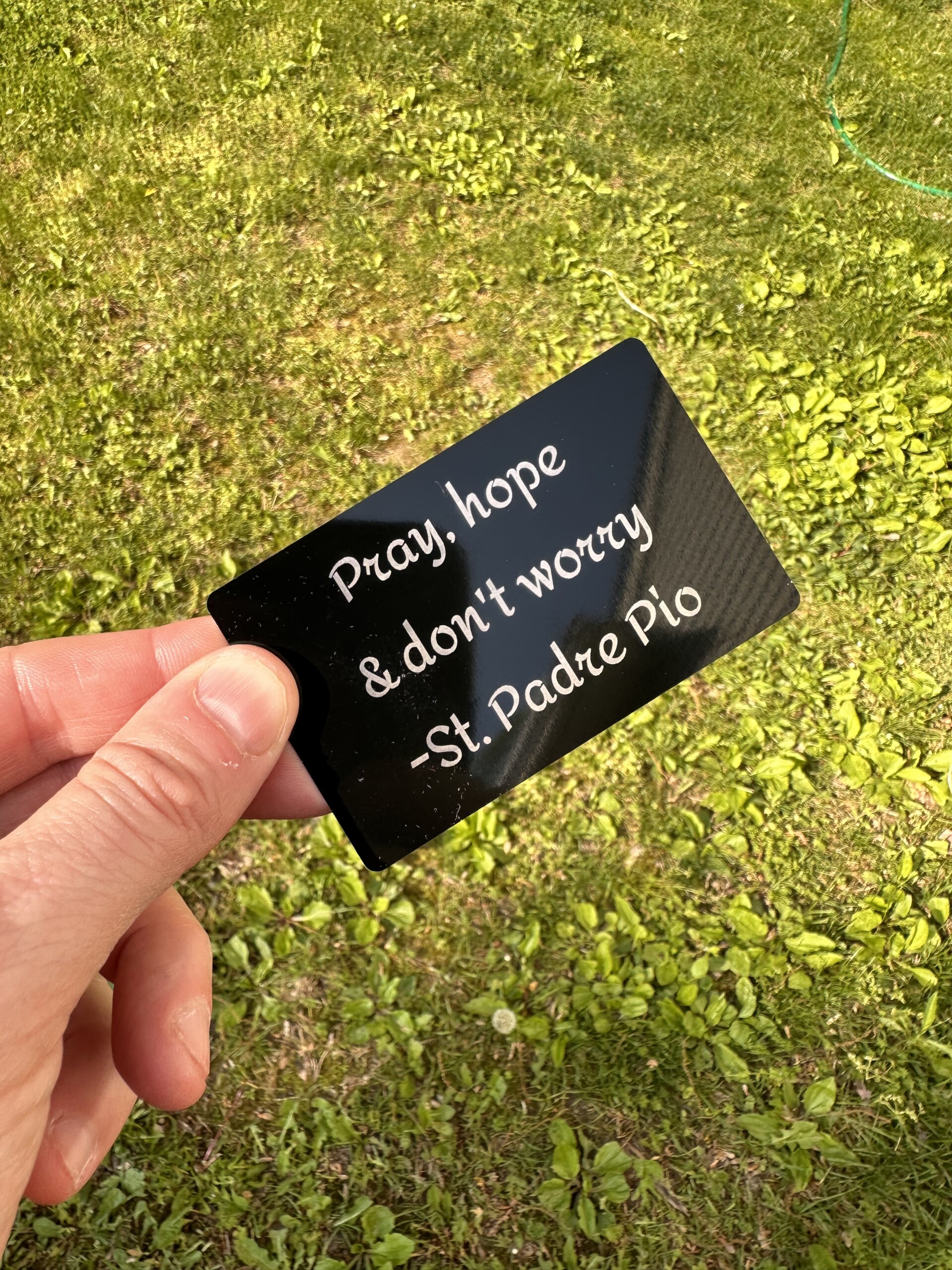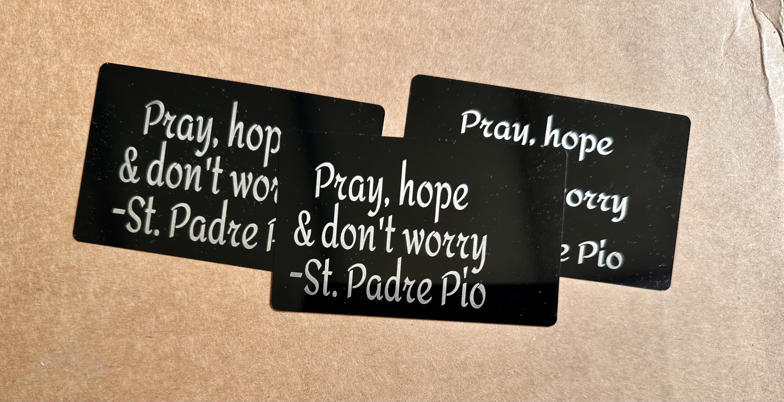 Metal wallet/business cards. Take St. Padre Pio’s message with you everywhere. In your purse or wallet or on your fridge! “Pray, Hope, Don’t Worry”!