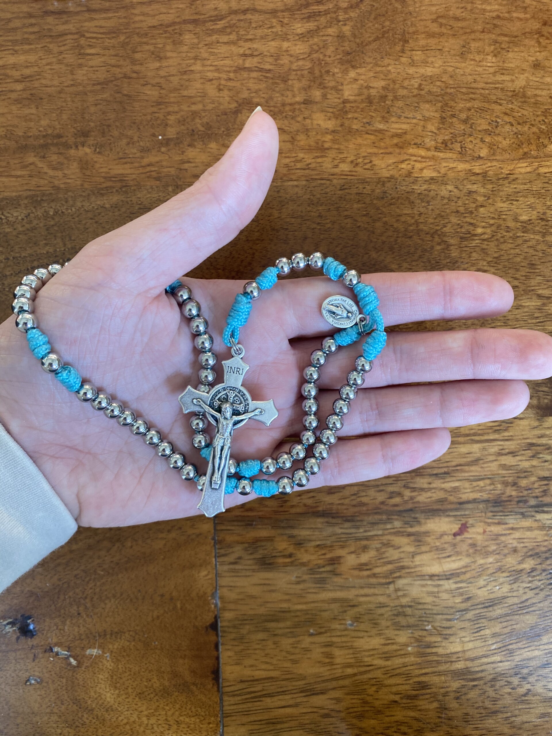 The beads are 6mm and made with 304 stainless steel, so you don’t need to worry about the metal fading! The crucifix is a 2 inch St. Benedict Crucifix and it was chosen because of its tried and tested durability! You never have to worry about the Corpus (Jesus) falling off!