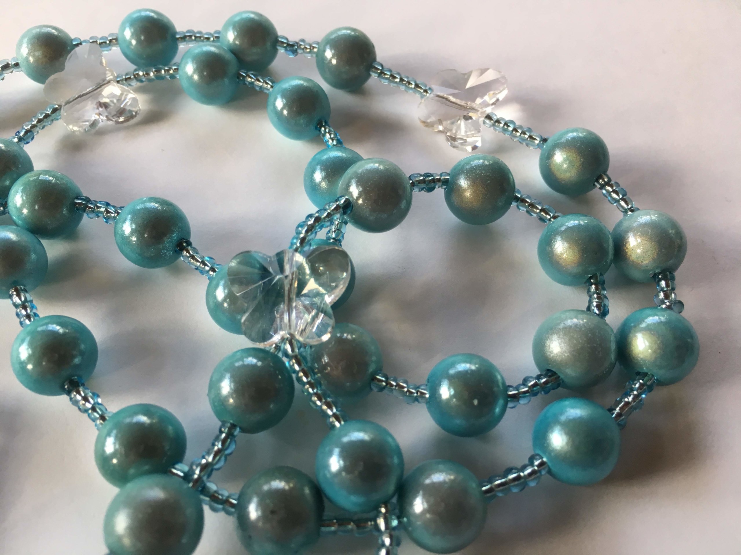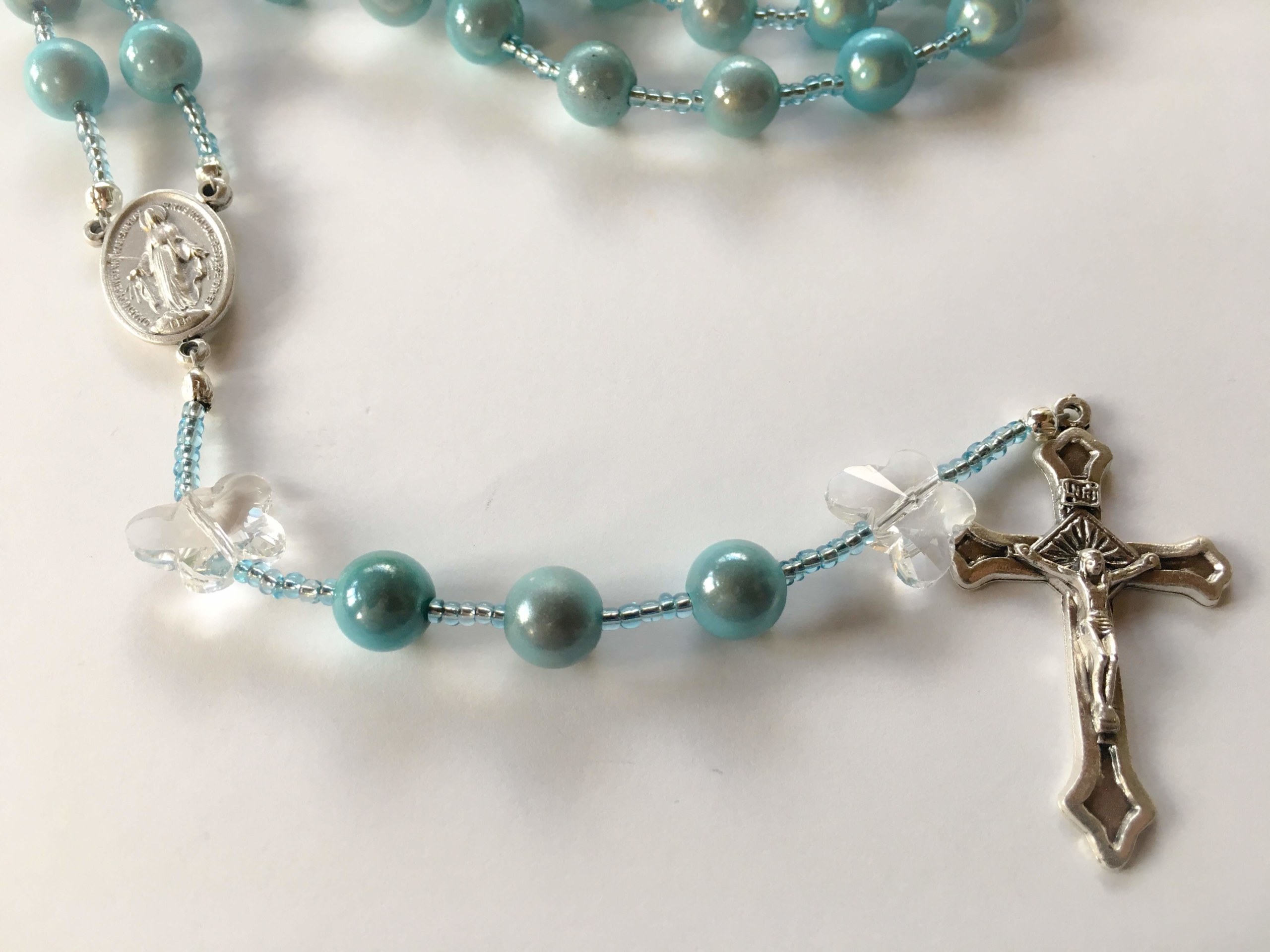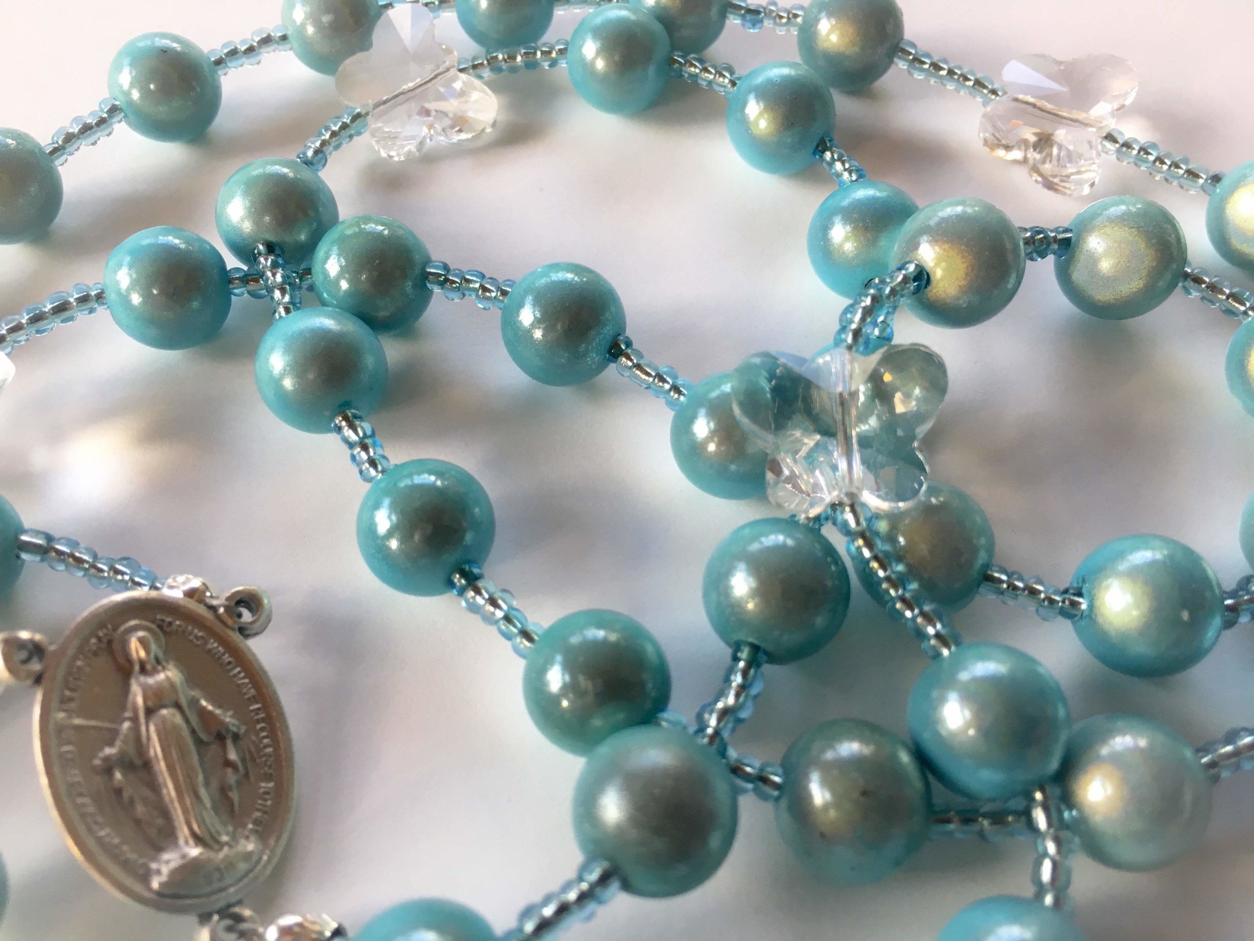 I joyfully and prayerfully design and hand-string each rosary here. All of my rosaries and wire-strung which makes them unlikely to tangle and break like traditional chain rosaries. These rosaries are NOT blessed. However, you may bring yours to your priest and ask him to bless it for you if you wish.