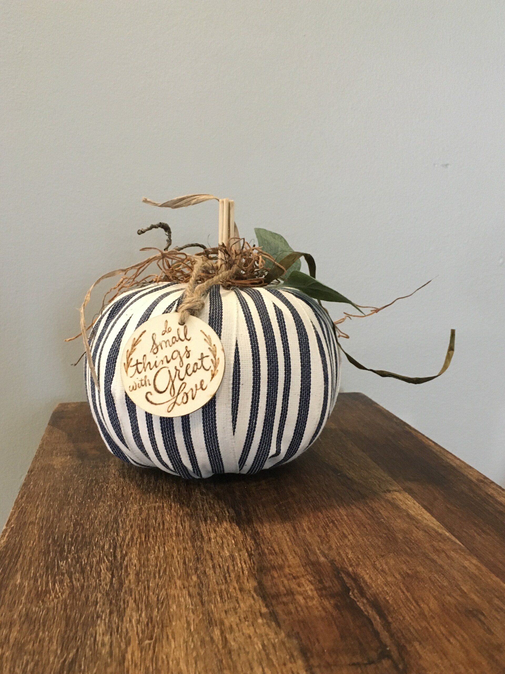 Add this Catholic pumpkin to your fall decor! The fabric covered pumpkin is hand made and one-of-a-kind, featuring a quote by Mother Teresa wood-burned by hand.