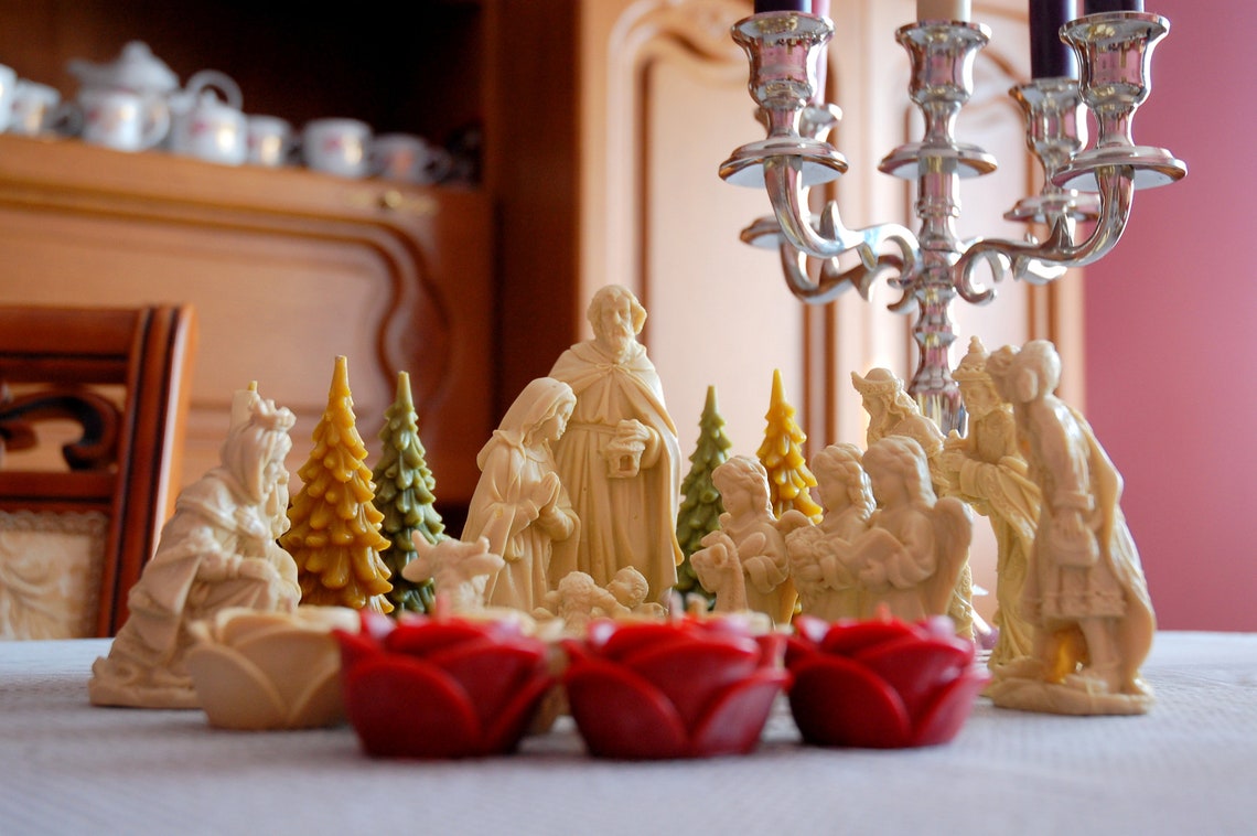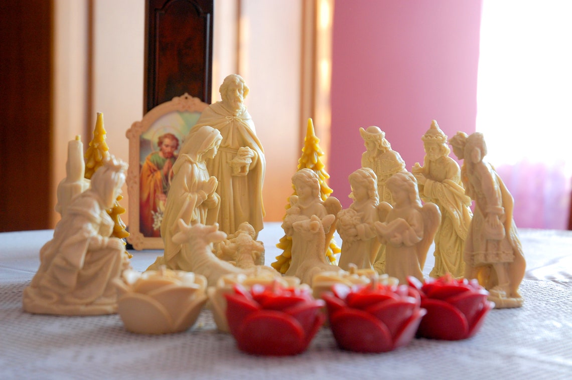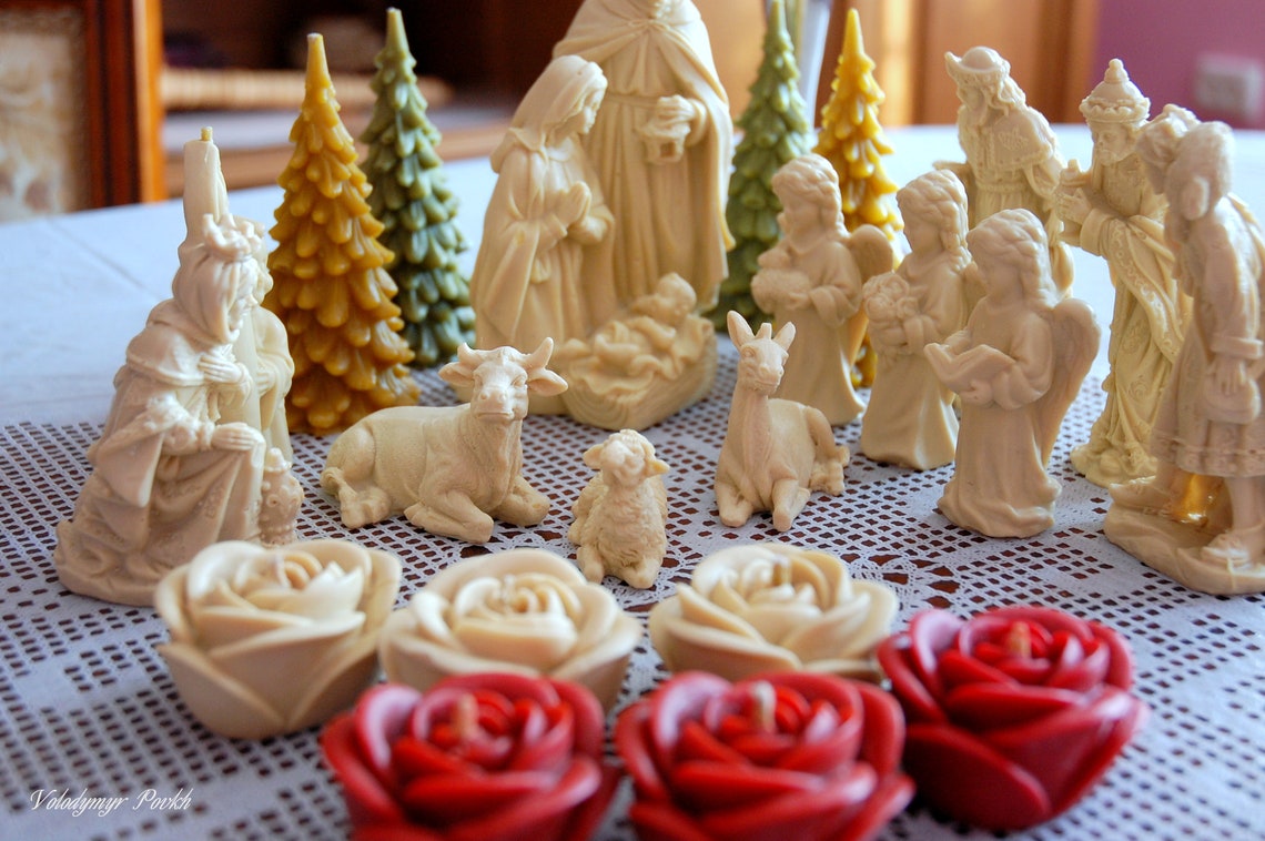 Nativity set consists of 23 pure beeswax items.-1 Nativity scene(3 in one -baby Jesus,Blessed Virgin Mary,St.Joseph), 3 angels figurines,6 candles roses(3 biege,3 red),2 beeswax green Christmas tree candles,2 Christmas tree pure beeswax candles, 1 angel holding a candle(candle may burn by the way), 1 shepherd holding a sheep on his shoulders,3 wise men with gifts,1 sheep, 1 donkey, 1 ox.