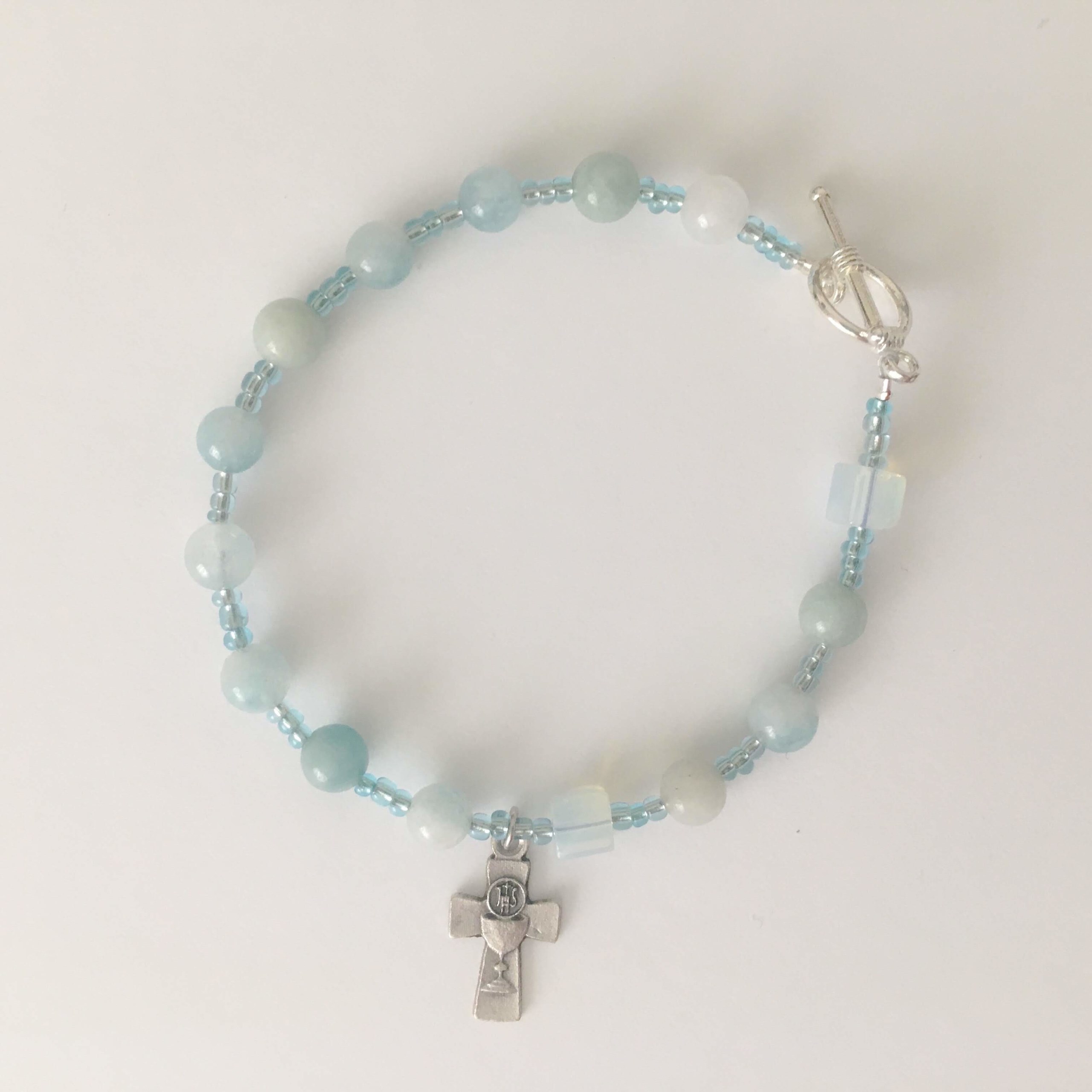 This decade rosary bracelet was made for a young girl who is receiving her First Holy Communion. The beads of the bracelet make a decade of the rosary. This bracelet features a small cross charm with a chalice on it. The bracelet closes with a simple toggle clasp which is easy to use and keeps the bracelet secure.