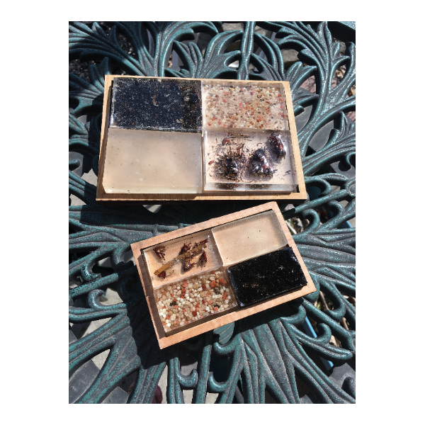 Clay and other materials contained within resin, displayed on a wood tray, to symbolize the various kinds of soil the seeds landed on
