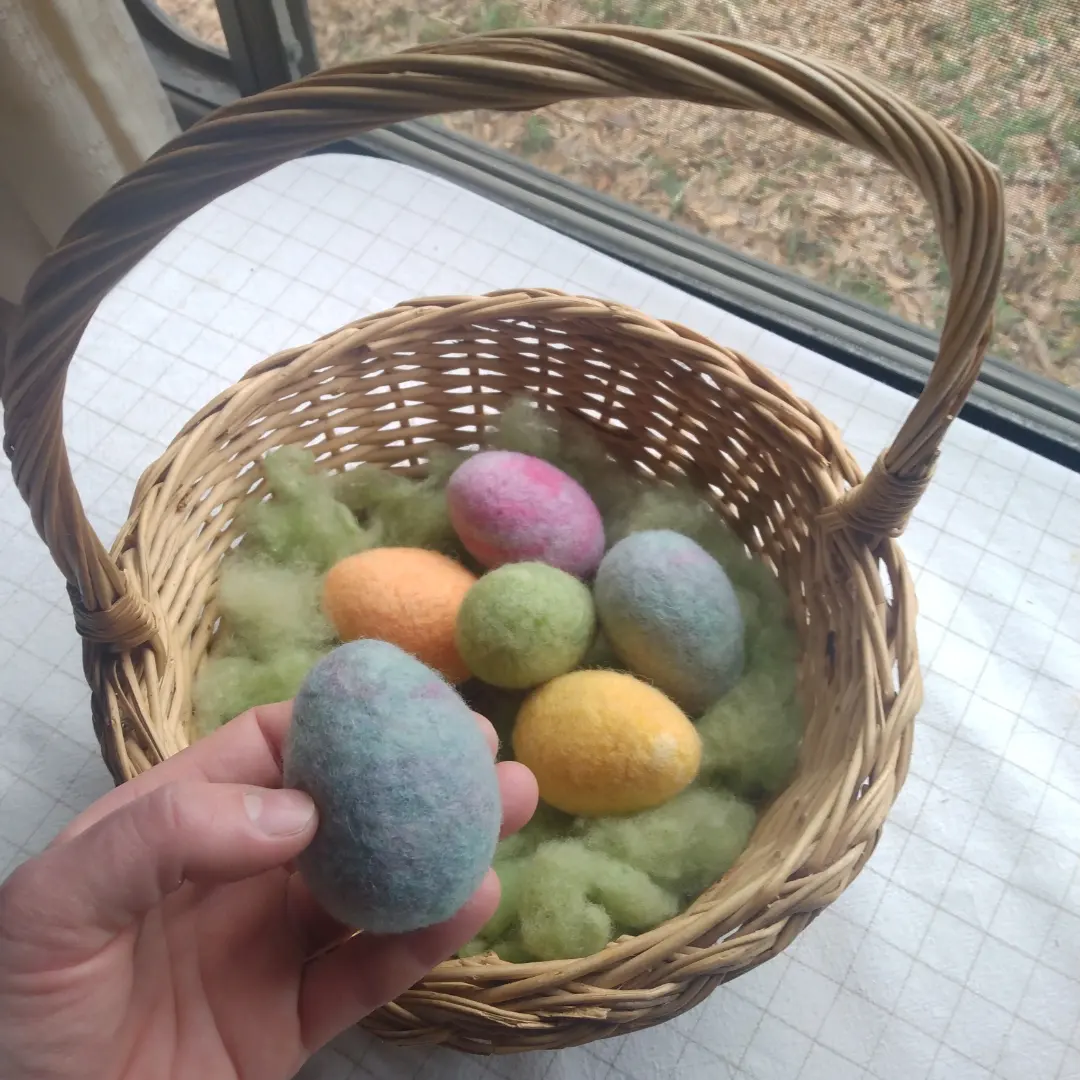 Six Easter eggs handmade from sheep’s wool using both wet and dry felting techniques for durability and firmness