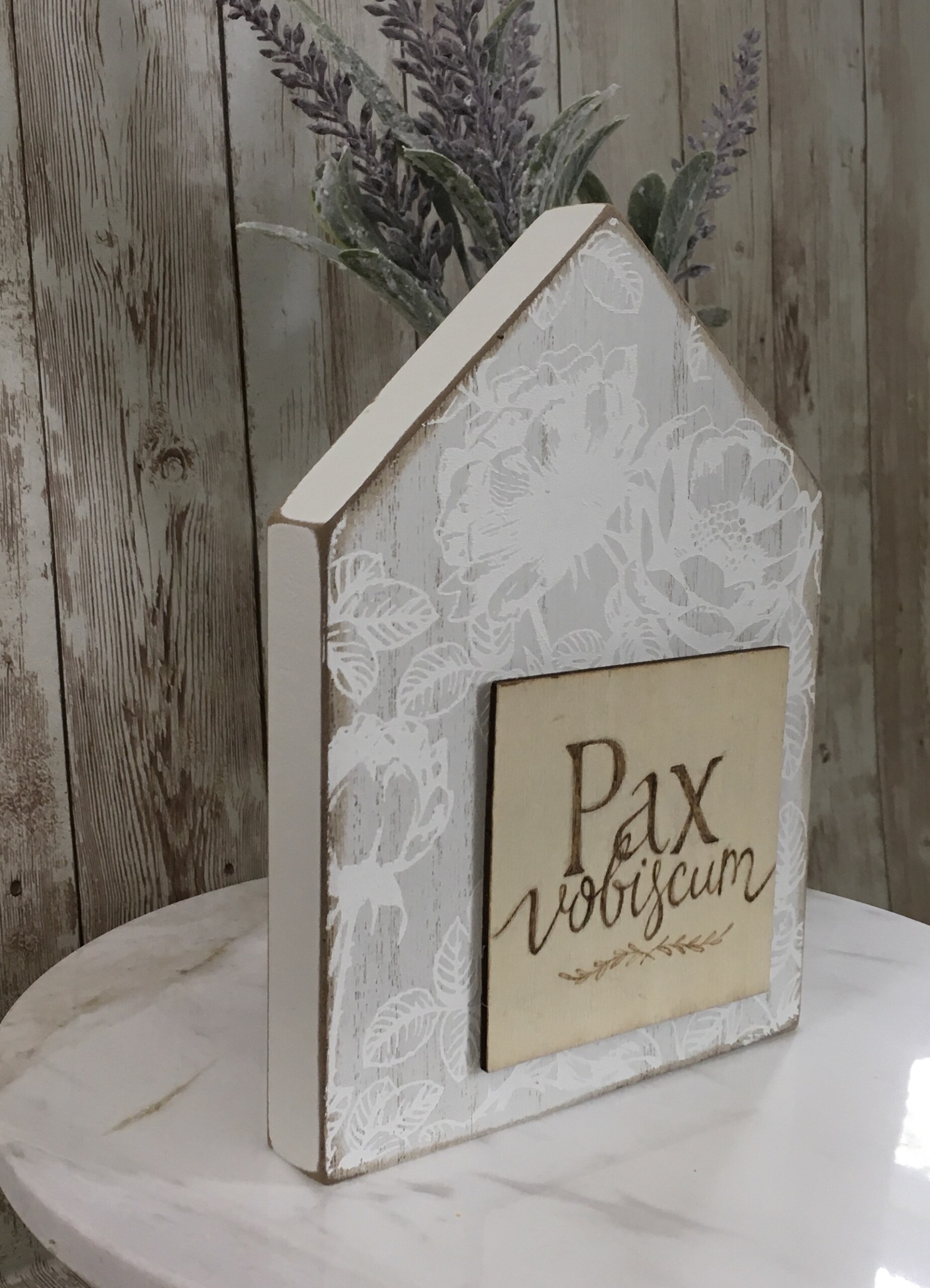 Pax Vobiscum (Peace be with you) wooden house-shaped home decor item, ready to ship. Vase not included.