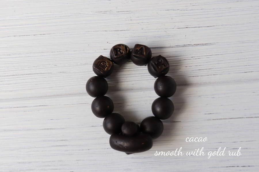 these rosaries are made of polymer clay, metallic buff and accented with a mini gold (for white tiles) or brass (for gold rub tiles) bell.