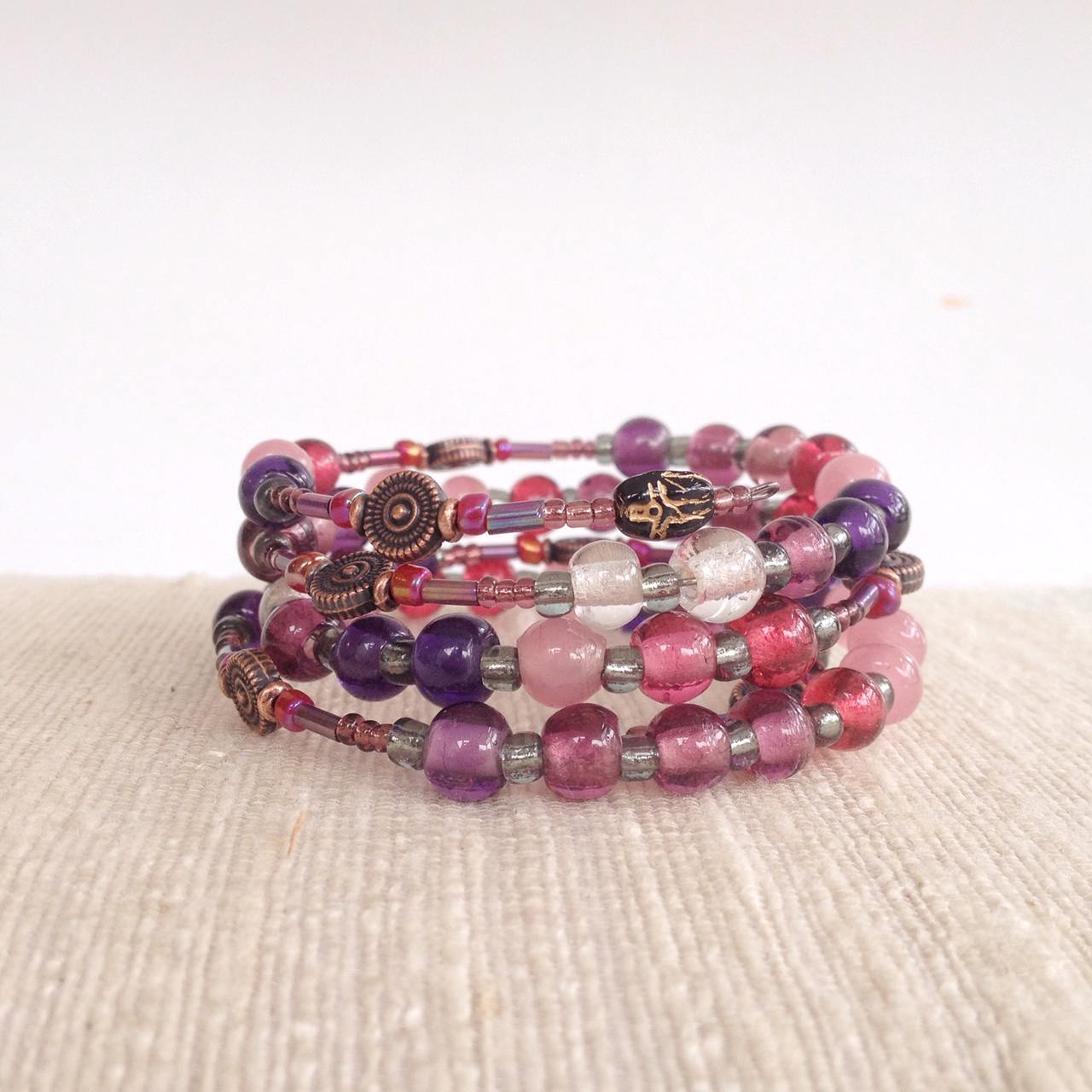 All of the adult bracelets are strung on 2 1/4″ memory wire and wrap 2 ½ to 5 times around, depending on the size of beads and design. Memory wire can be “stretched” if too tight by gently unbending the bracelet, a little at a time, all the way around its length.