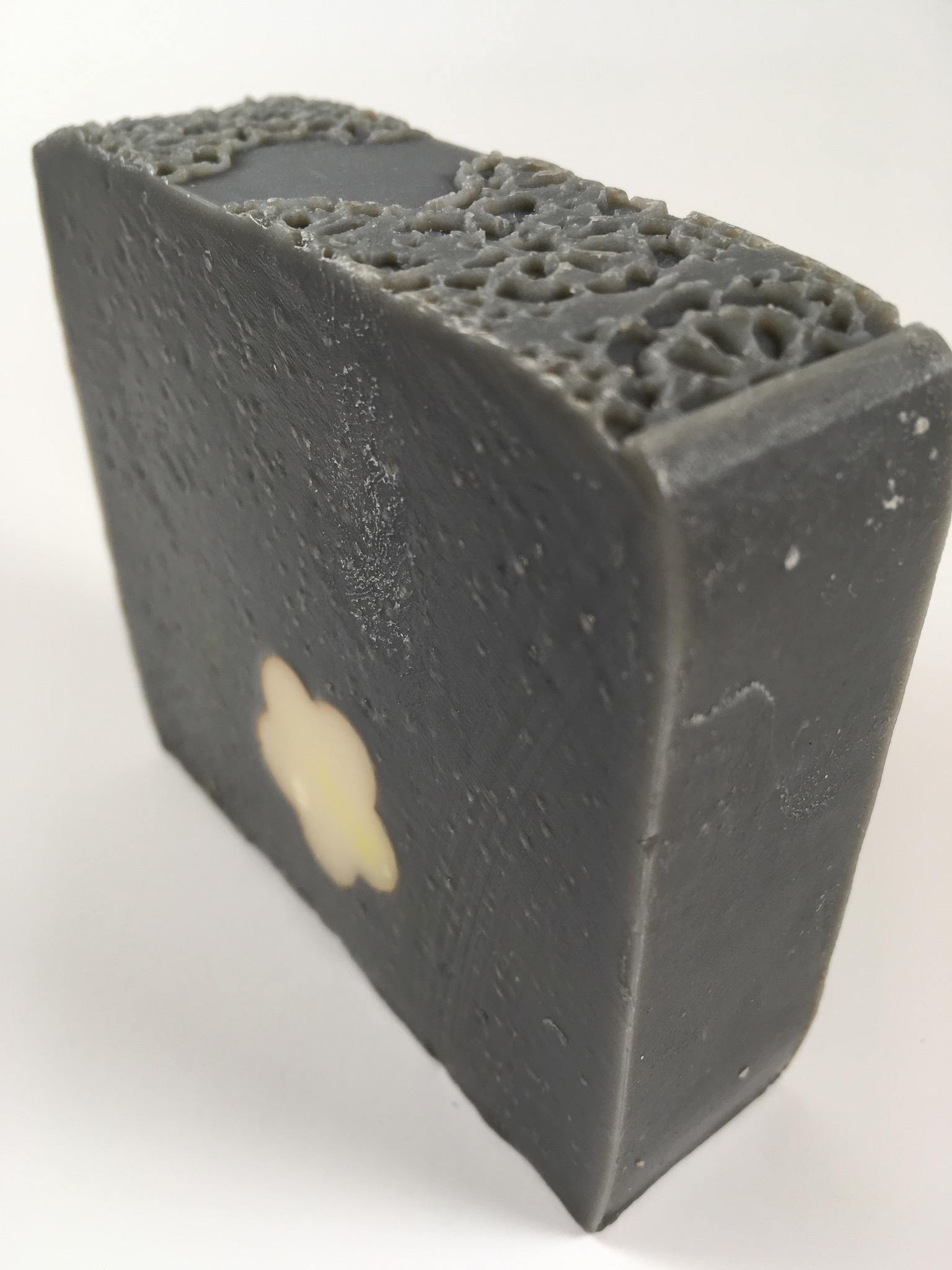 This soap bar is lovingly crafted with oils of olive, palm, coconut, cocoa butter and castor. May include fragrance oil, essential oils, botanicals and color. A lace imprint caps this beautiful gray bar with a white flower embed, dipped in gold mica. Scent is sweet and spicy. Top notes: citrus. Middle notes: sugar, black pepper. Base notes: patchouli, musk. Compare to Lush brand, Lord of Misrule.