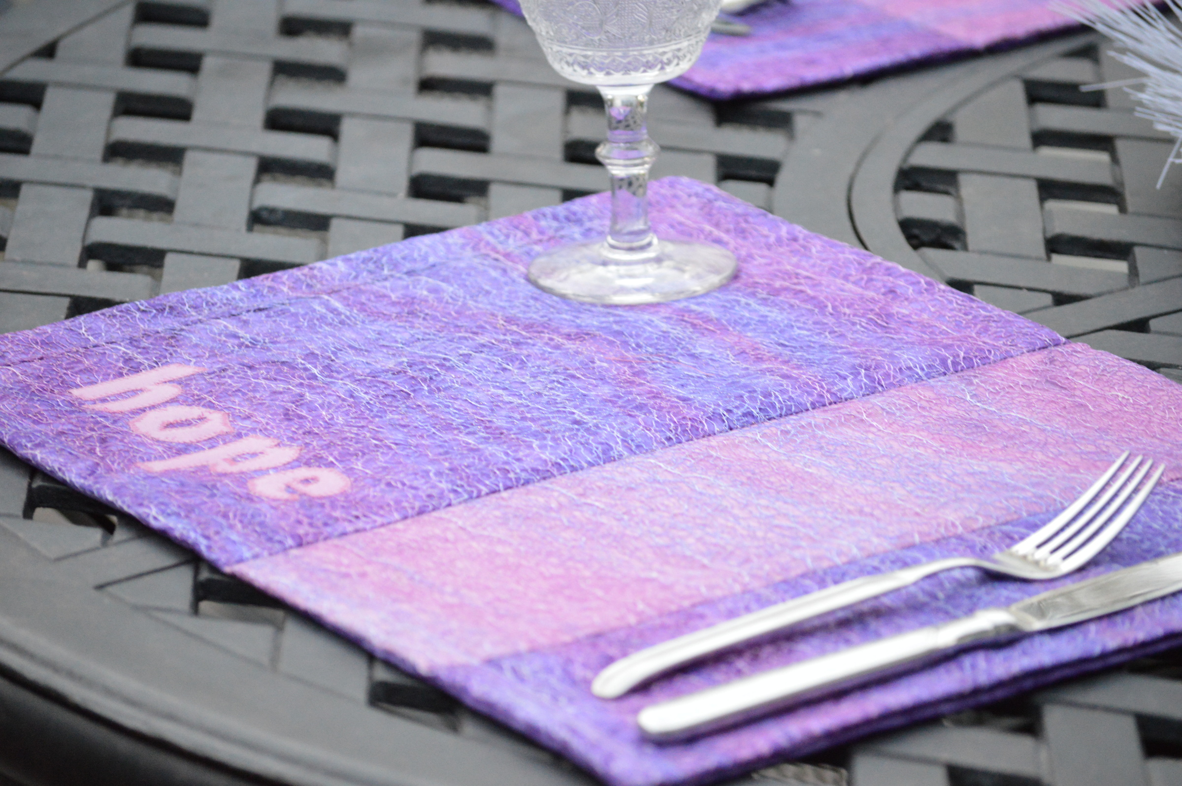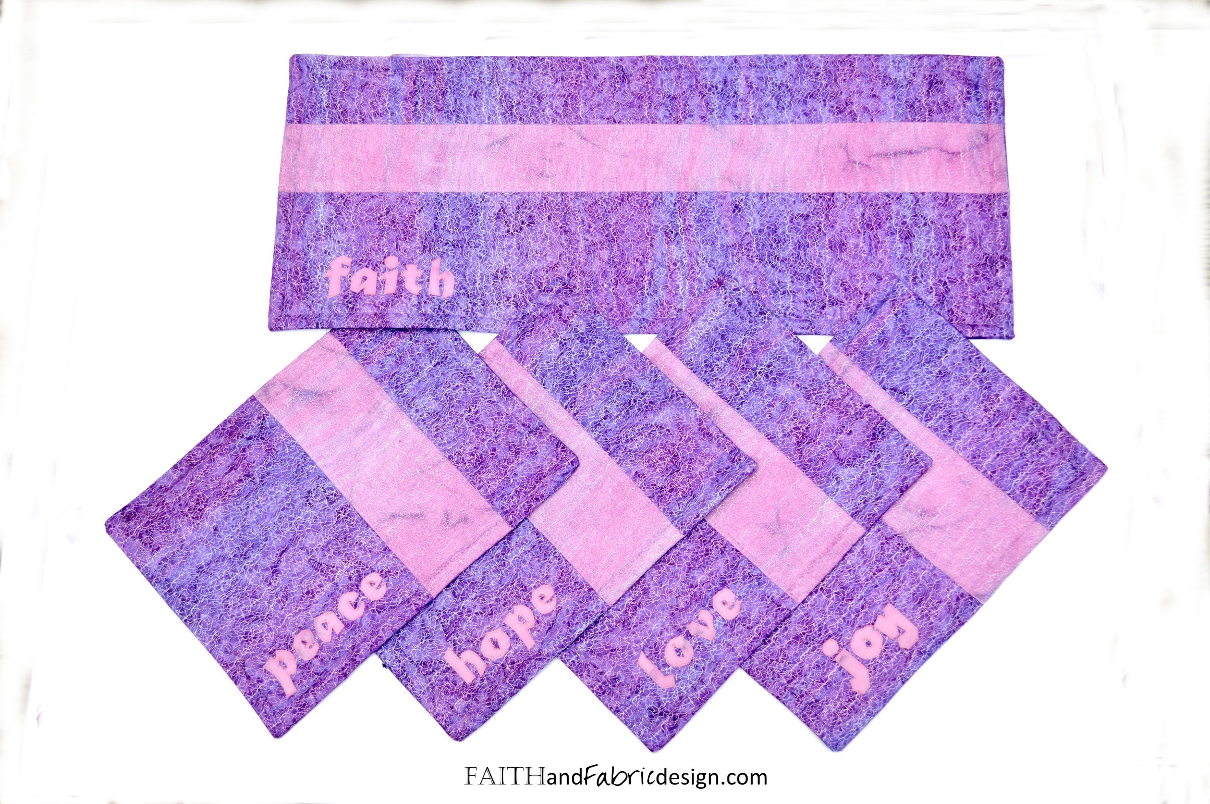 This elegant placemat and table runner set is the perfect way to decorate during the Advent season. The simple lines reflect the four candles in the Advent wreath – two purple, one pink, and one purple. The ombre glitter top layer adds just a touch of sparkle, hinting of Christmas to come. See our website for additional photos and inspirations for this pattern and many others.