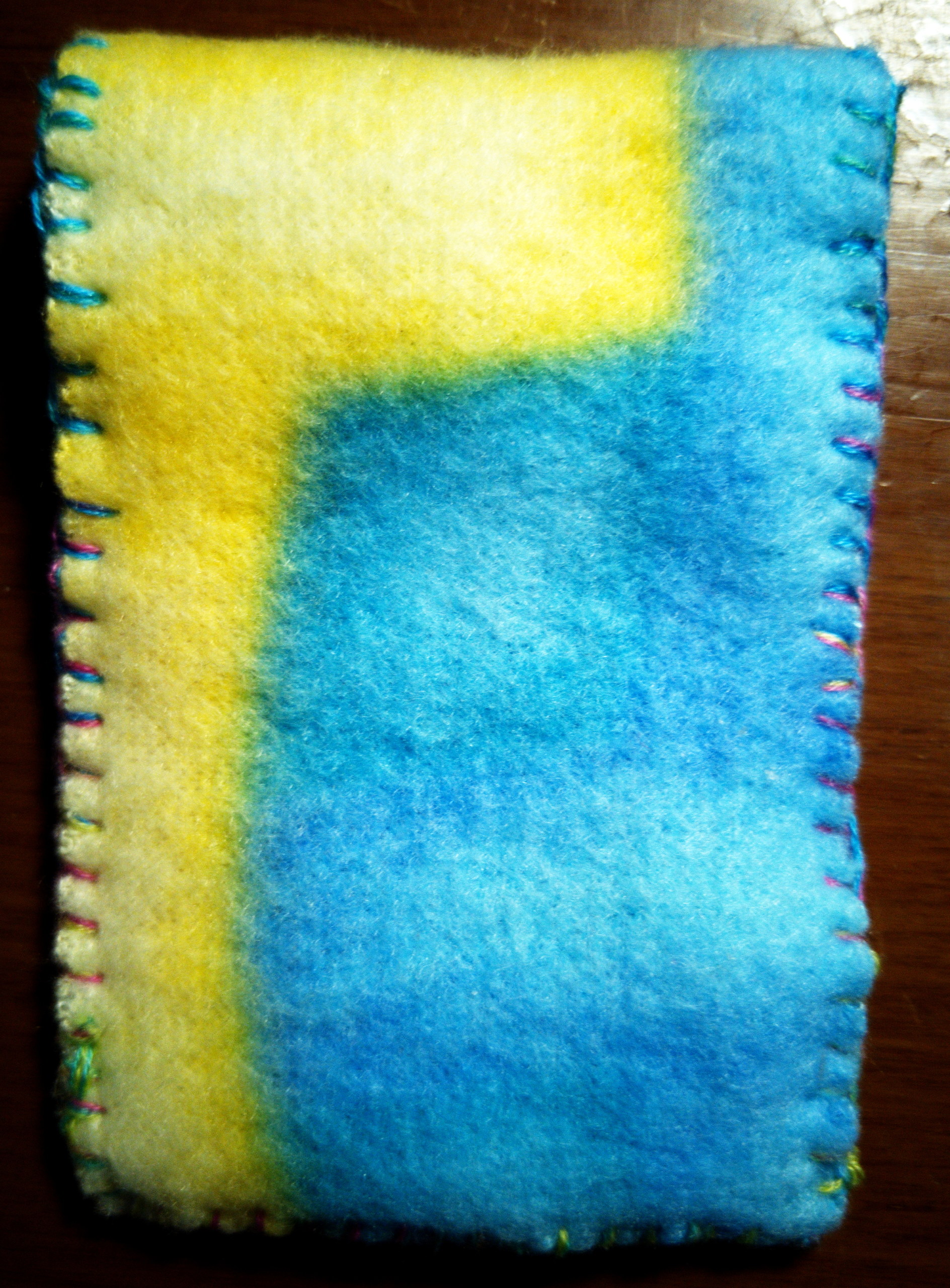 Hand-sewn Rosary case made from fleece with a plastic snap. It has an abstract pattern and measures approximately 2¼ inches wide by 3½ inches tall.