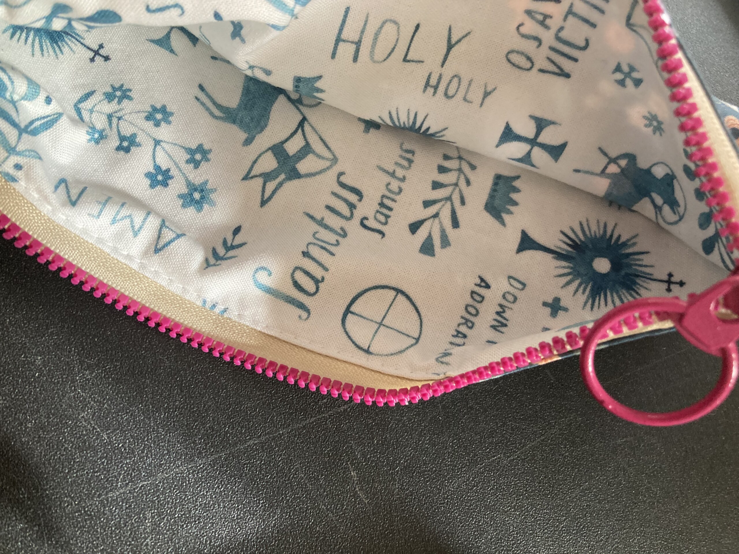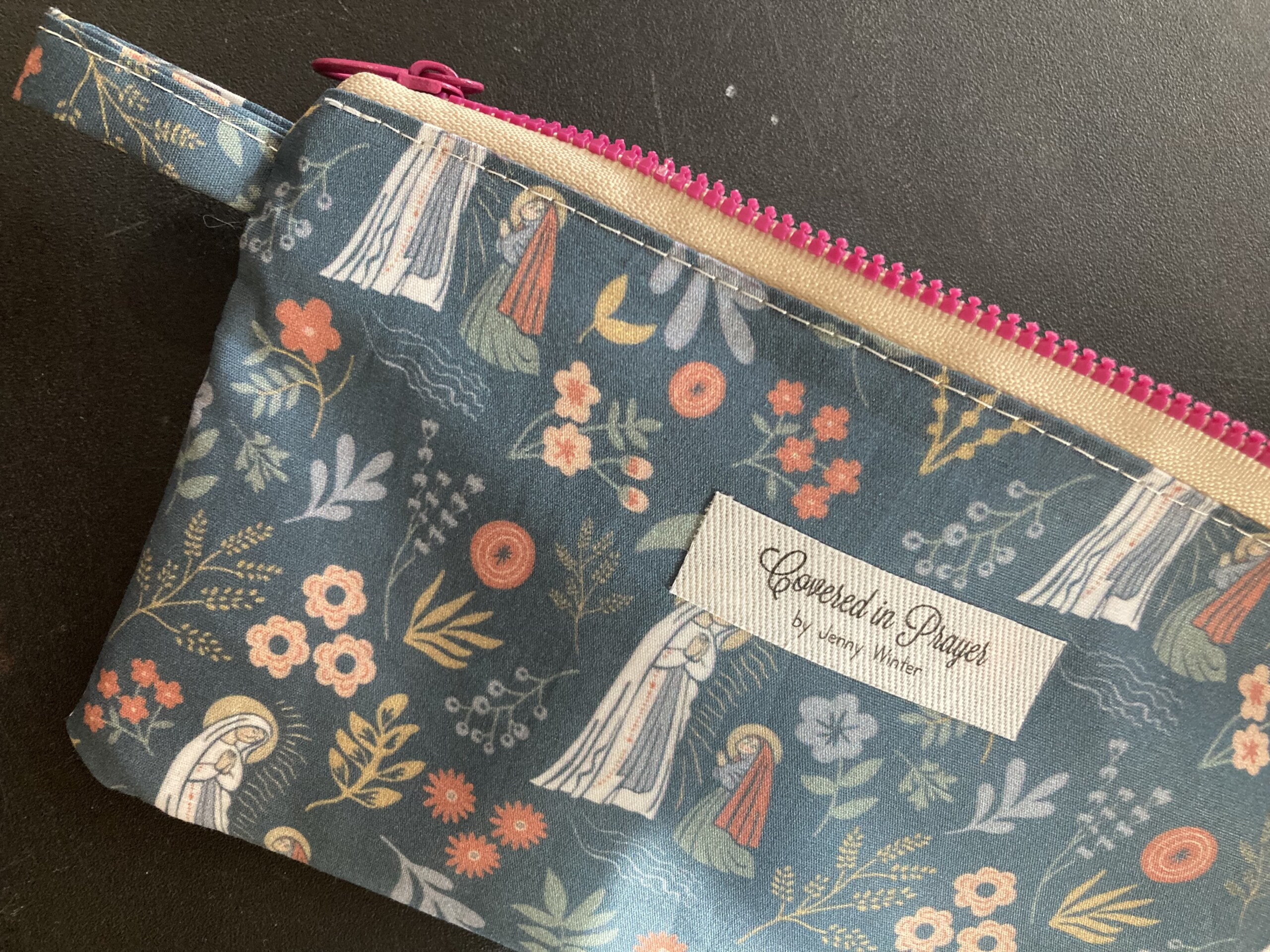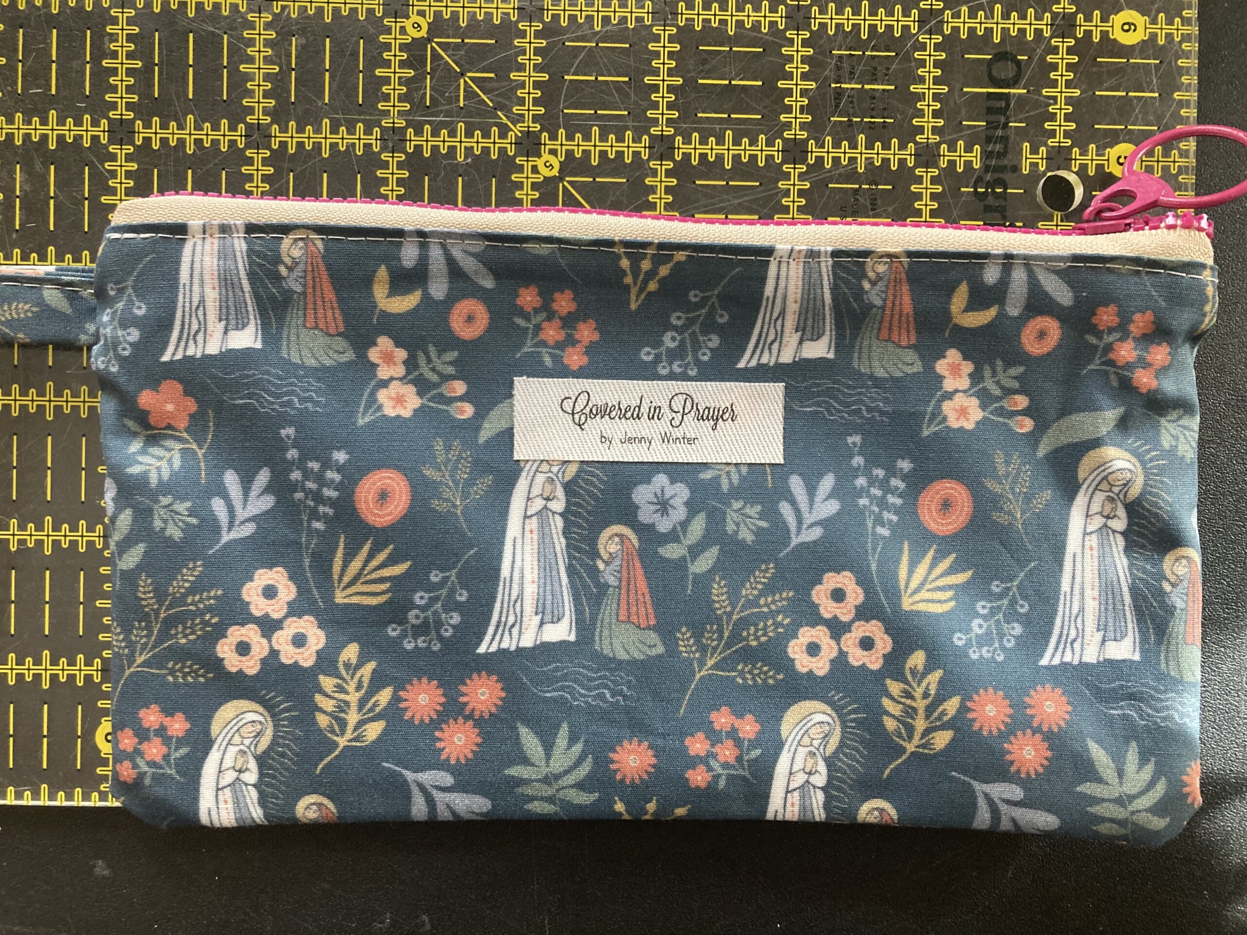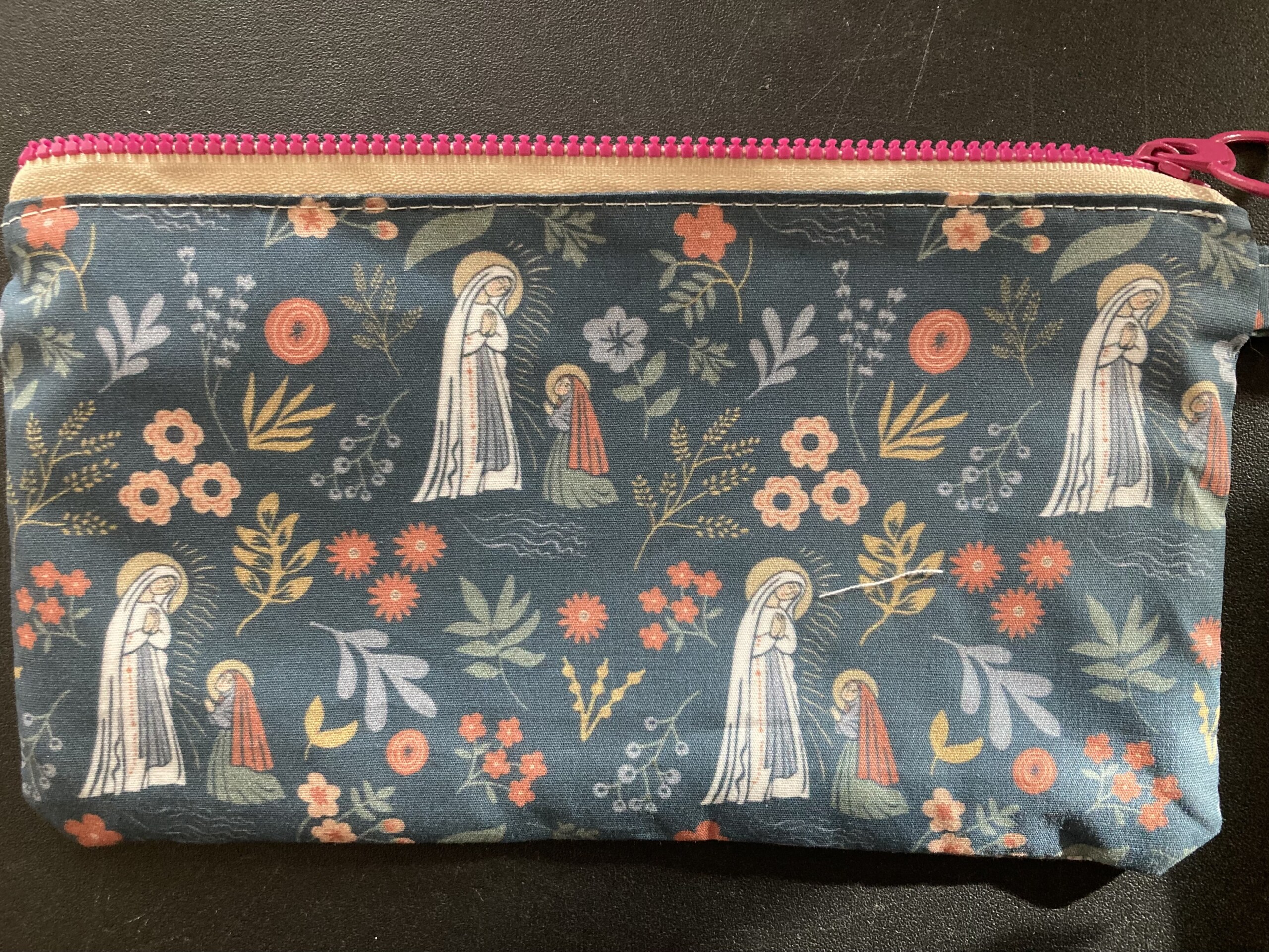 Beautiful Our Lady of Lourdes zipper pouch. Will fit your chapel veil, rosary, prayer cards, or other accessories. Fully lined.