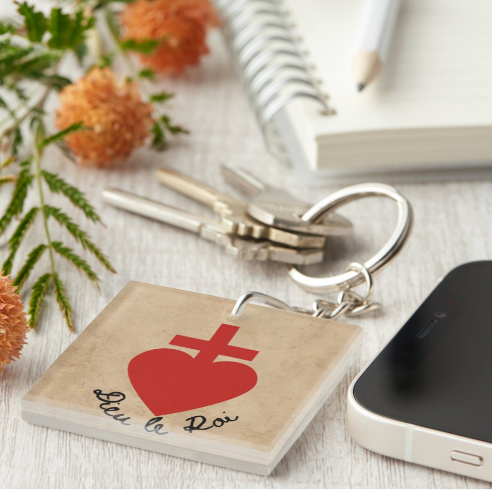 Celebrate your love of the Sacred Heart with this keychain! Front features a Vendeé badge with the French words “God the King” while on the back are written the words “Behold this heart which has so loved the world.”