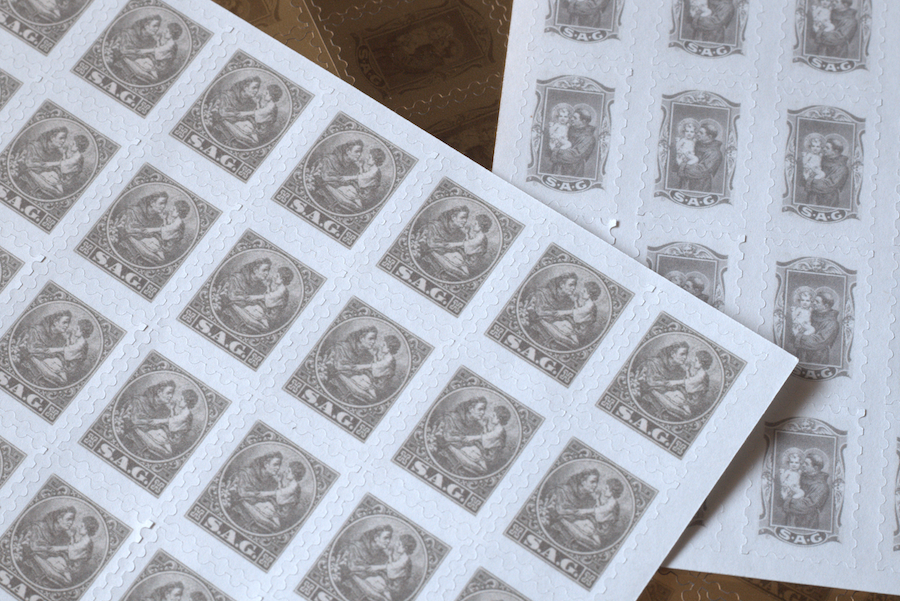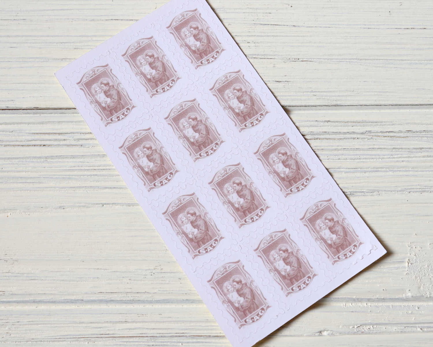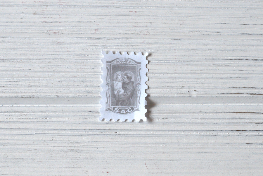 – this story led to the custom of placing “S.A.G.” on mail and praying that St. Anthony give it safe passage- these stamps are sized: 3cm x 2.5cm or approx. 1.in x 0.8in