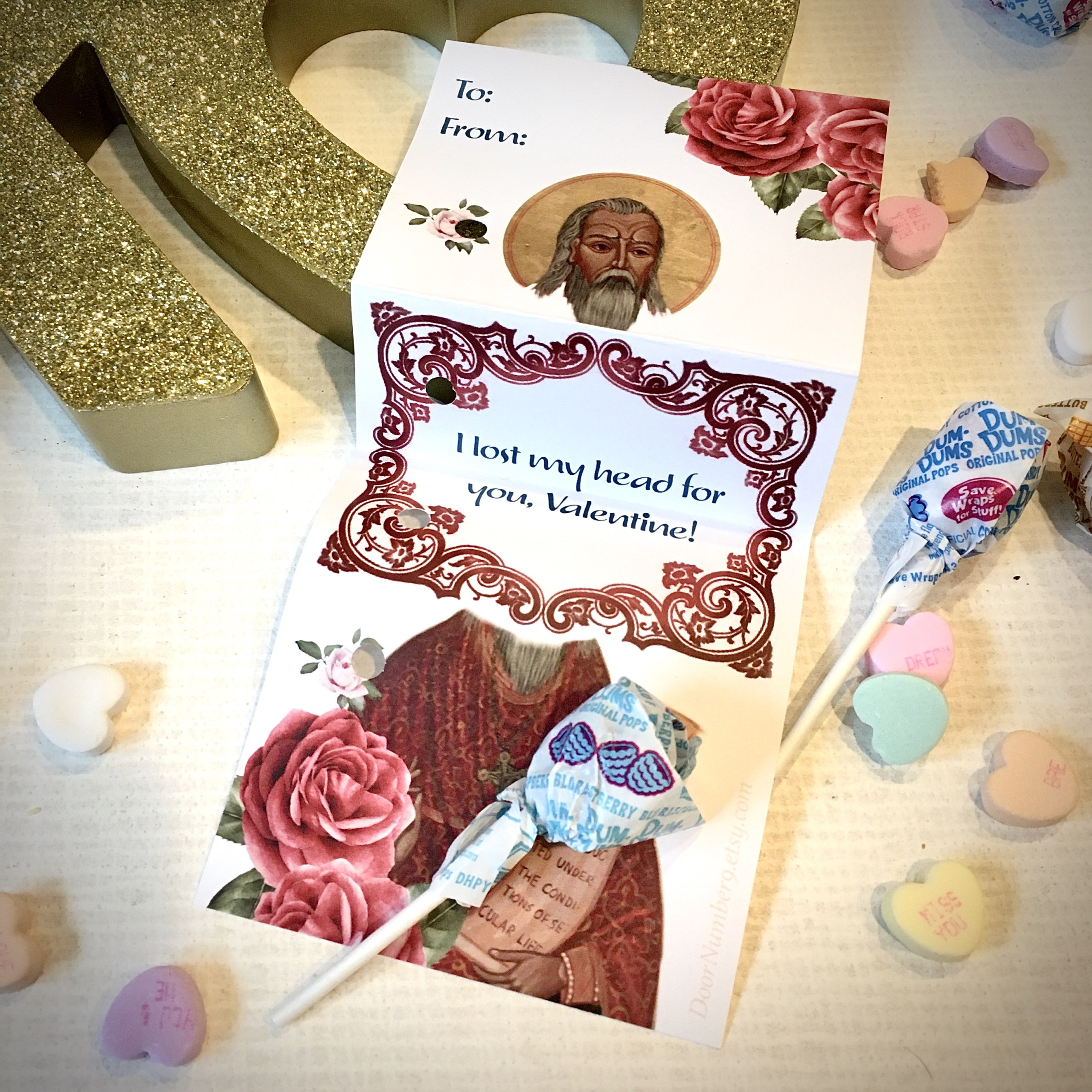 Pulling apart the folded card separates St. Valentine’s head from his body, and reveals the hidden message: “I lost my head for you, Valentine!”