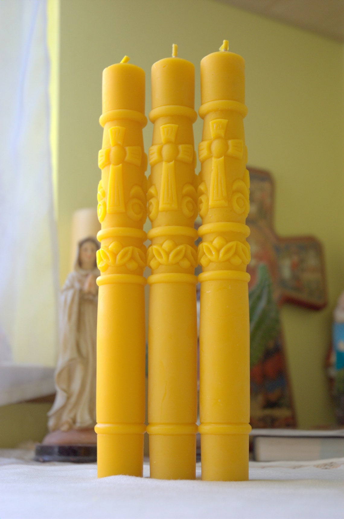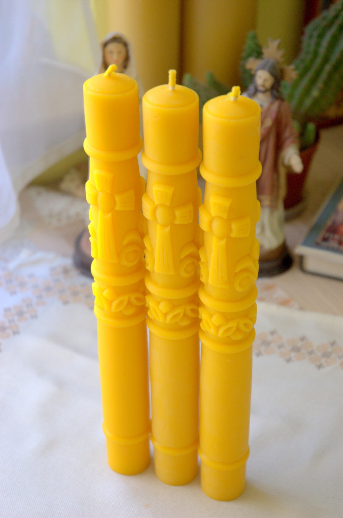 Set consists of 3 long beeswax candles pillars of 11.6”/1.37” = 29.5/3.5cm