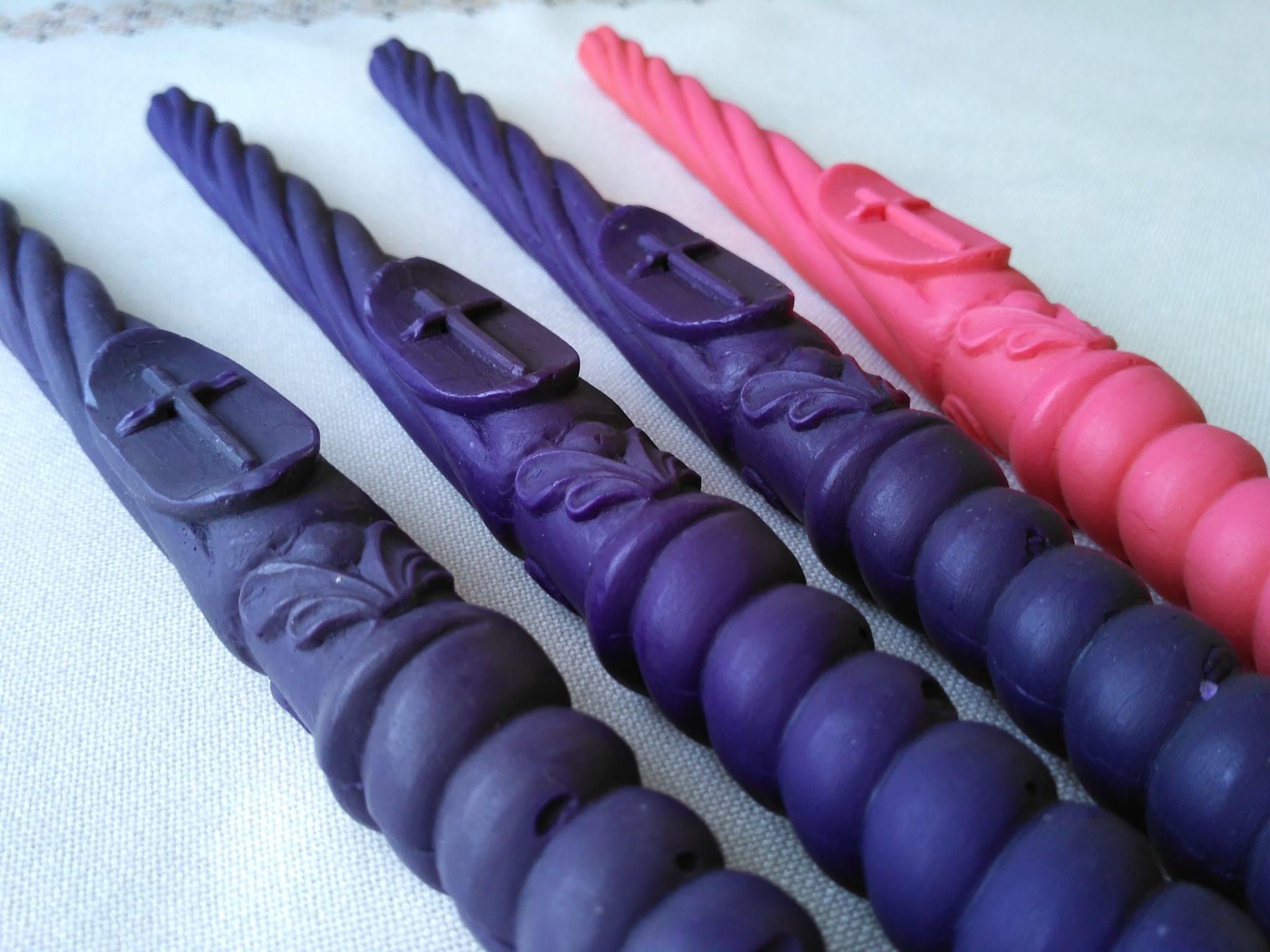 Set consists of 4 Advent beeswax taper candles – (3) purple and (1) pink.