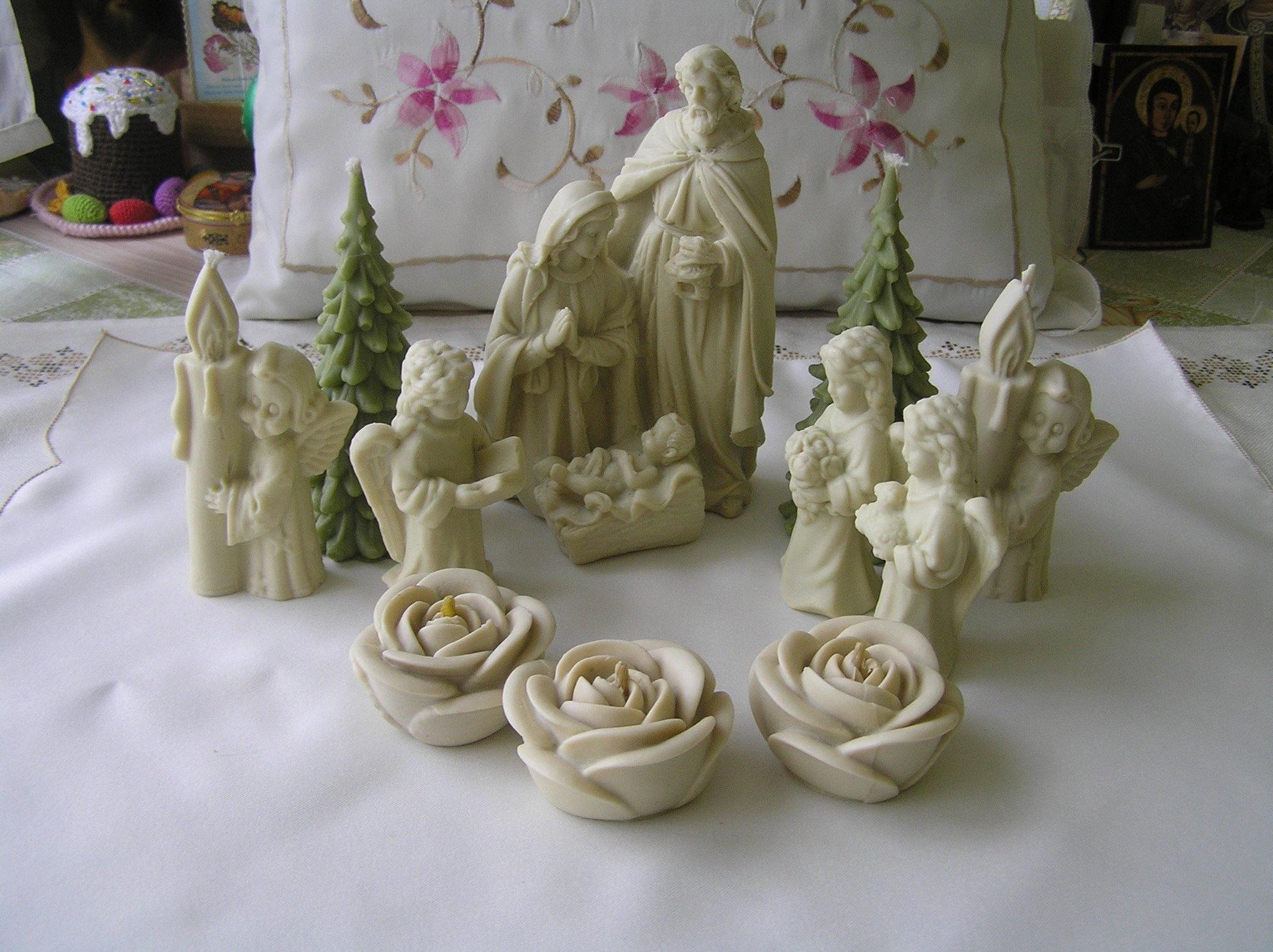 Nativity set consists of 9 pure beeswax items.-1 Nativity statue, 3 angels statues,3 candles roses,2 Christmas tree candles.