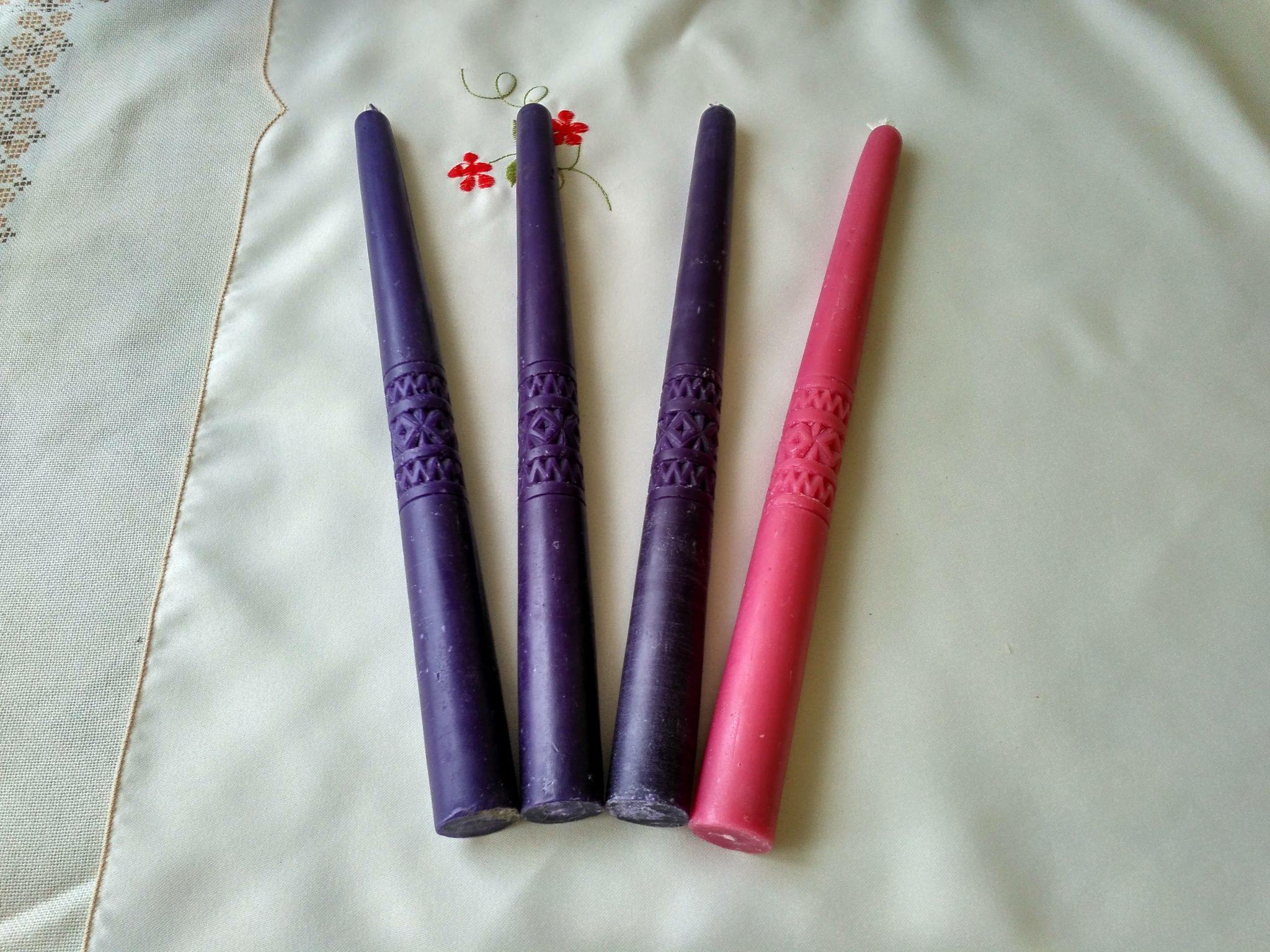 Set consists of 4 Advent beeswax taper candles- (3)- purple,(1)- pink