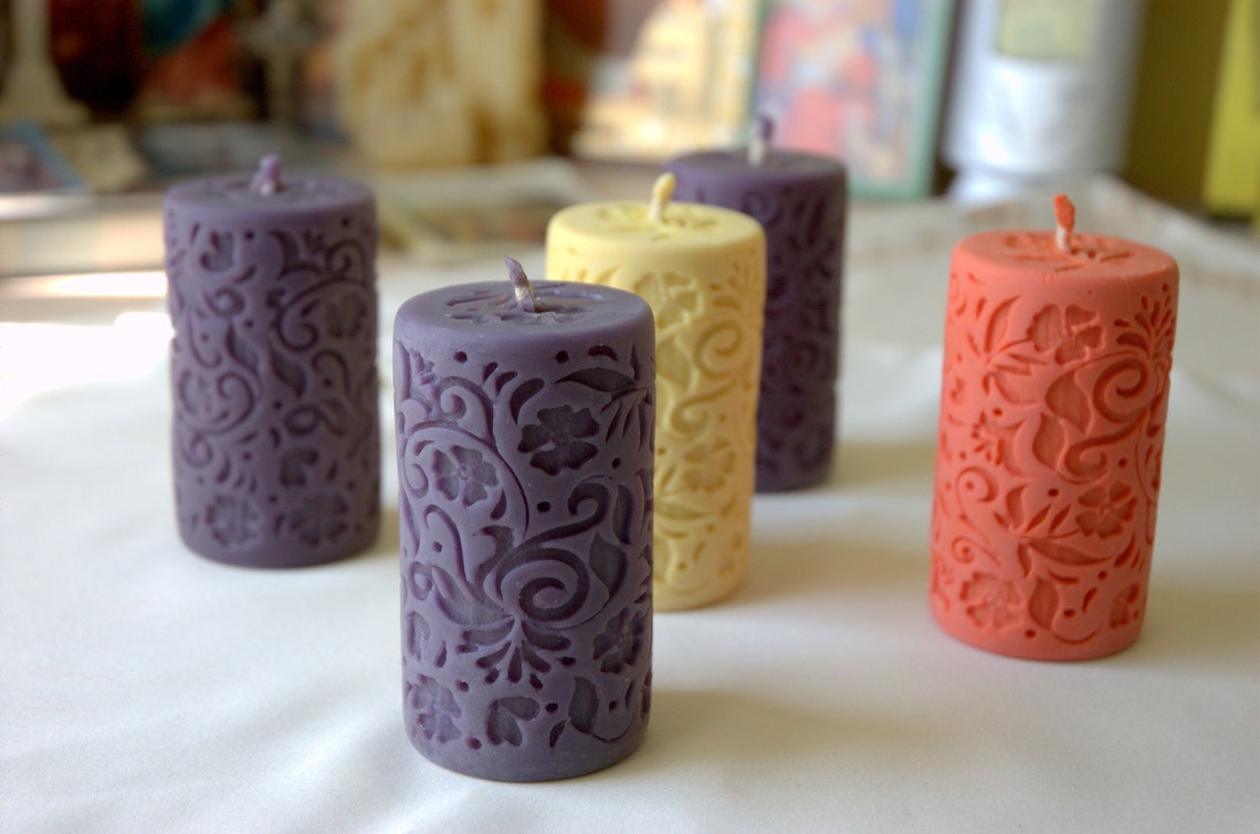 Set consists of 5 Advent beeswax pillar candles.Each candle is 3.3”/1.9”=8.5/5cm.