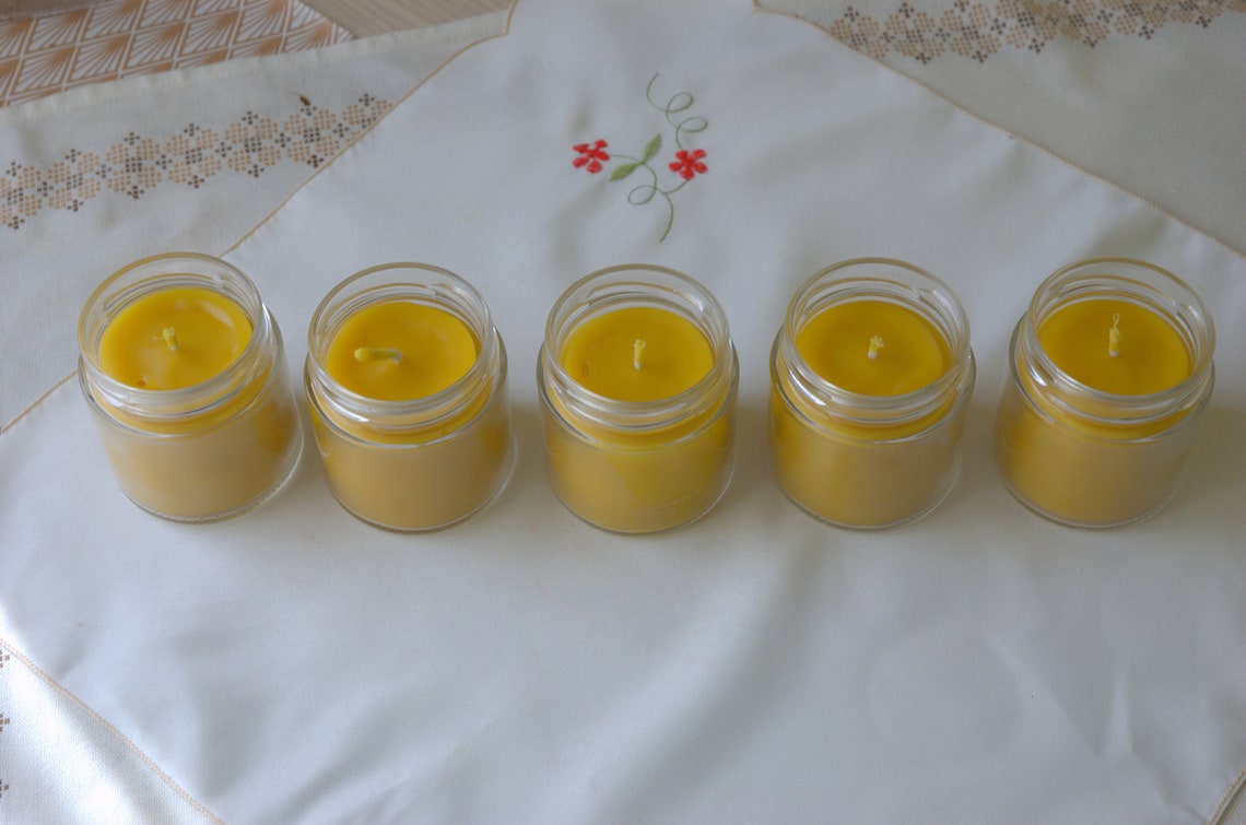 Set consists of 5 glass beeswax candles infused with chrism oil.
