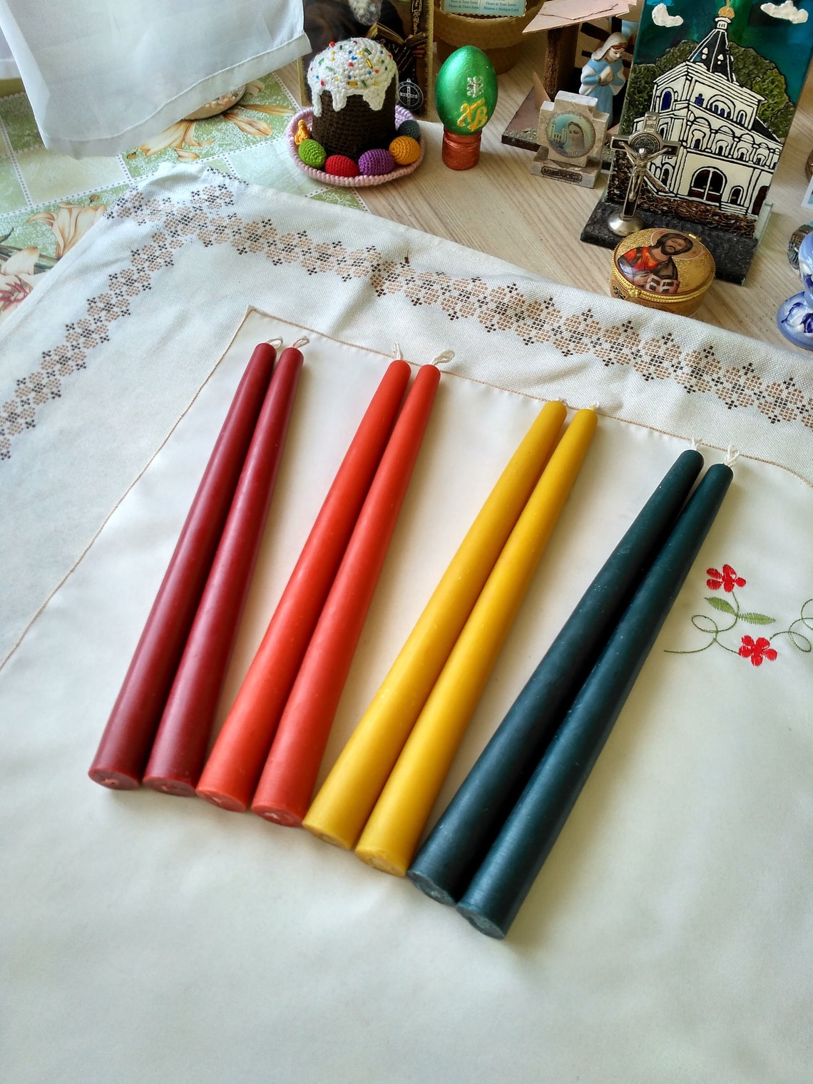 Set consists of 8 beeswax taper candles with 4 different colours (yellow – natural one, coral, cherry red , green)