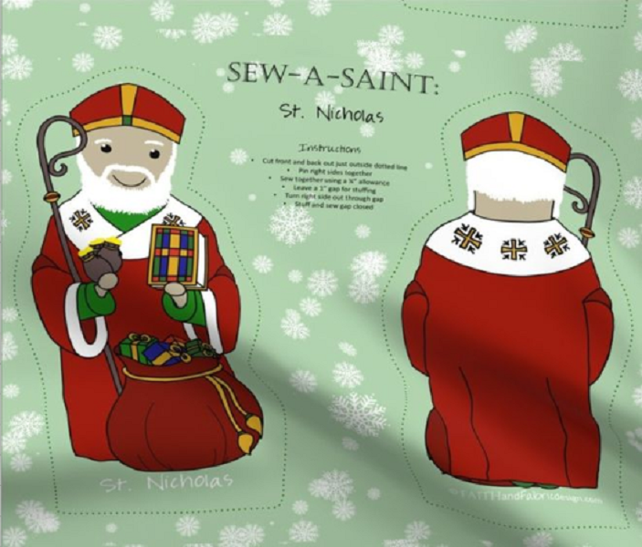 In this Sew-a-Saint, Saint Nicholas comes with a bag of toys at his feet, a bag of coins in one hand, and his Bishop’s cap, bible, and staff.