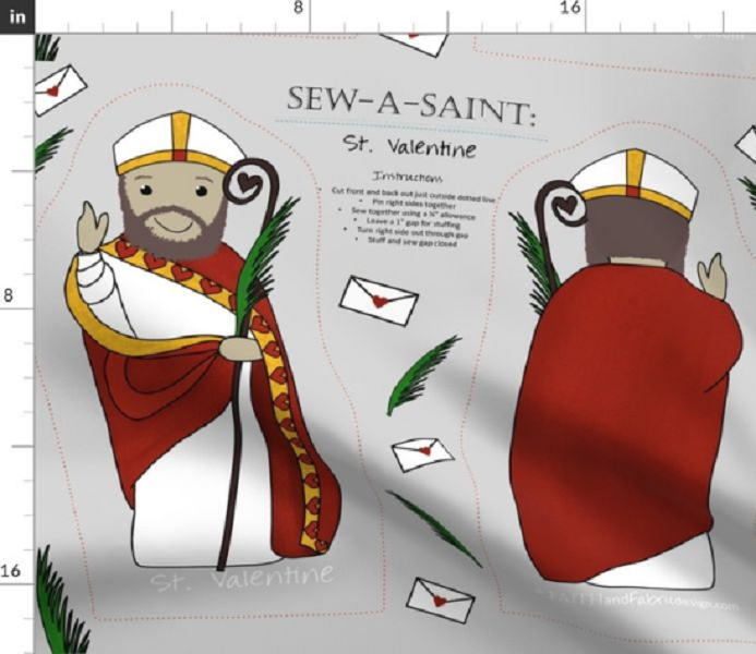 In this Sew-a-Saint, Saint Valentine holds his bishop staff and the palm frond of peace, and offers a blessing over couples in the other raised hand.
