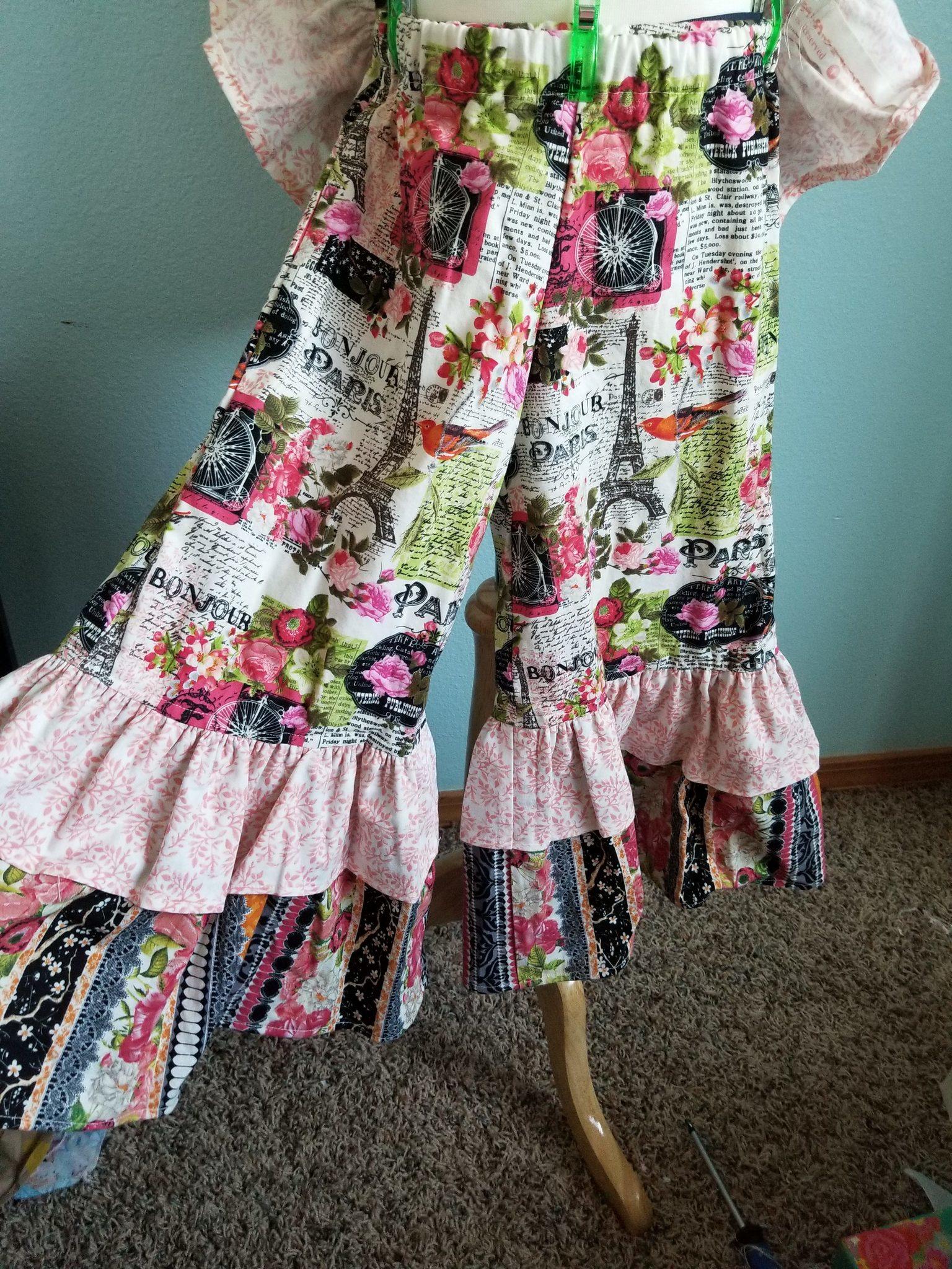 Size 6 ruffle pants and top in a gorgeous Paris themed print in black,cream,coral,orange and hot pink this set is a stunner!